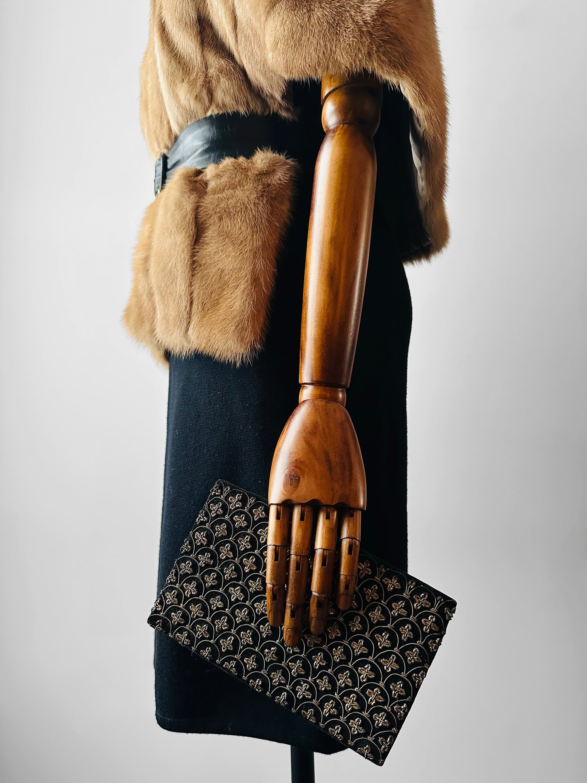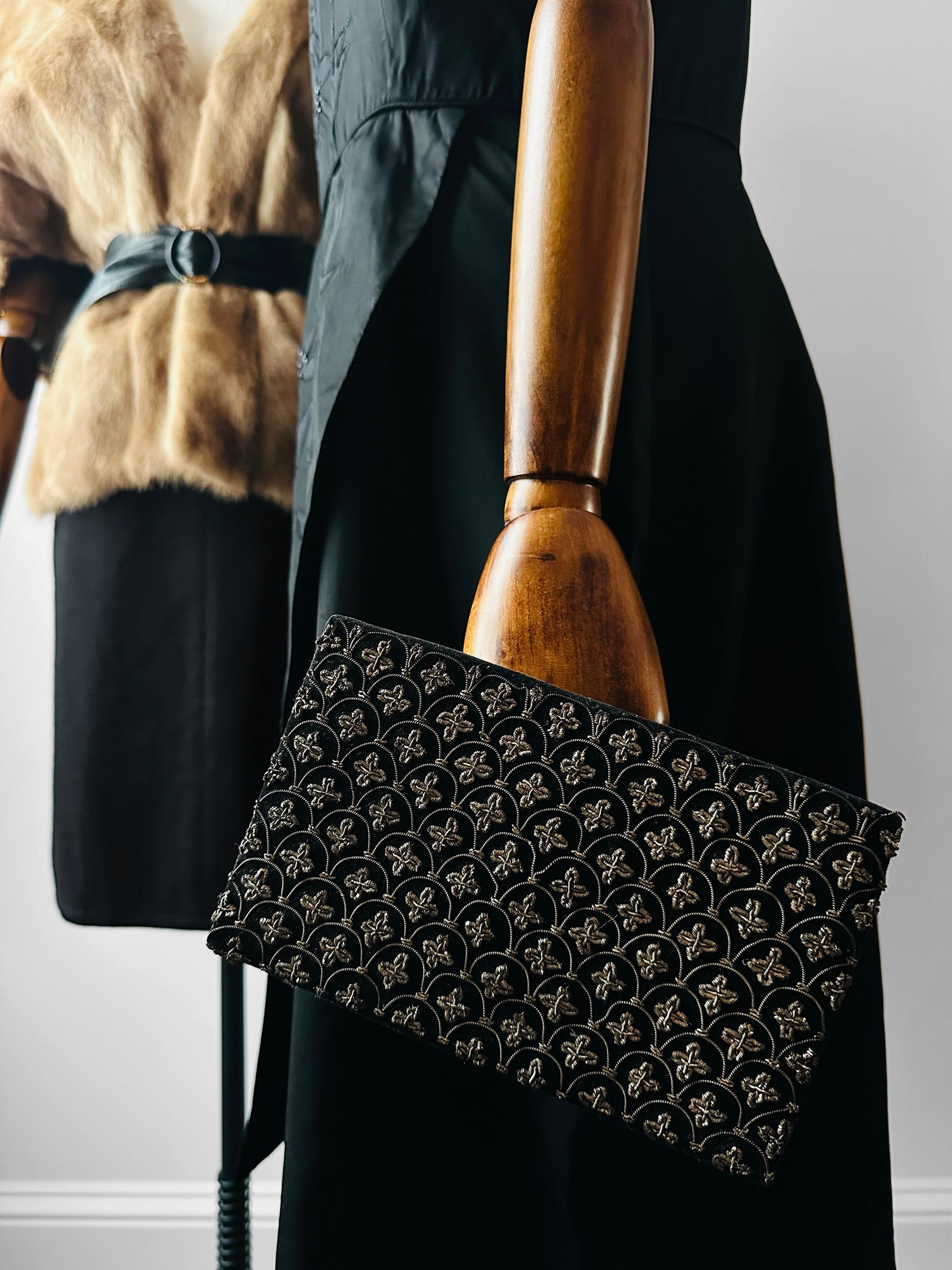 DESCRIPTION: This vintage 1940s–1950s black velvet clutch is the epitome of timeless elegance. Luxuriously soft velvet serves as the backdrop for intricate gold thread embroidery, creating a striking contrast that exudes refinement. Designed as an evening essential, this piece reflects the artistry and opulence of its era—perfect for collectors or anyone seeking a statement accessory for formal occasions. A rare treasure that combines classic style with enduring craftsmanship.