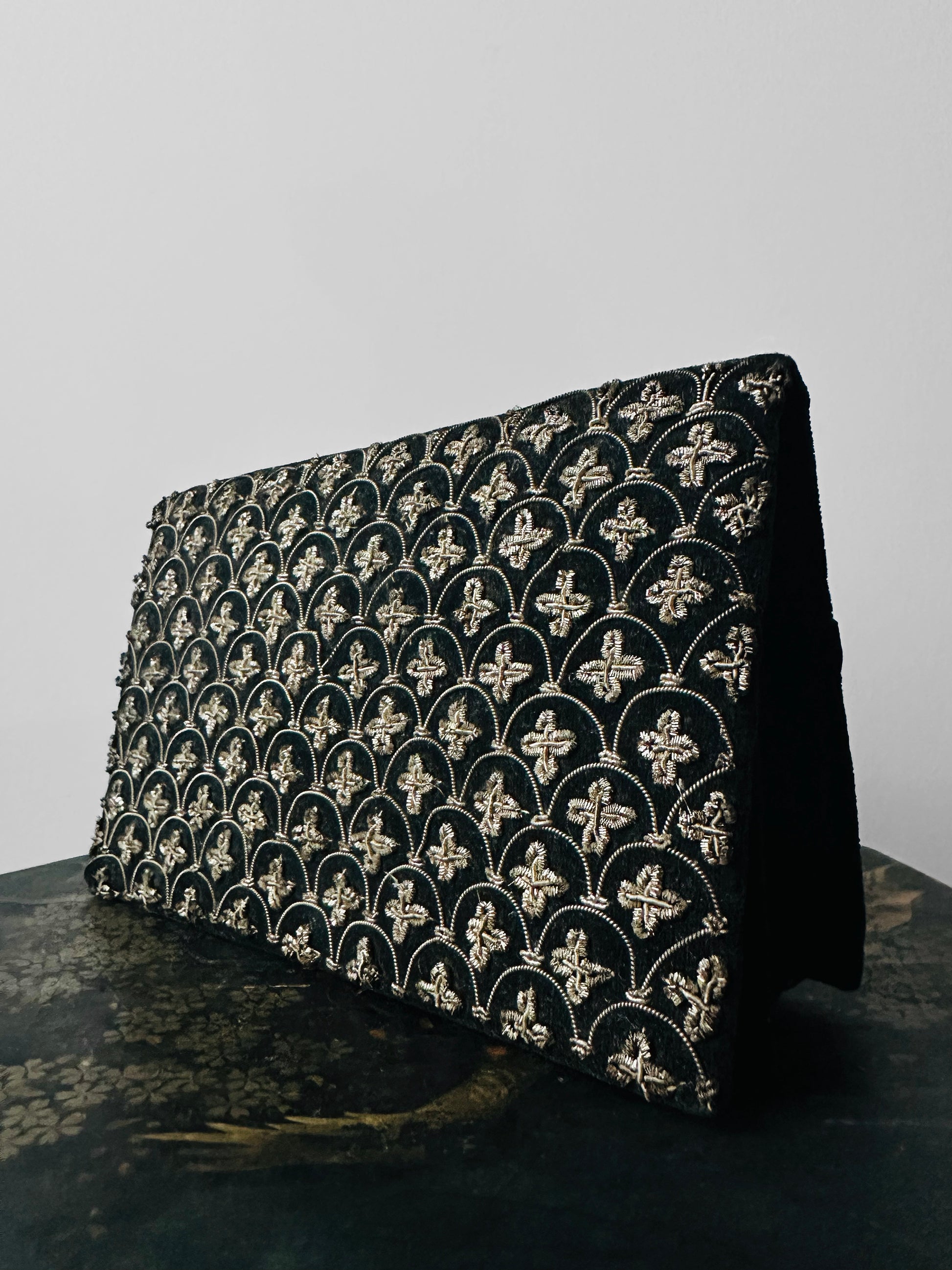 HISTORY: Embroidered velvet purses adorned with metallic threadwork stand as elegant relics of a bygone era, gracing wardrobes from the late 19th century through the mid-20th century. These opulent accessories were more than mere evening bags—they served as emblems of refinement and social stature. Each piece bore intricate hand-embroidered designs, often inspired by cultural motifs and executed with exceptional skill, ensuring that no two were alike. The shimmering interplay of velvet and metallic threads captured the spirit of luxury and artistry, making these purses coveted treasures.