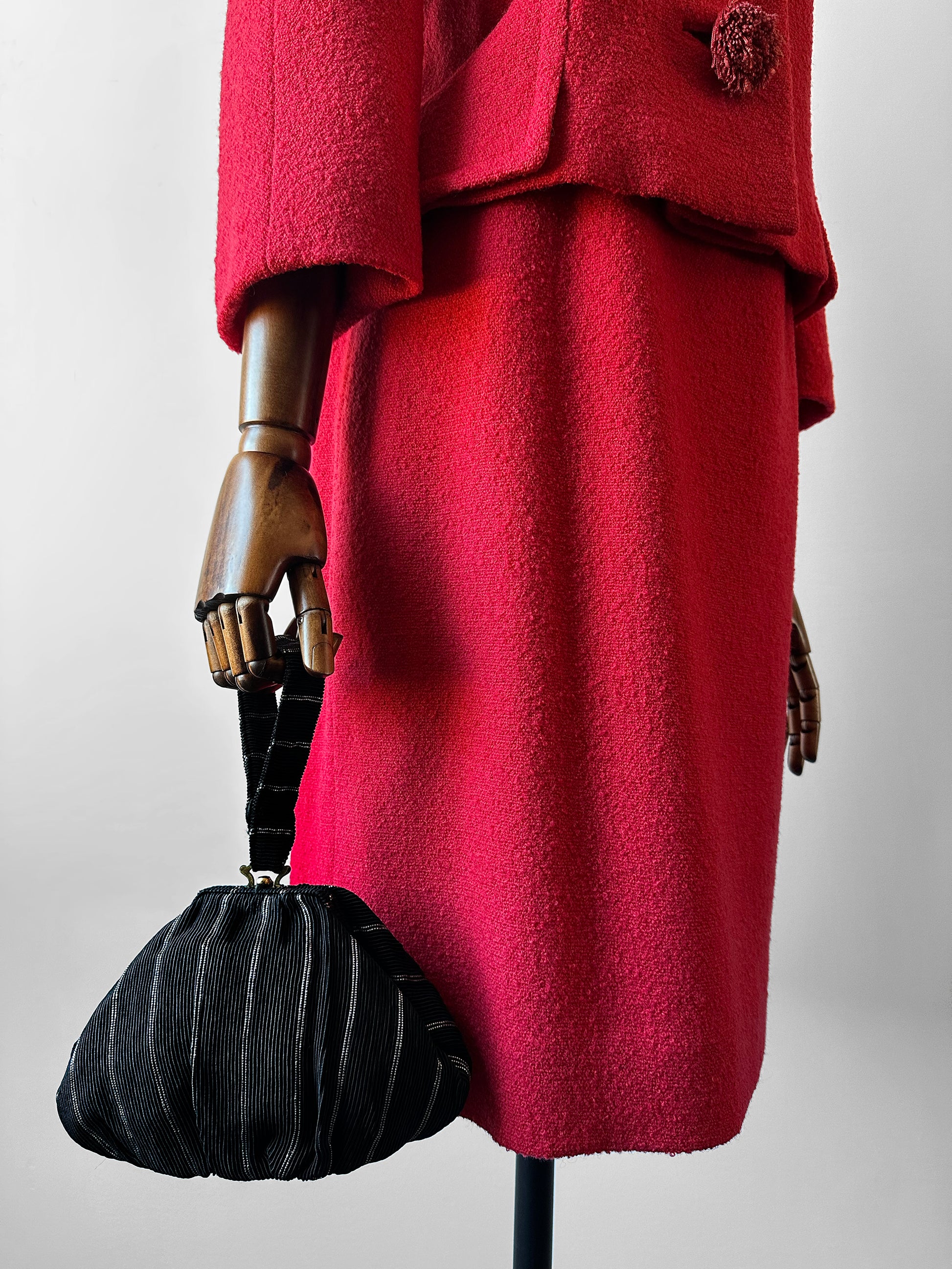 DESCRIPTION: Step into classic sophistication with this stunning 1950s handbag, crafted in a striking black and silver ribbed fabric that exudes mid-century charm. The structured silhouette is complemented by a decorative ribbon handle, adding a touch of refined detail. Inside, you’ll find a secure clasp closure and a matching coin purse—perfect for both style and practicality. Ideal for daywear or semi-formal occasions, this piece captures the era’s balance of elegance and function. A true collectible for vintage lovers and fashion enthusiasts alike.