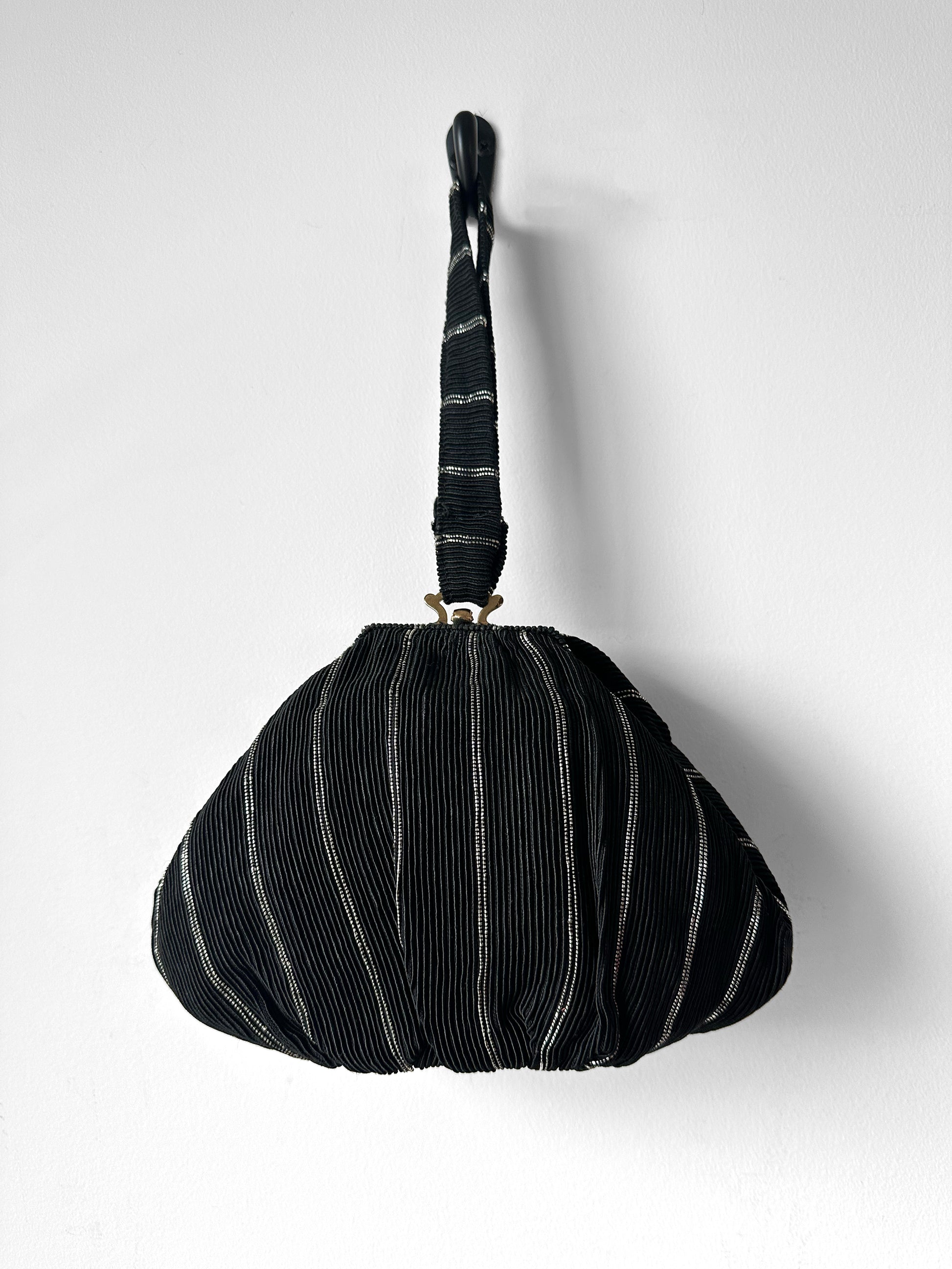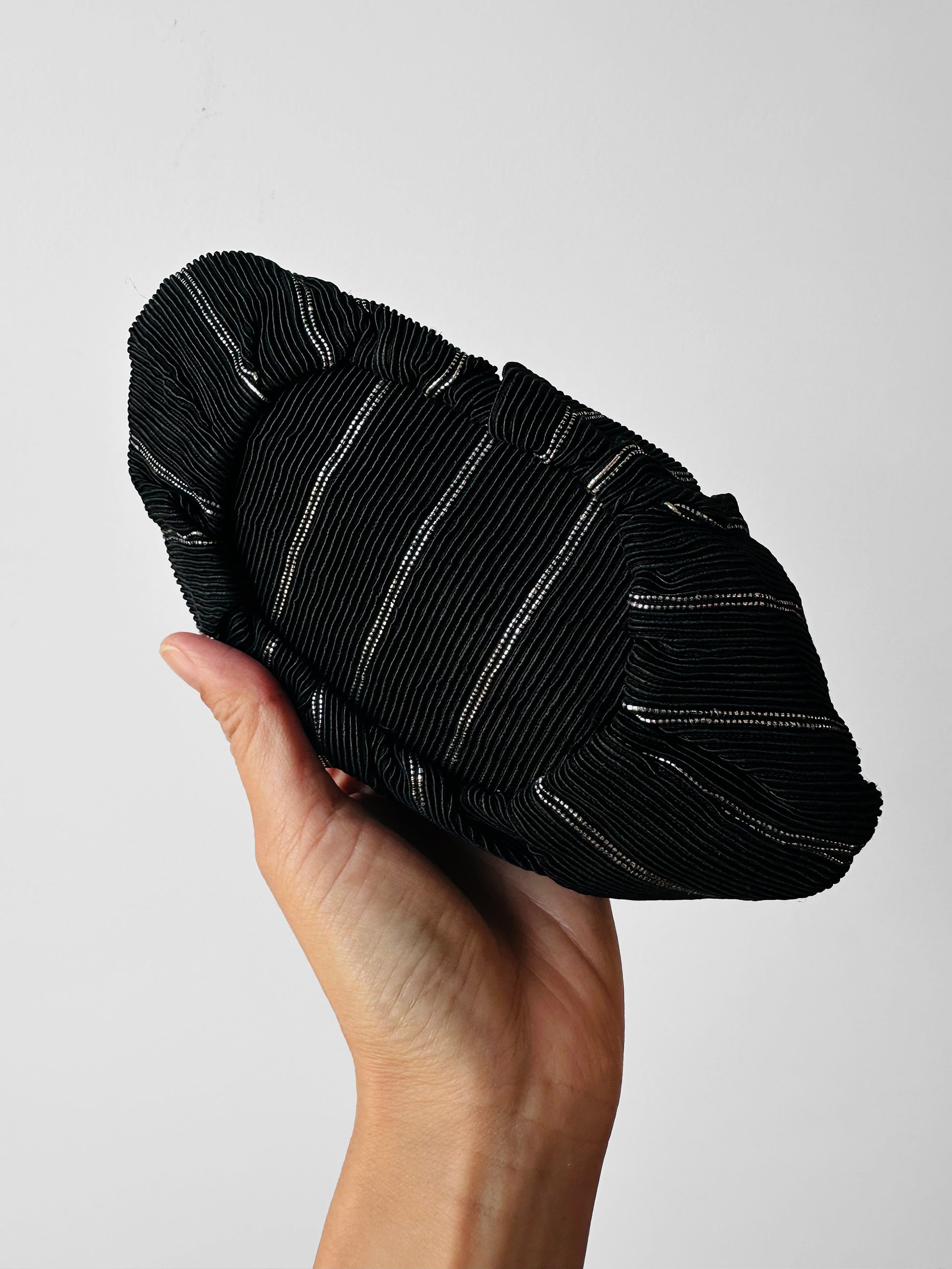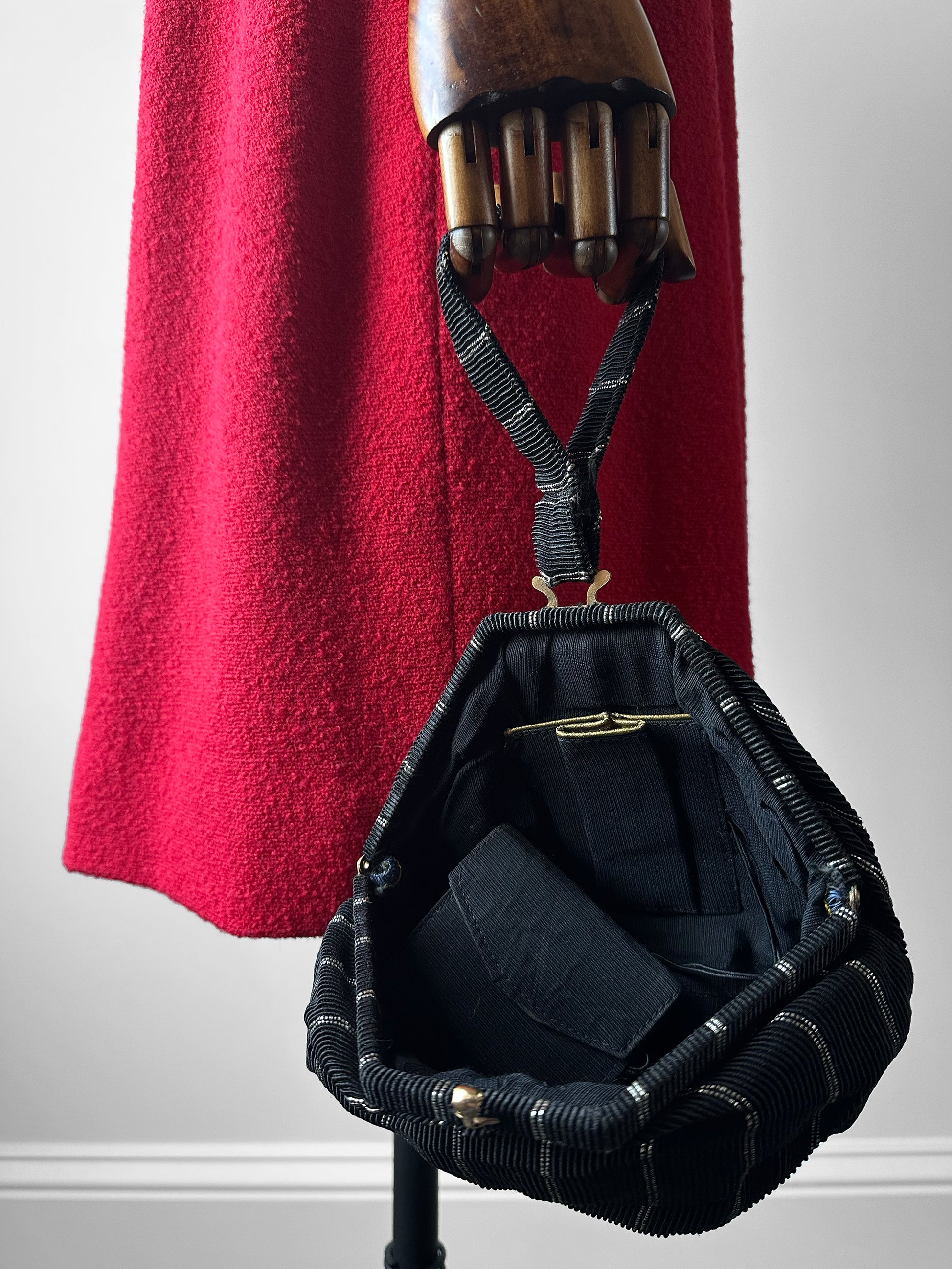 1950s Mid-Century Black Silver Ribbed Fabric Handbag with Coin Purse