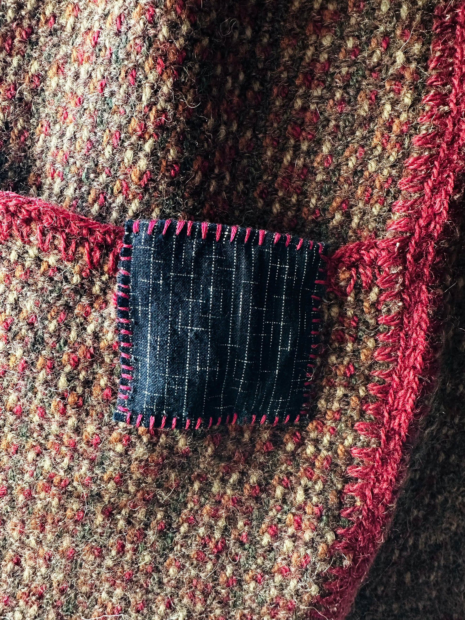 DESCRIPTION: Embrace artisanal charm with this chunky-knit cardigan, a true statement of rustic elegance. Rendered in earthy tones and finished with contrasting trim, it exudes a handcrafted aesthetic that feels both timeless and distinctive. The wooden buttons add a touch of natural sophistication, while the hand-mended details—one pocket patched, the other delicately stitched—tell a story of care and individuality. Warm, durable, and rich in character, this piece is perfect for those who value style with soul.