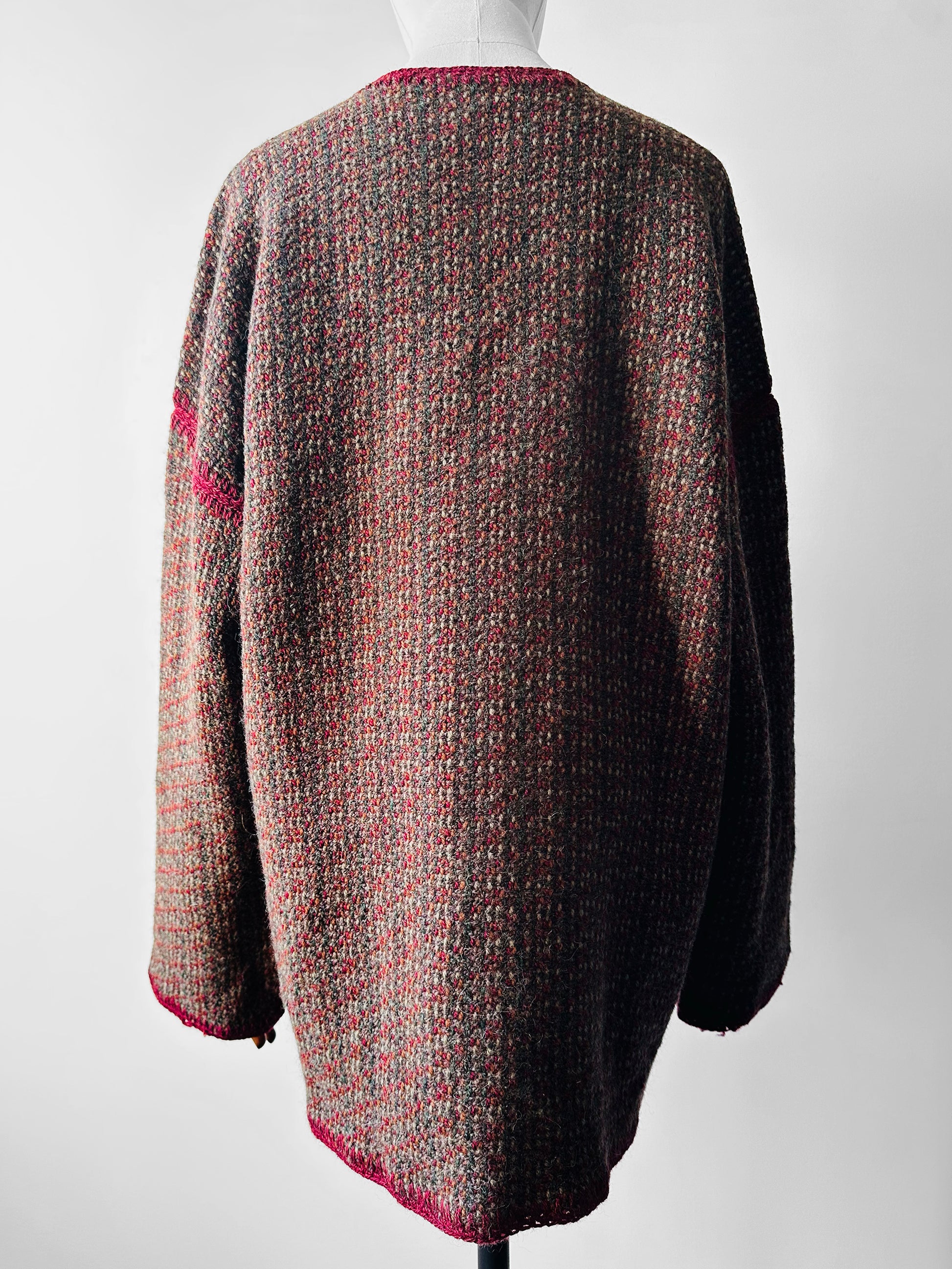 1970s - 1980s Hand-Knit Hand-Mended Wood Button Asymmetrical Cardigan with Maroon Trim - Sz. O/S