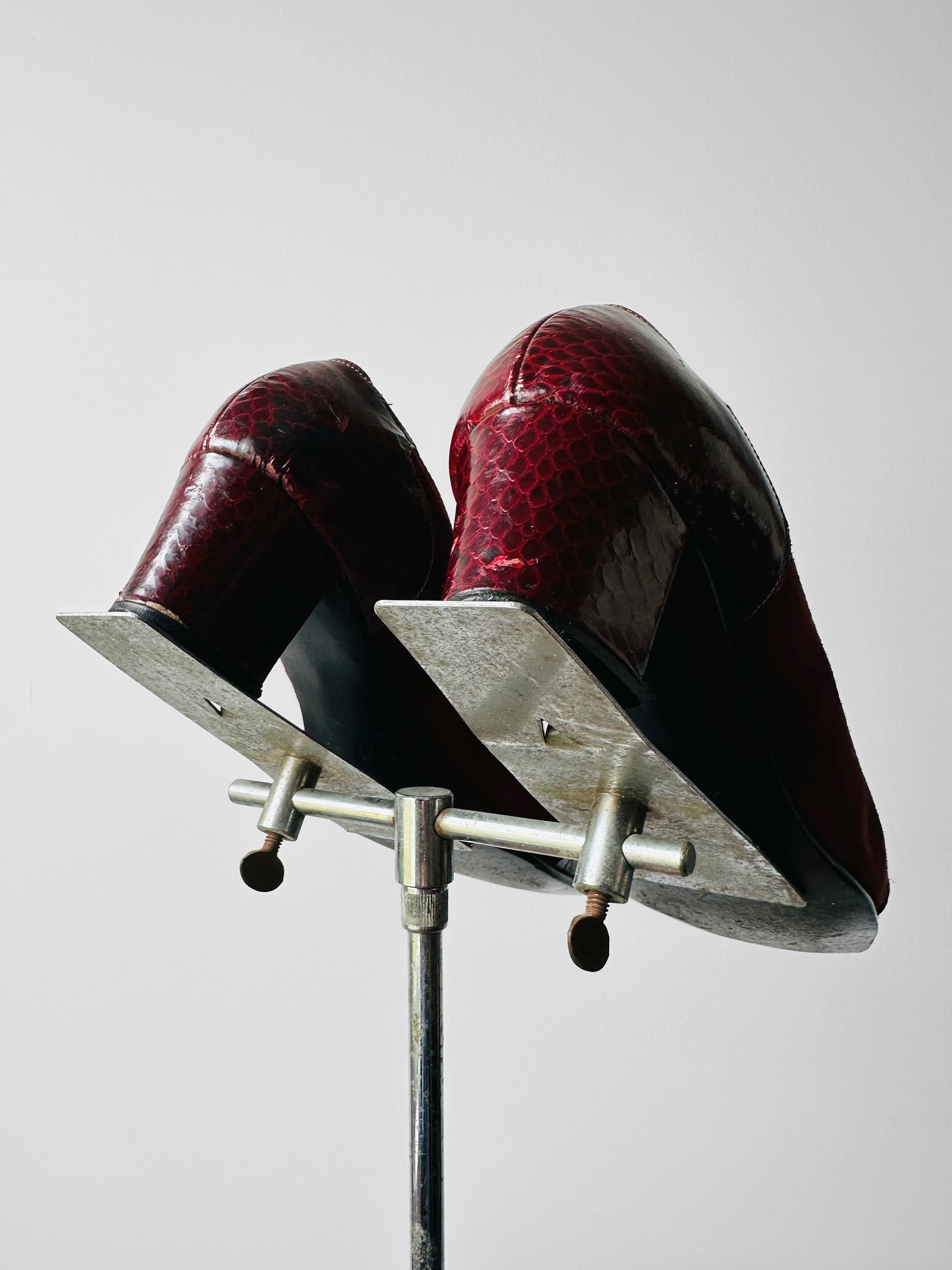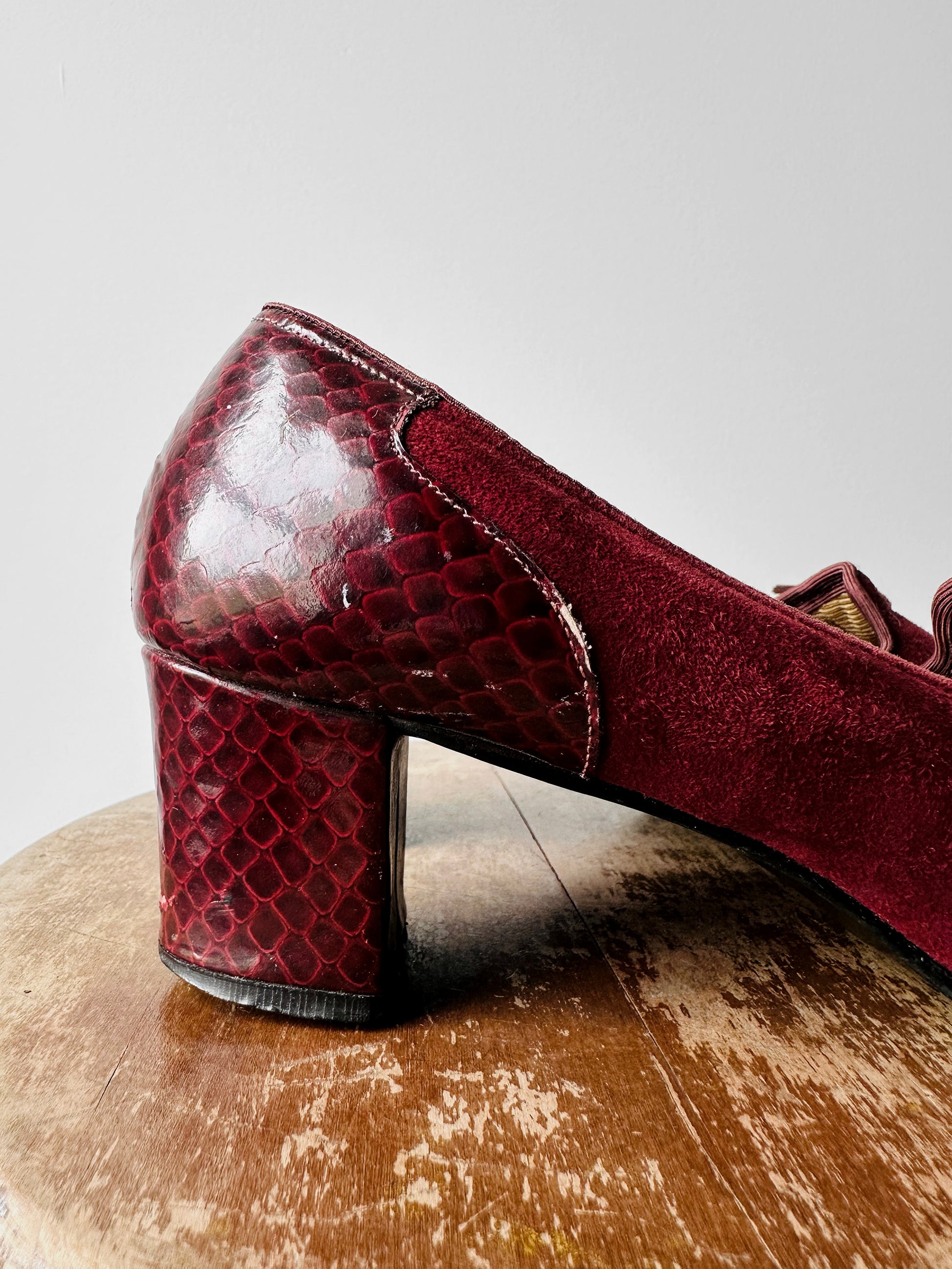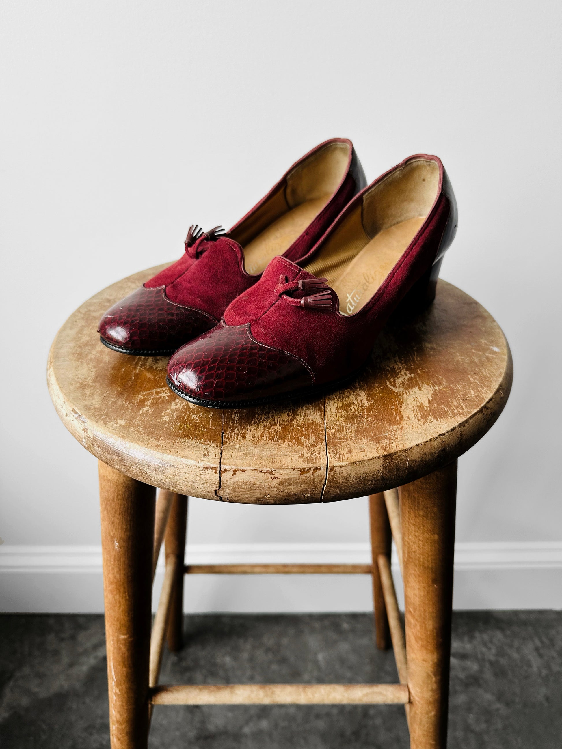 DESCRIPTION: These stunning deep wine and berry red slip-on shoes combine rich suede with patent  leather for a sophisticated, textured look. The tassel detail adds a classic loafer-inspired touch, while the low heel ensures all-day comfort. Perfect for styling with tailored trousers or casual denim, they offer effortless versatility for both relaxed and polished outfits. Crafted with a sturdy block heel for added support.