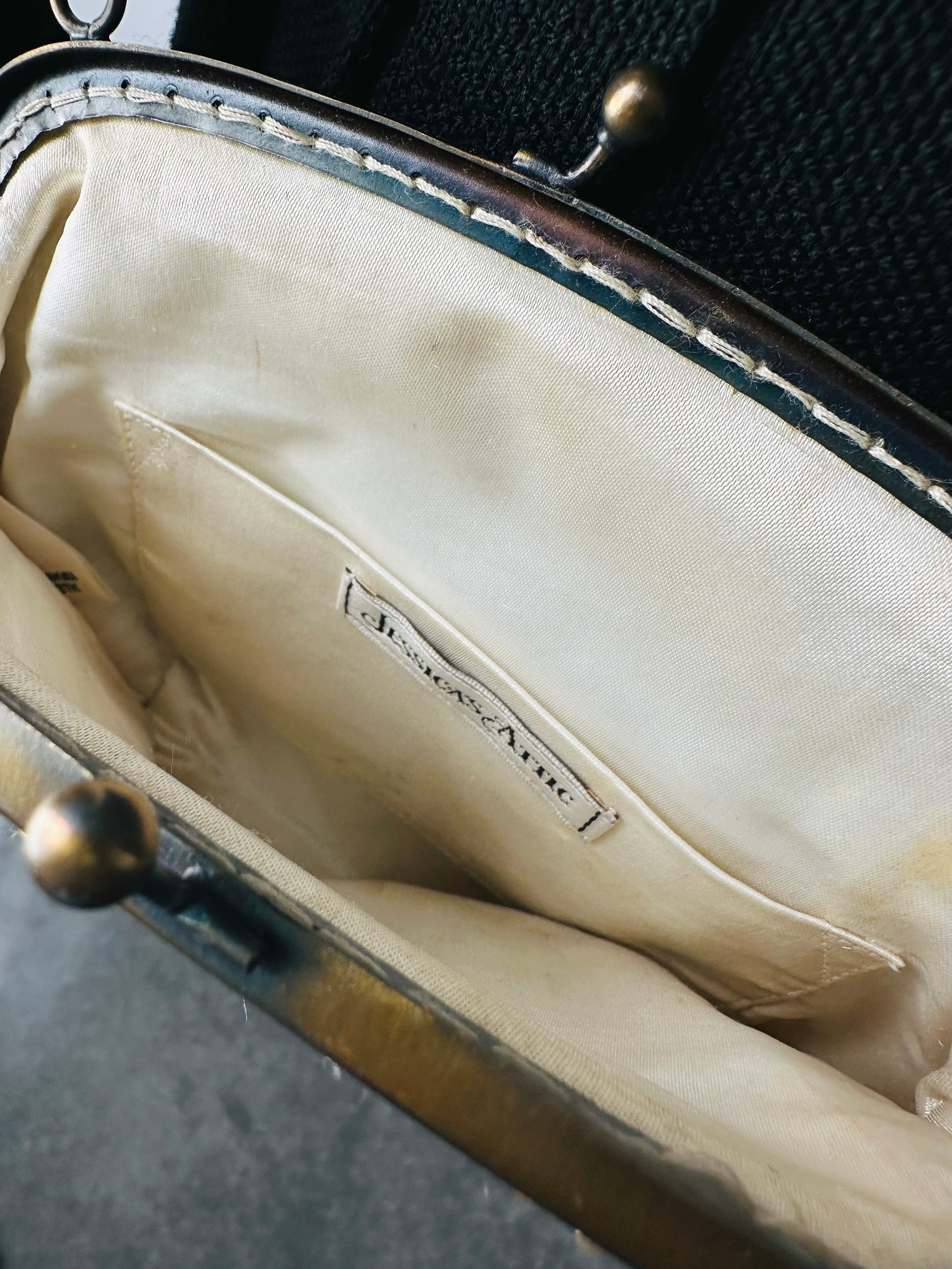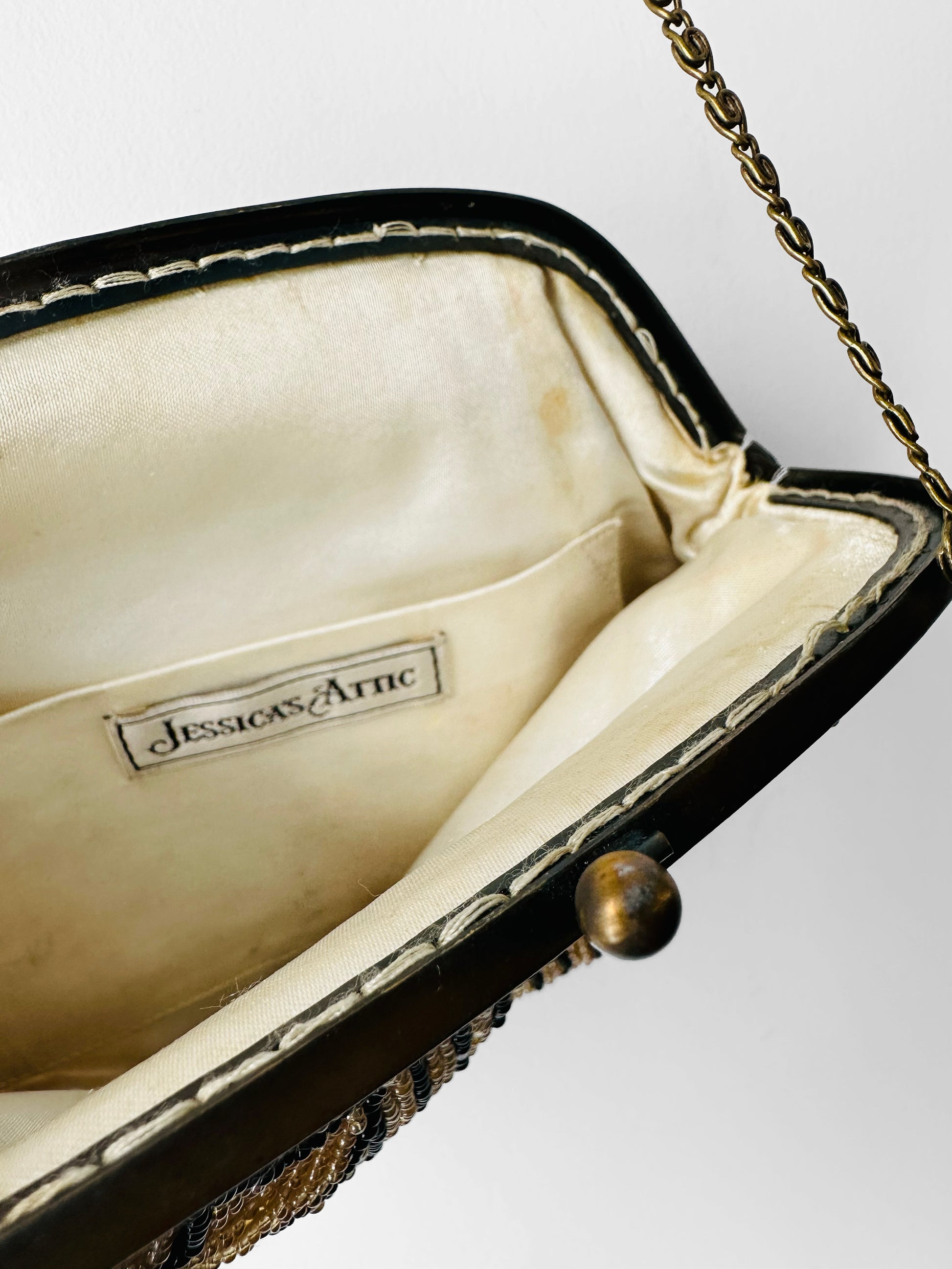 DESCRIPTION: Step back into the glamour of the Jazz Age with this stunning 1980s Art Deco-inspired clutch. Featuring intricate scalloped and geometric beadwork in luxe gold and bold black, this piece is pure sophistication. The classic kiss-lock closure adds a touch of timeless elegance, while the shimmering beads make it a true statement accessory. Perfect for pairing with flapper-style dresses or elevating any formal ensemble.