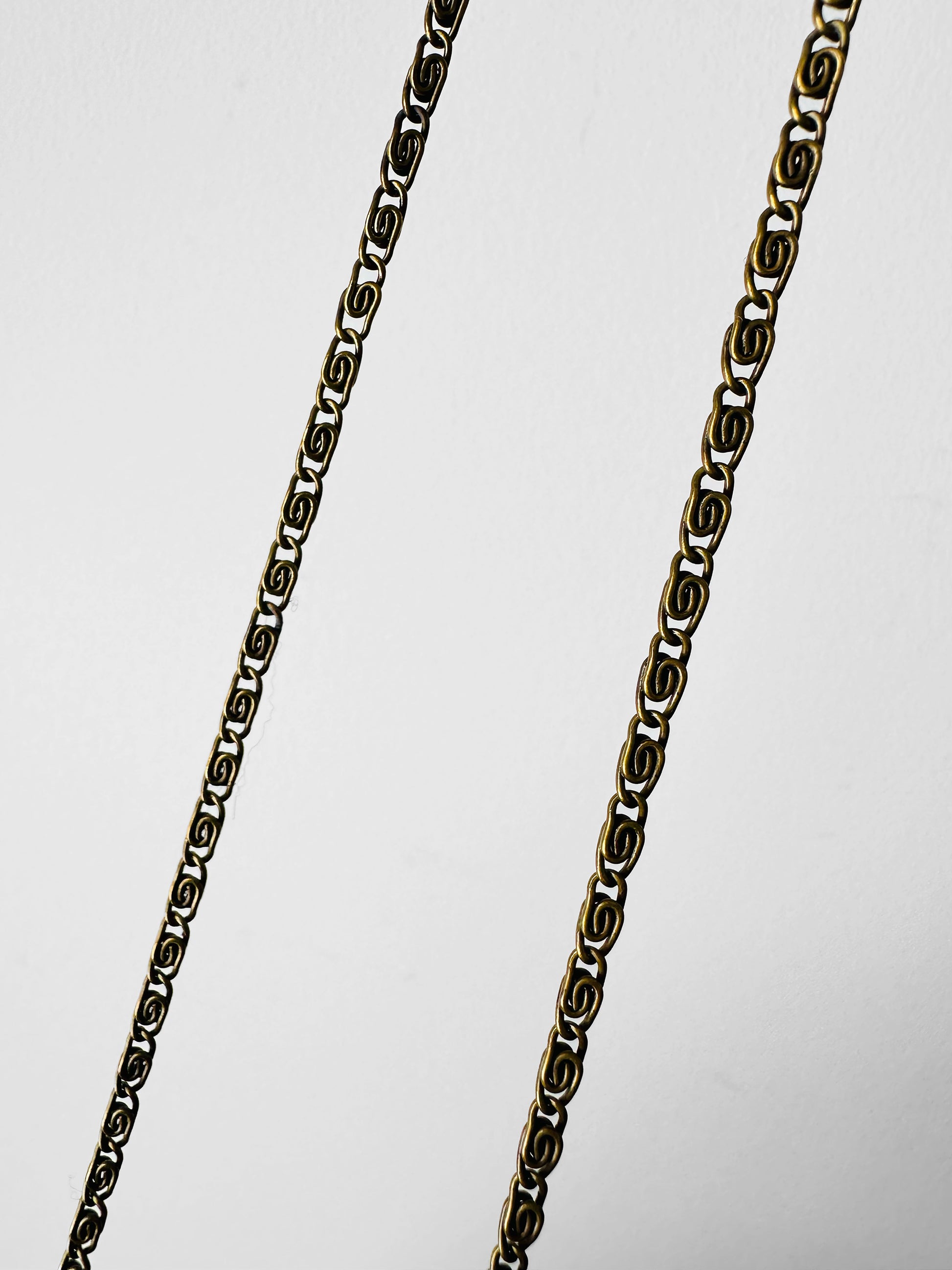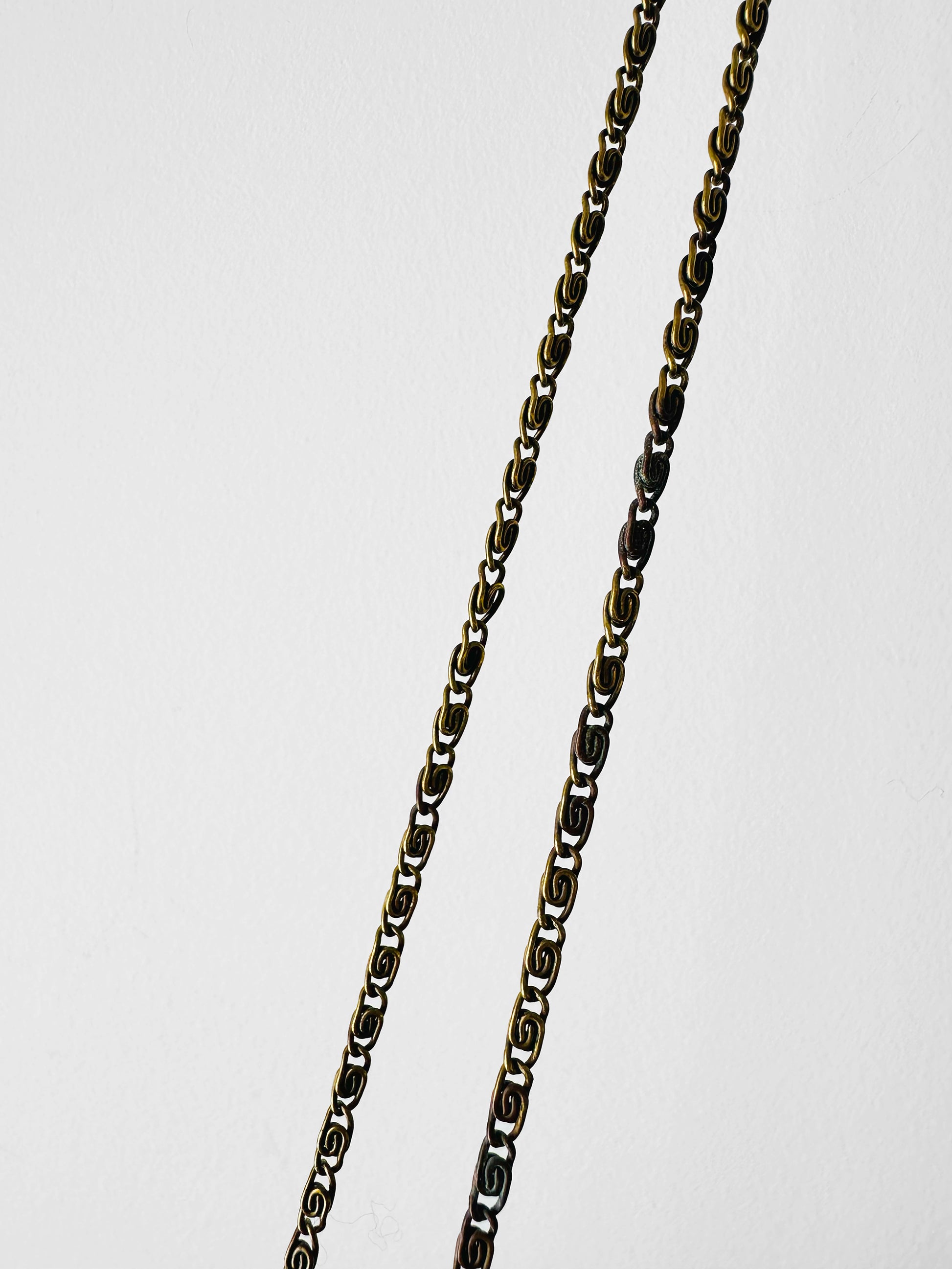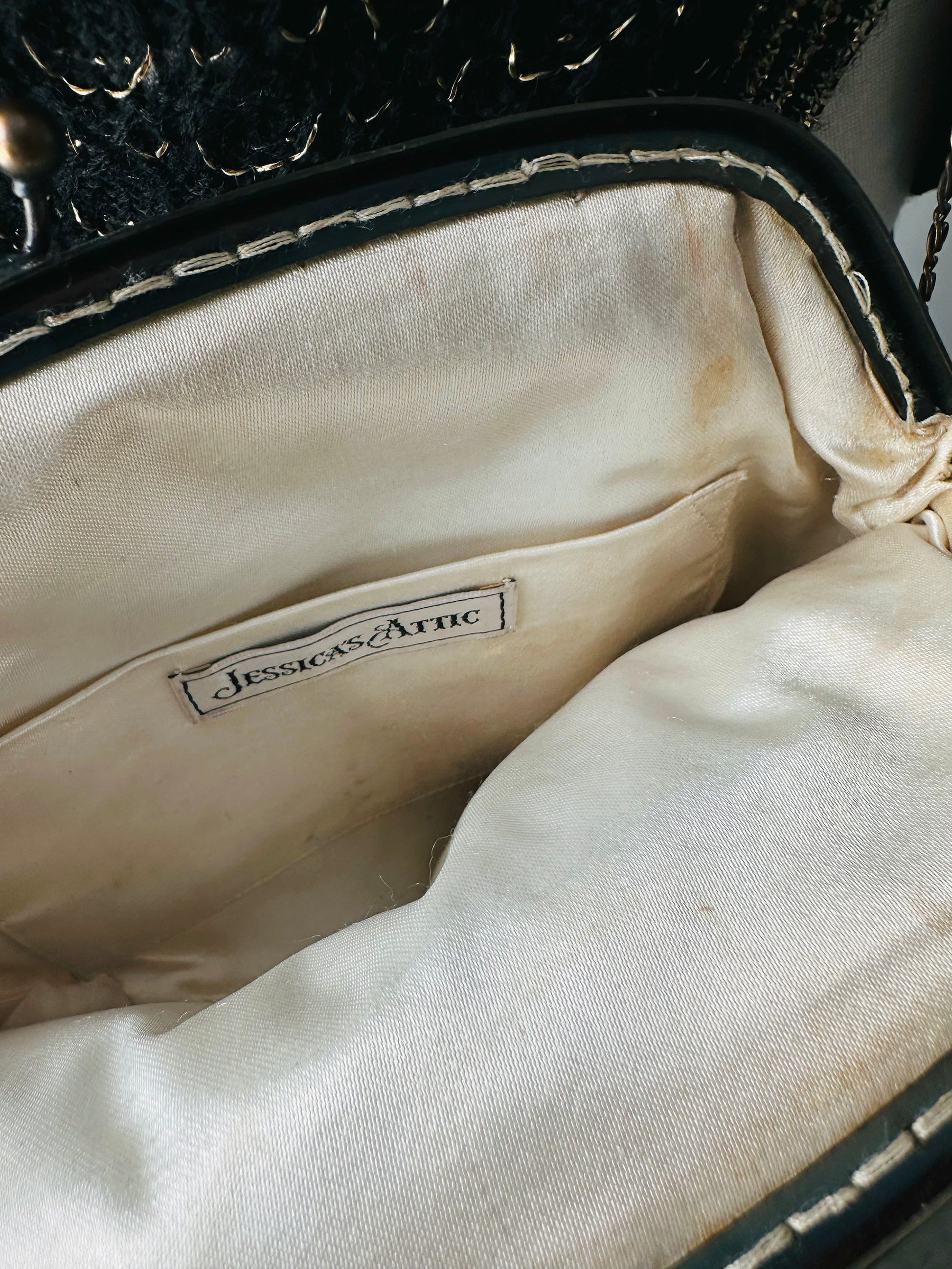 CONDITION: This item is in overall excellent, gently worn, vintage exterior condition. The chain needs to be replaced and I would call it well-worn visually. It is quite tarnished in a few places more than others and a few links are deformed. With that said it is visual wear only and doesn't impede on the usage of the strap. The beading is pretty much fully intact with the exception of a few beads at the bottom. It is near impossible to see unless examining up close. The interior has some obvious wear as well.