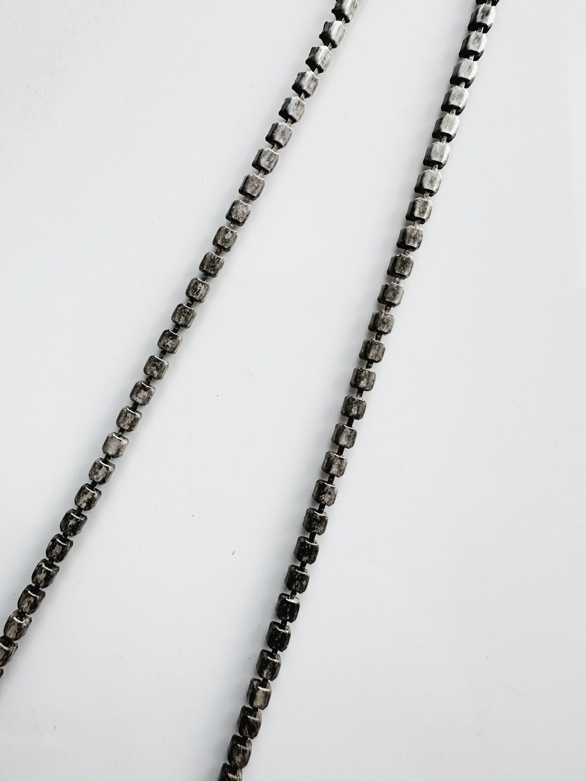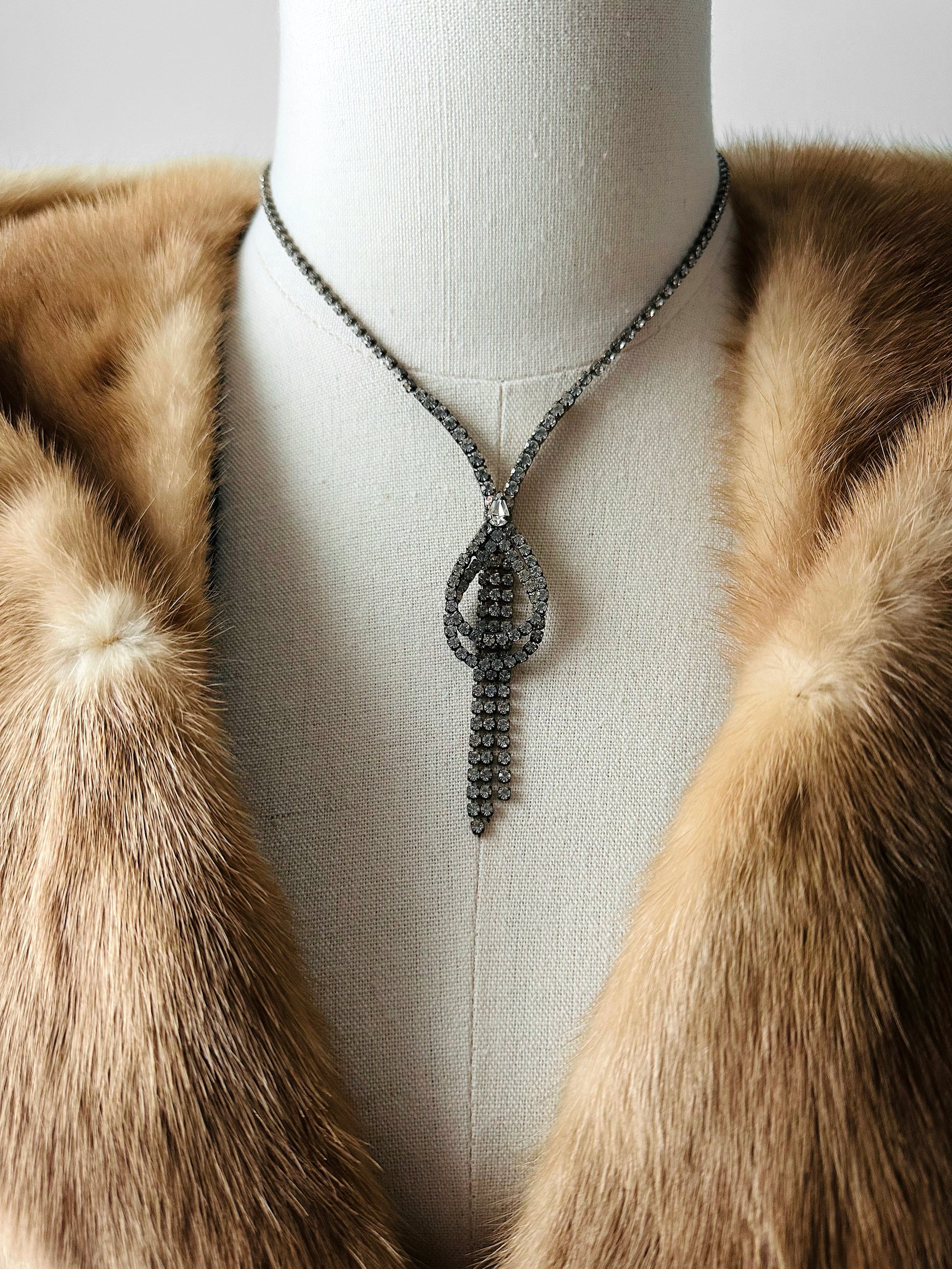 This Y-necklace exemplifies the sophistication of 1950s fashion. Its cascading drops and central pendant reflect a silhouette favored for evening wear, while the clear, brilliant-cut stones evoke the look of diamonds—a hallmark of costume jewelry charm. The dark metal setting adds depth and drama, enhancing the sparkle and lending an air of vintage elegance that continues to captivate.