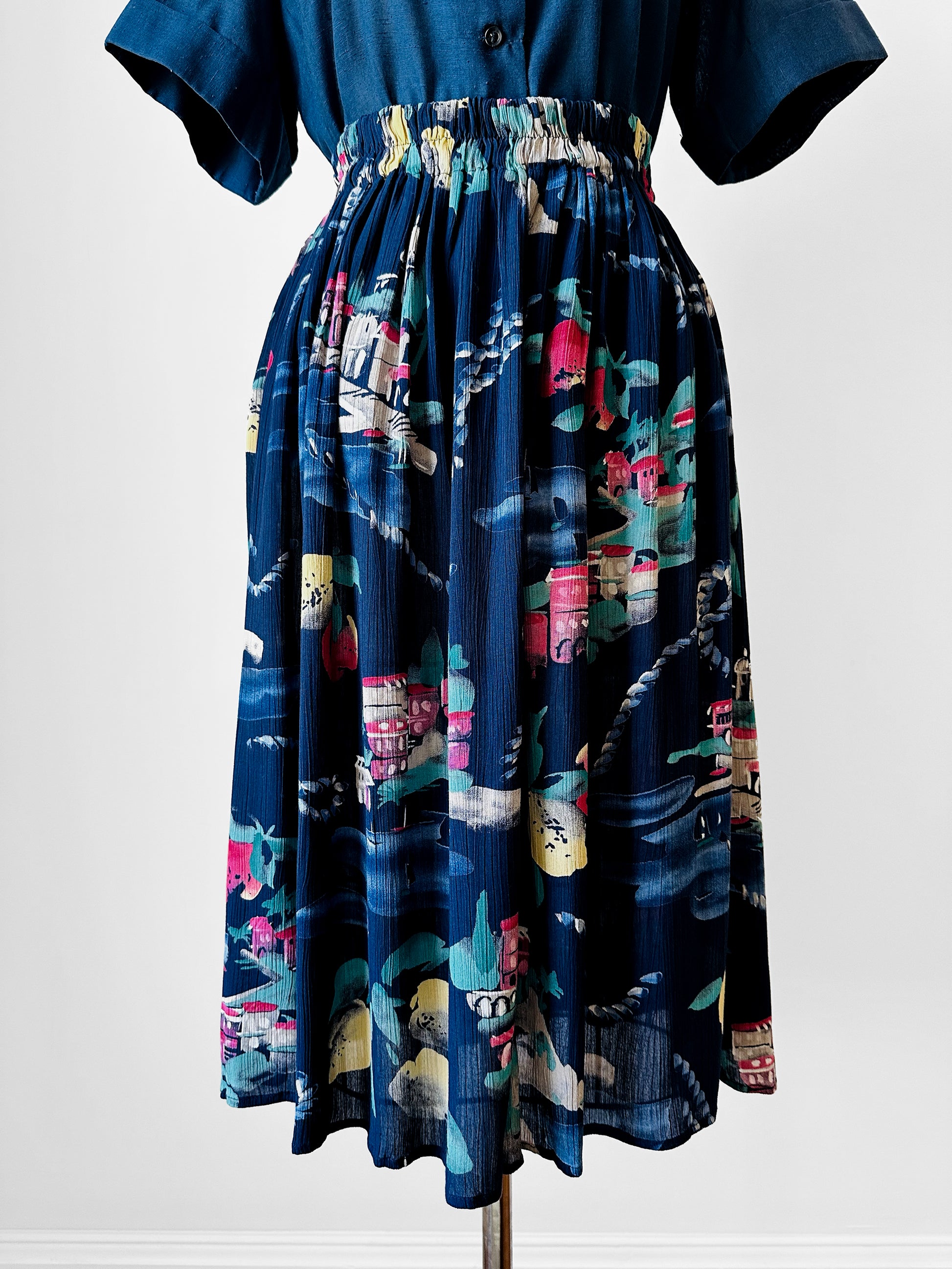 1980s - 1990s Navy Blue Vacation Patterned Skirt - Sz. M/L