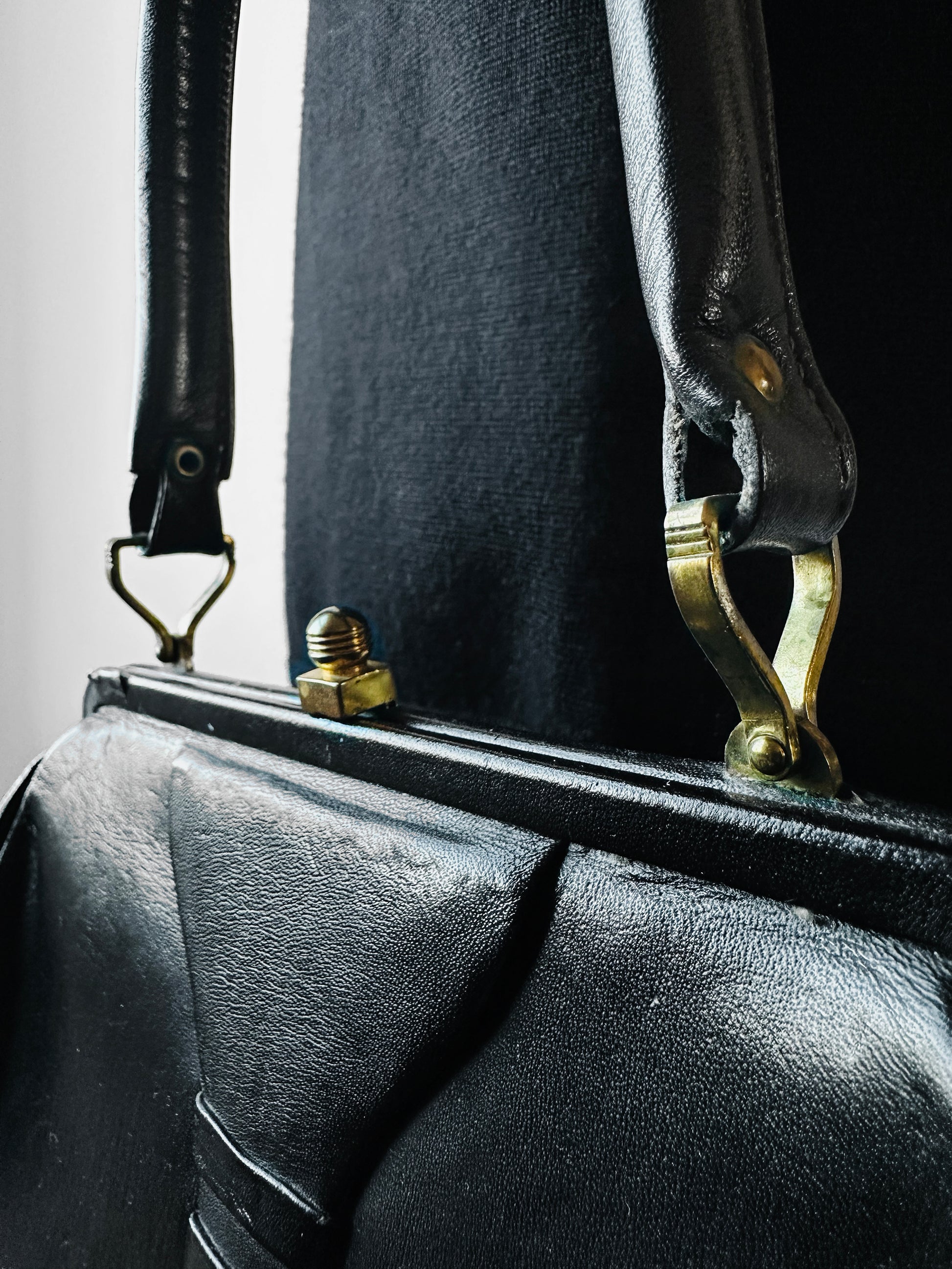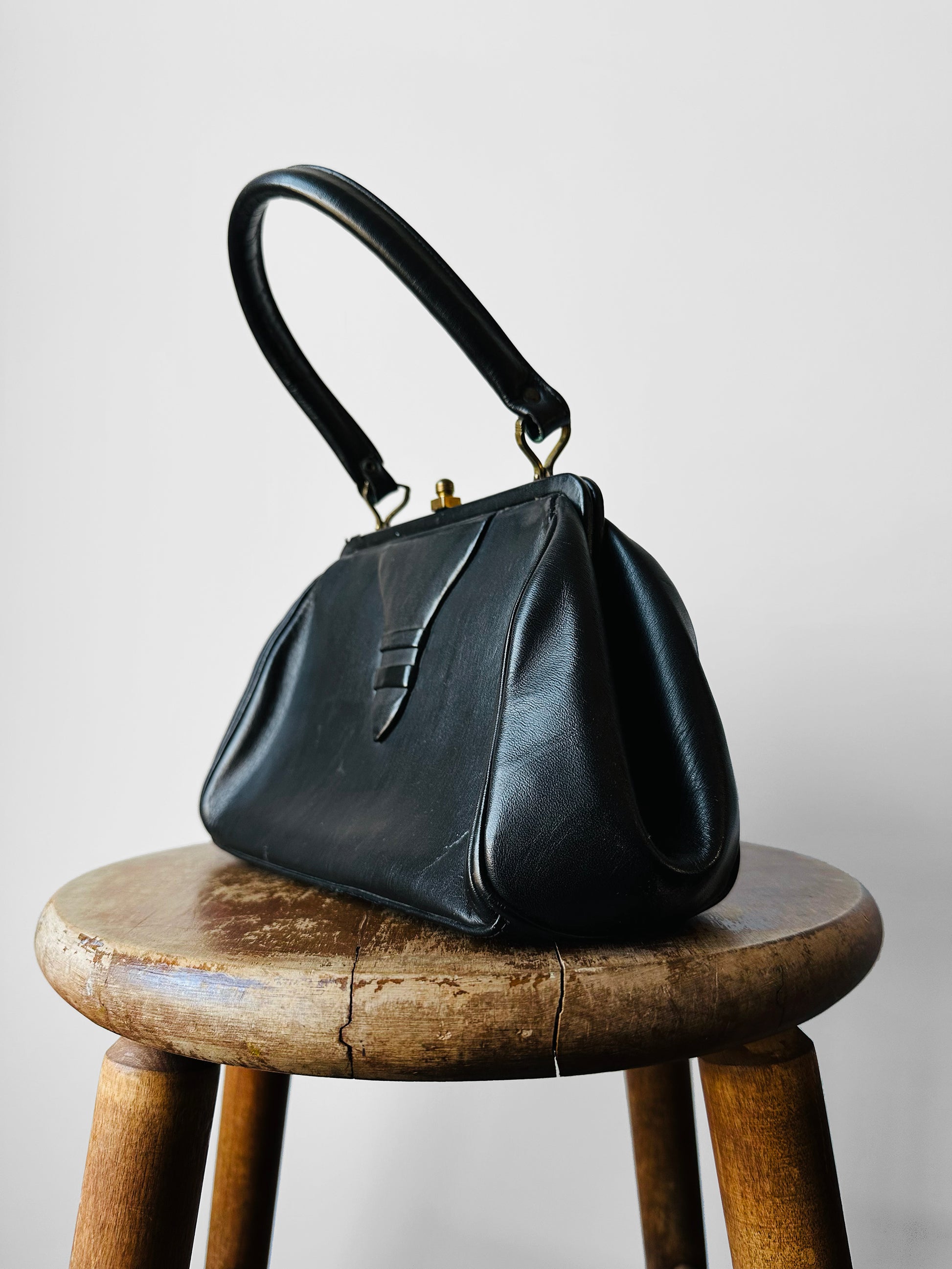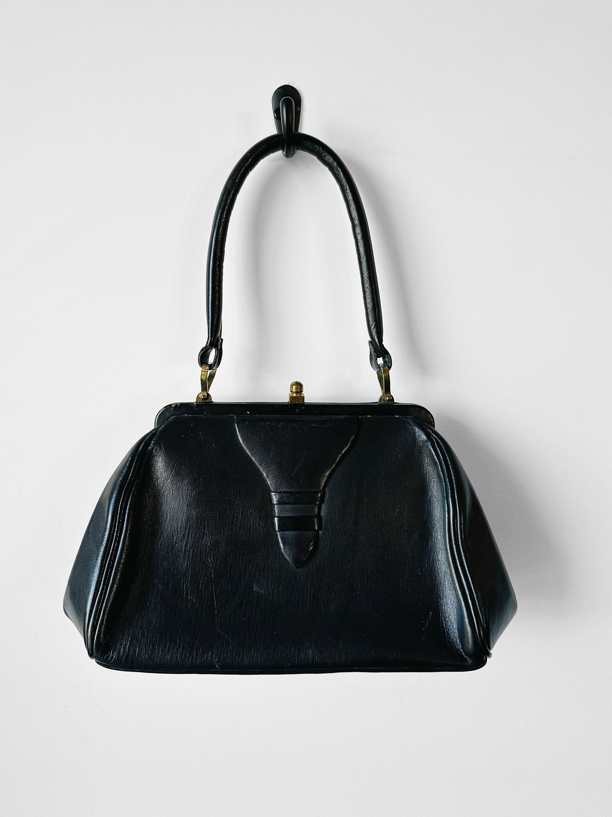 1940s - 1950s Black Leather Handbag with Brass Accents