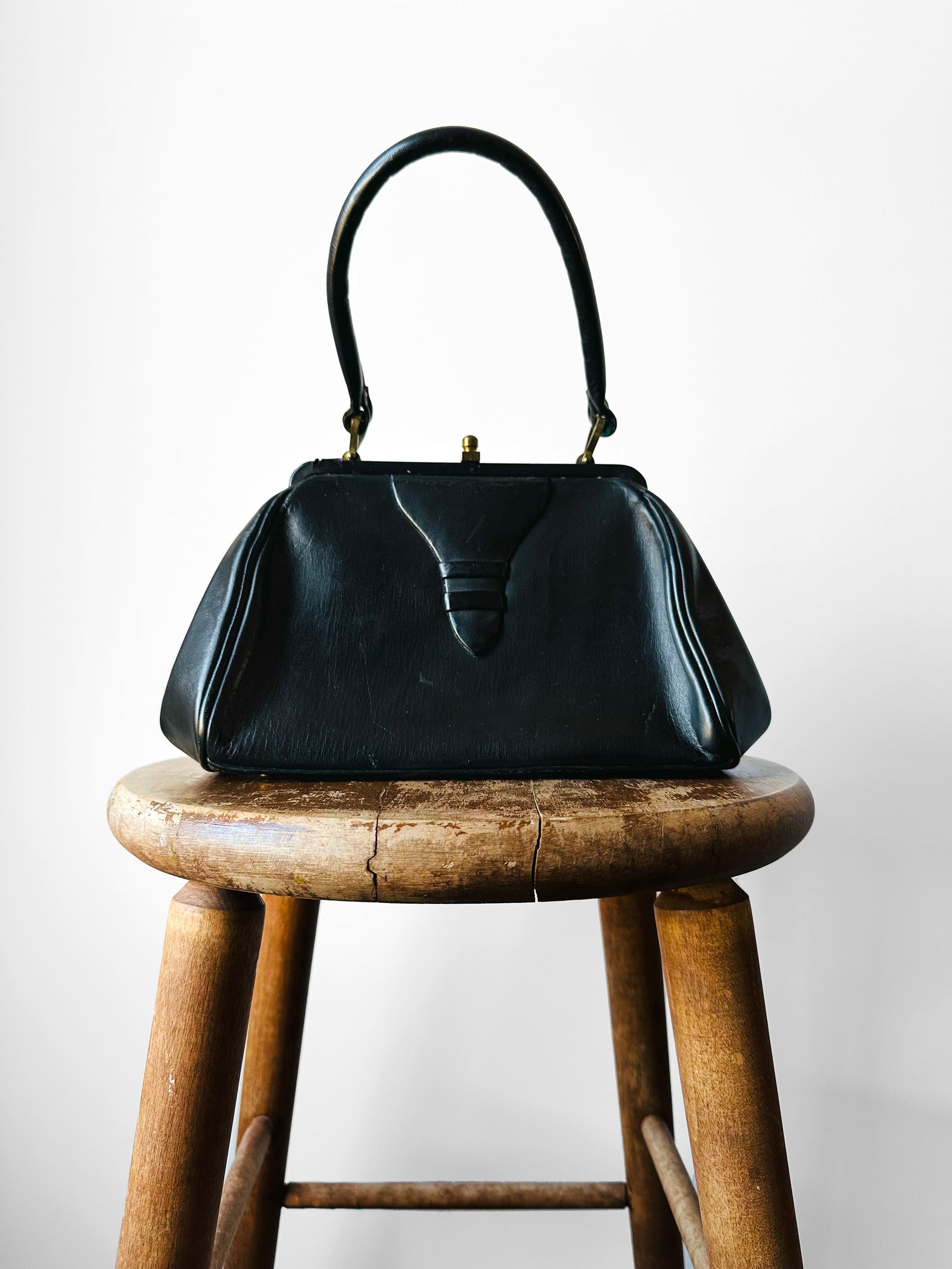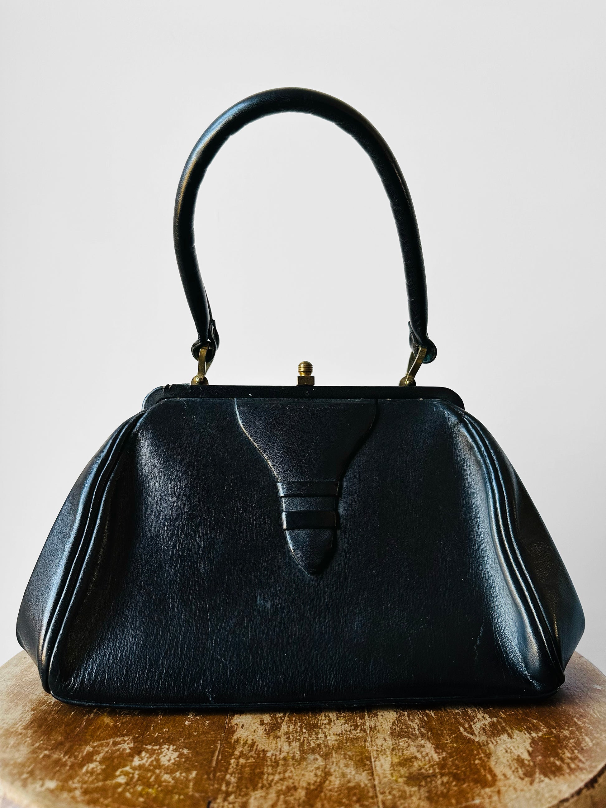 DESCRIPTION: This vintage handbag exudes mid-century sophistication with its structured silhouette, elegant top handle, and ornate clasp—hallmarks of 1940s and 1950s style. During this era, fashion embraced polished, feminine designs that paired perfectly with tailored suits and evening ensembles. Crafted from quality leather with meticulous detailing, this piece reflects the refinement and craftsmanship that defined the period. Whether from a renowned maker or an undiscovered gem, it’s a timeless accessory that elevates any look with vintage glamour.