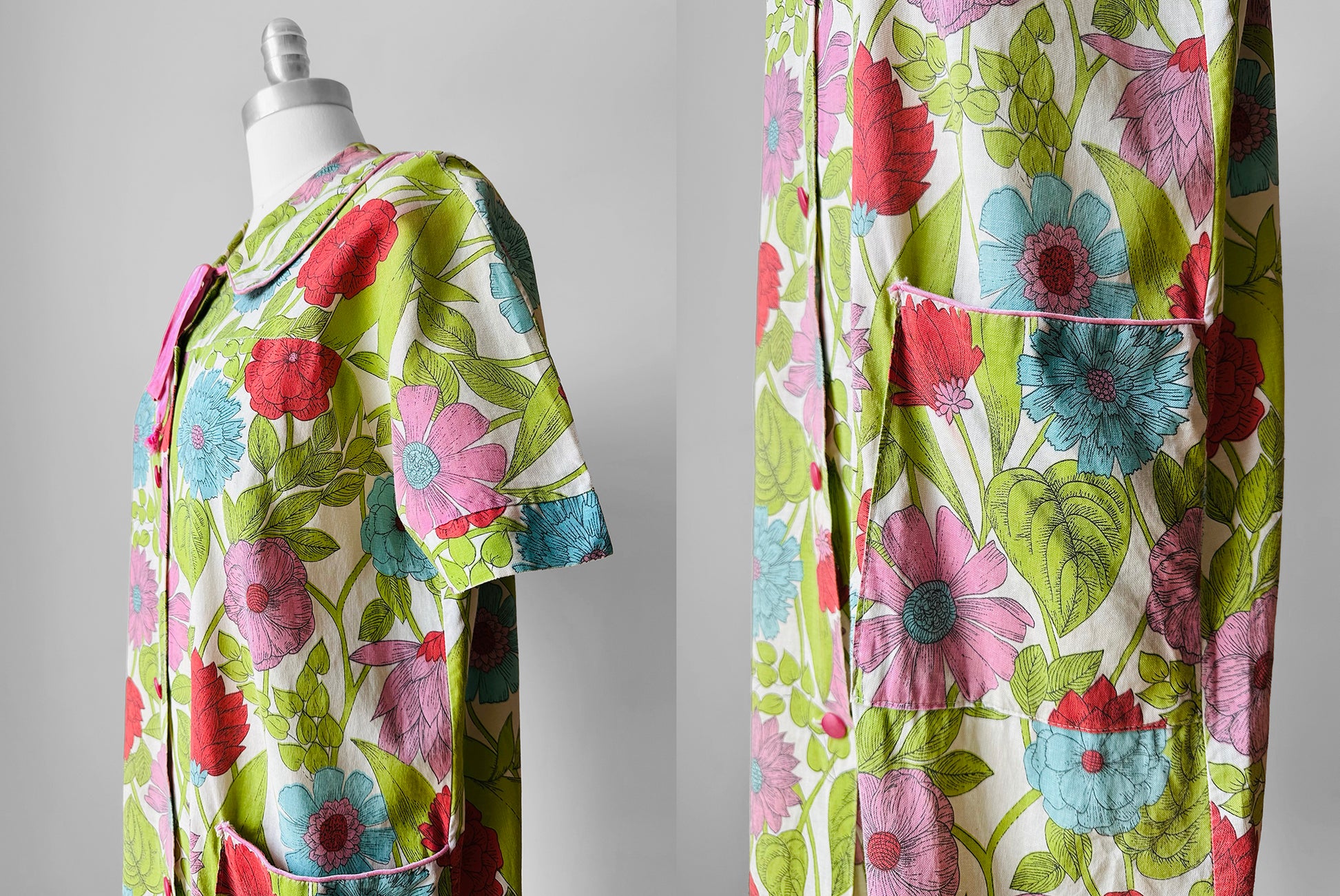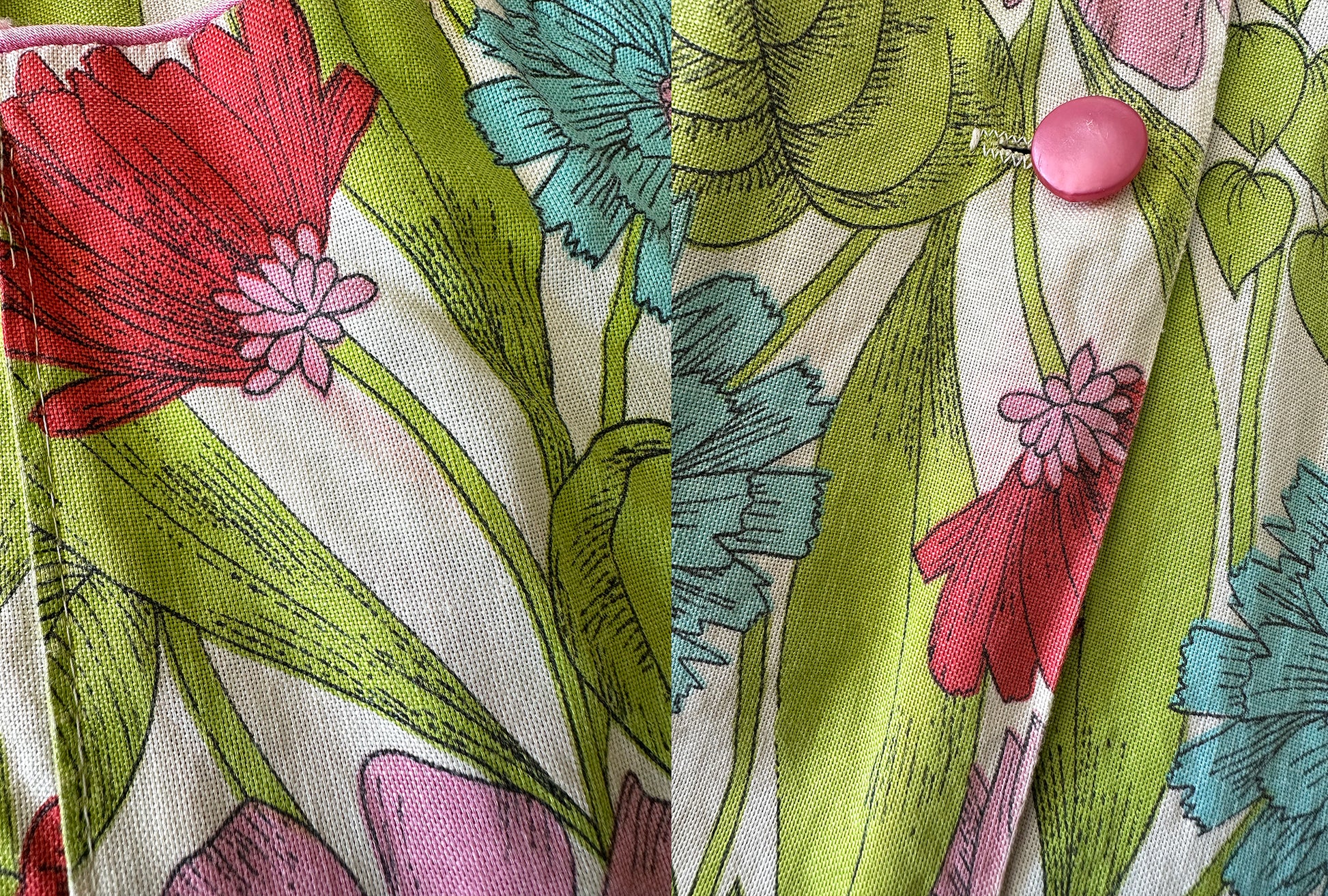 This dress just screams summertime in the garden. Love the colour palette and handmade styling. It's super comfy and airy but still maintains some nice structure to the fabric. This would be a cotton or cotton blend and will continue to soften over time.