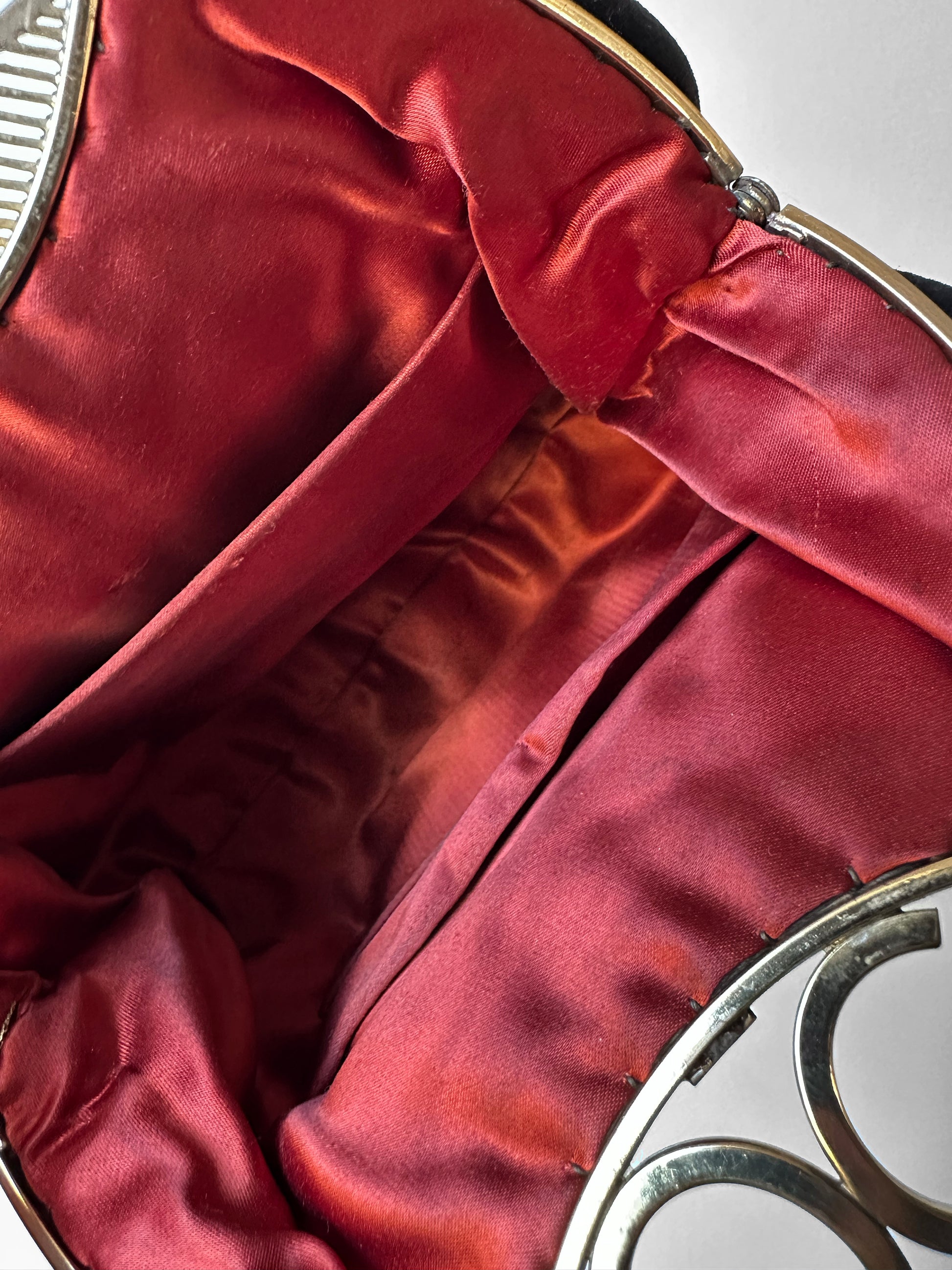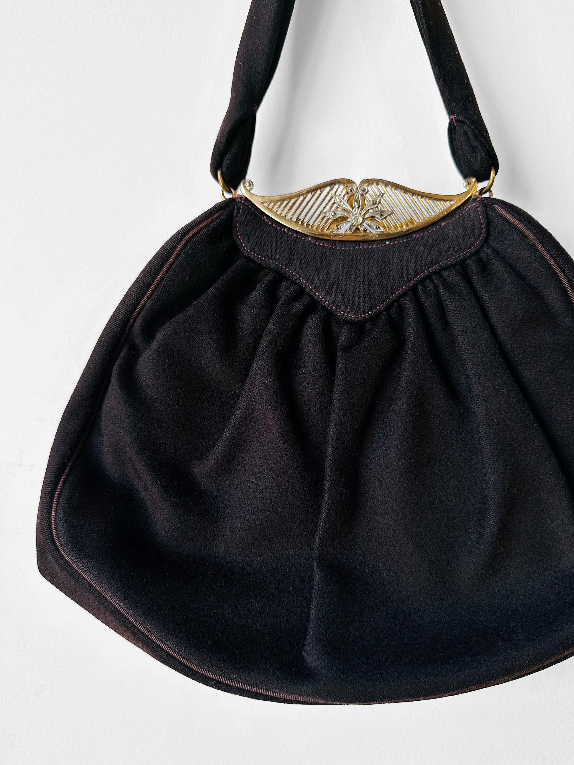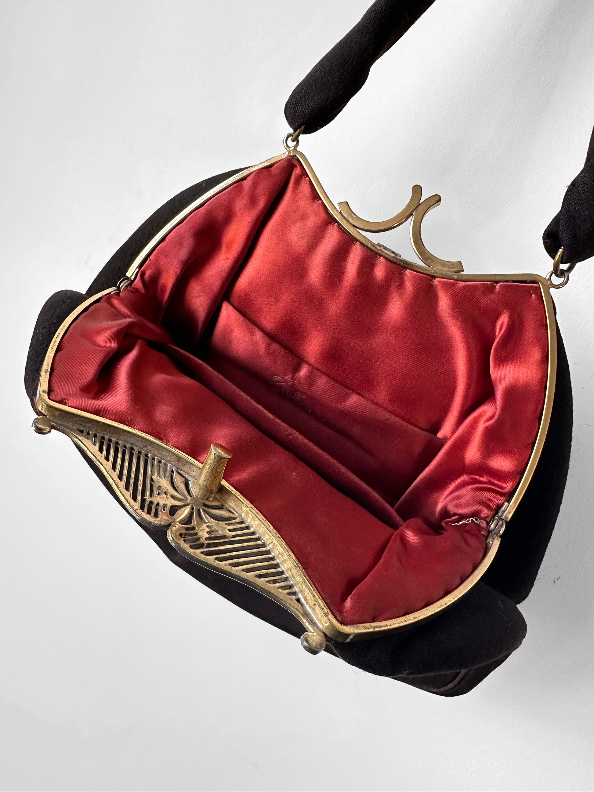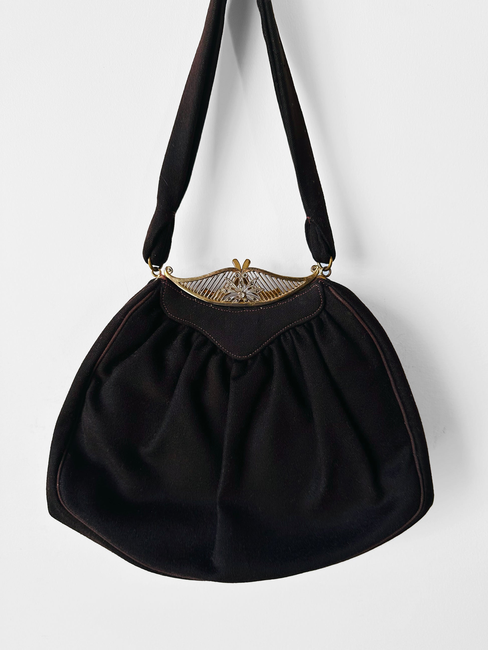 DESCRIPTION: Elevate your evening ensemble with this exquisite vintage dark brown pleated fabric bag, a true nod to mid-century glamour. Its sculptural pleats create elegant texture, while the ornate gold-tone clasp adds a touch of opulence that catches the light with every movement. Inside, a luxurious crimson silk lining whispers sophistication, making this piece as beautiful within as it is without. Perfect for soirées, cocktail parties, or any occasion where style speaks volumes, this timeless accessory is more than a bag—it’s a statement.