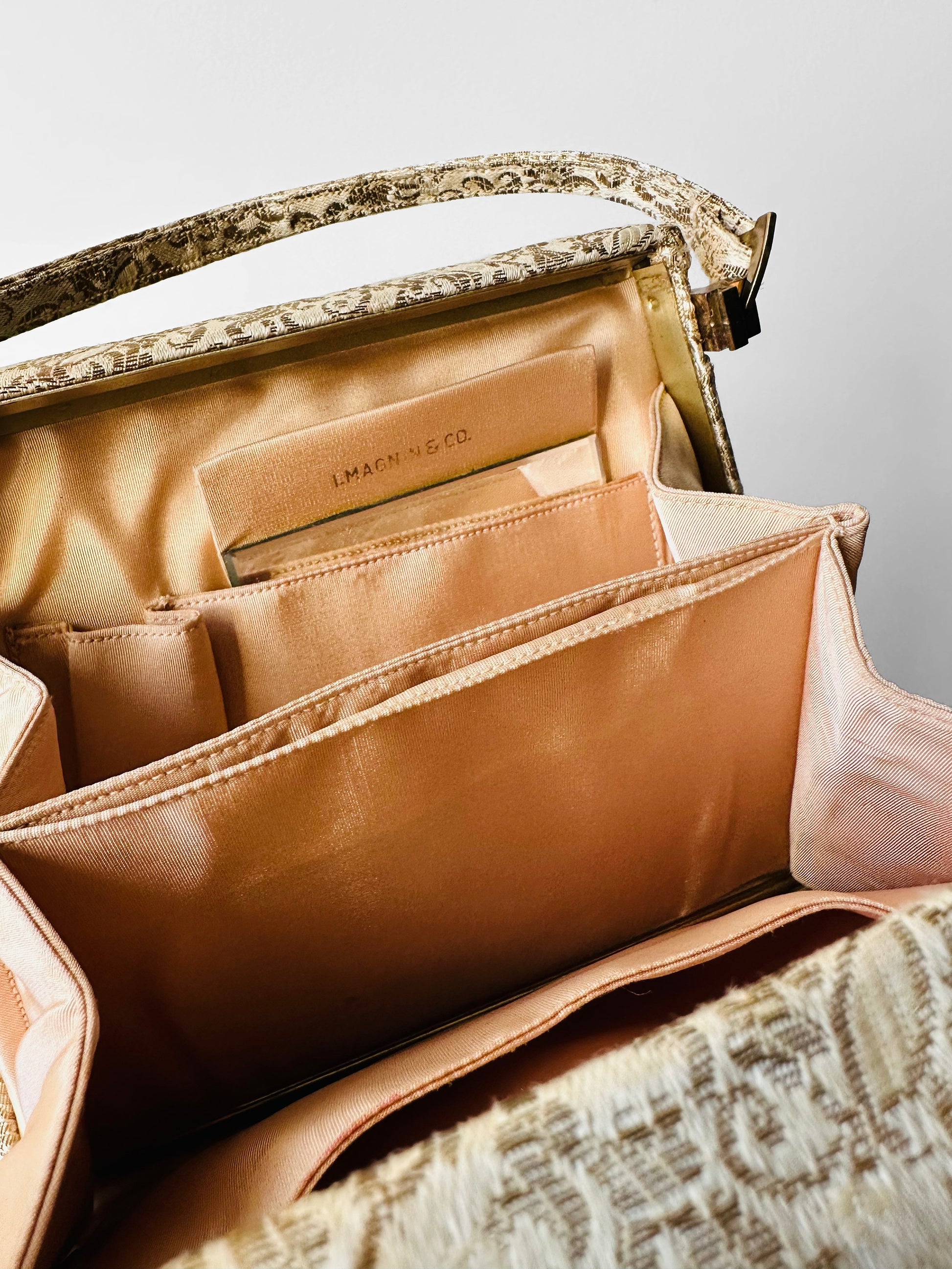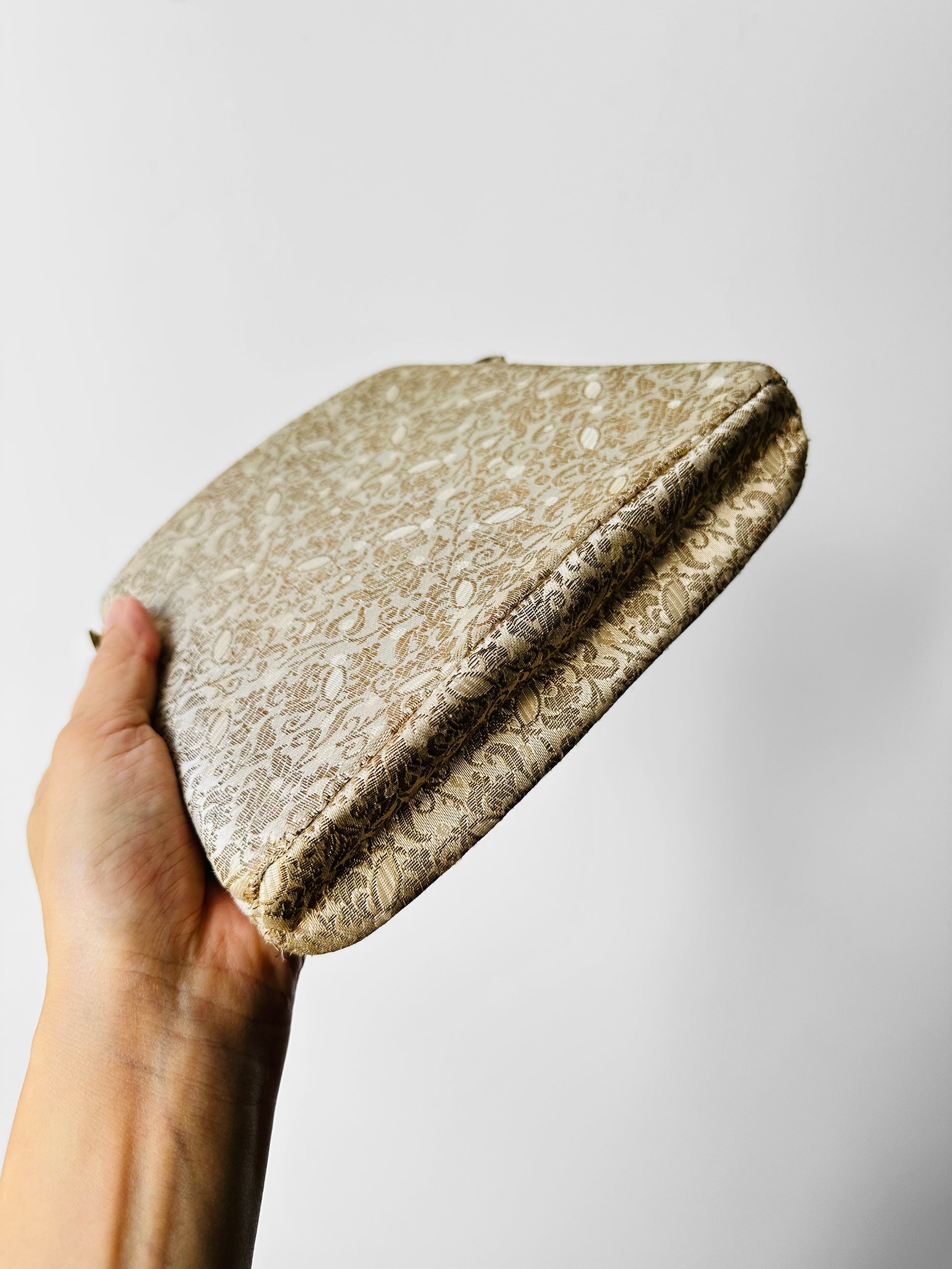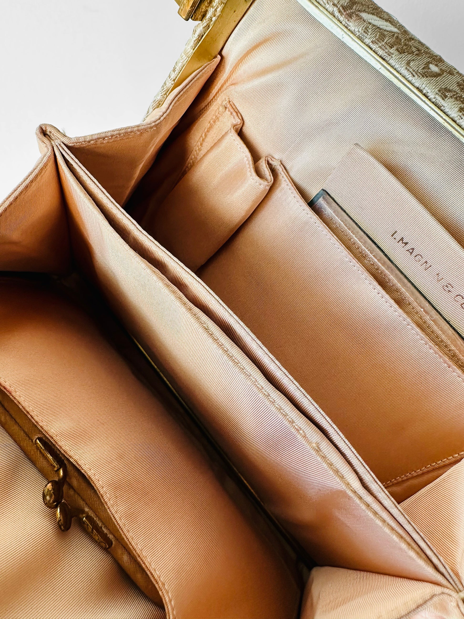 DESCRIPTIONS: This stunning handbag, likely from the mid-20th century, captures the sophistication of its era with ornate brocade fabric and a beautifully structured interior. Designed for evening wear and special occasions, it pairs luxurious materials with thoughtful functionality.