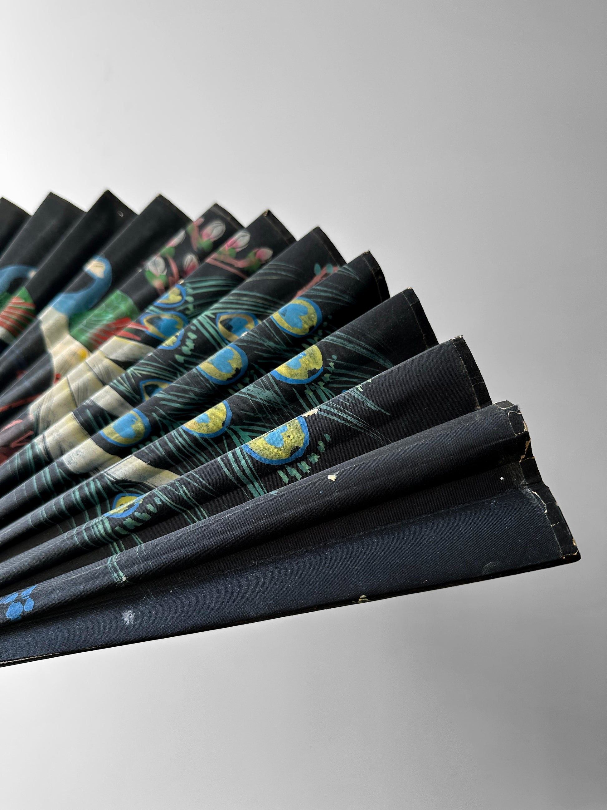 By the late 19th and early 20th centuries, these fans became coveted exports to Western markets, often hand-painted on silk or paper with motifs like peacocks, flowers, and birds. Crafted with bamboo or wooden ribs, they reflected both skilled craftsmanship and the era’s fascination with exotic elegance. Today you can find these used for interior decorating purposes, hung from ceilings or walls as decorative art.