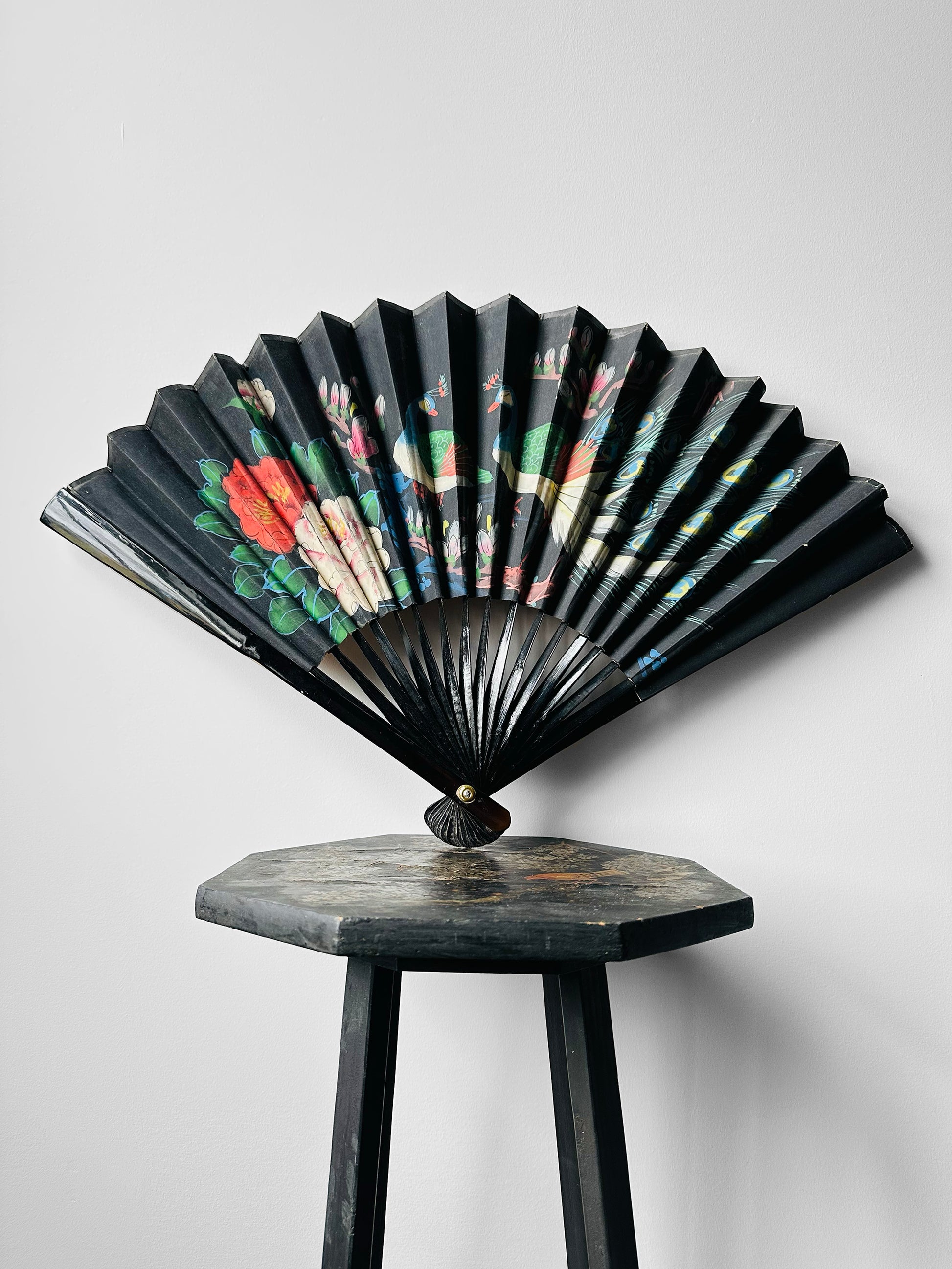 1950s Black Hand-Painted Paper Peacock Fan Decor
