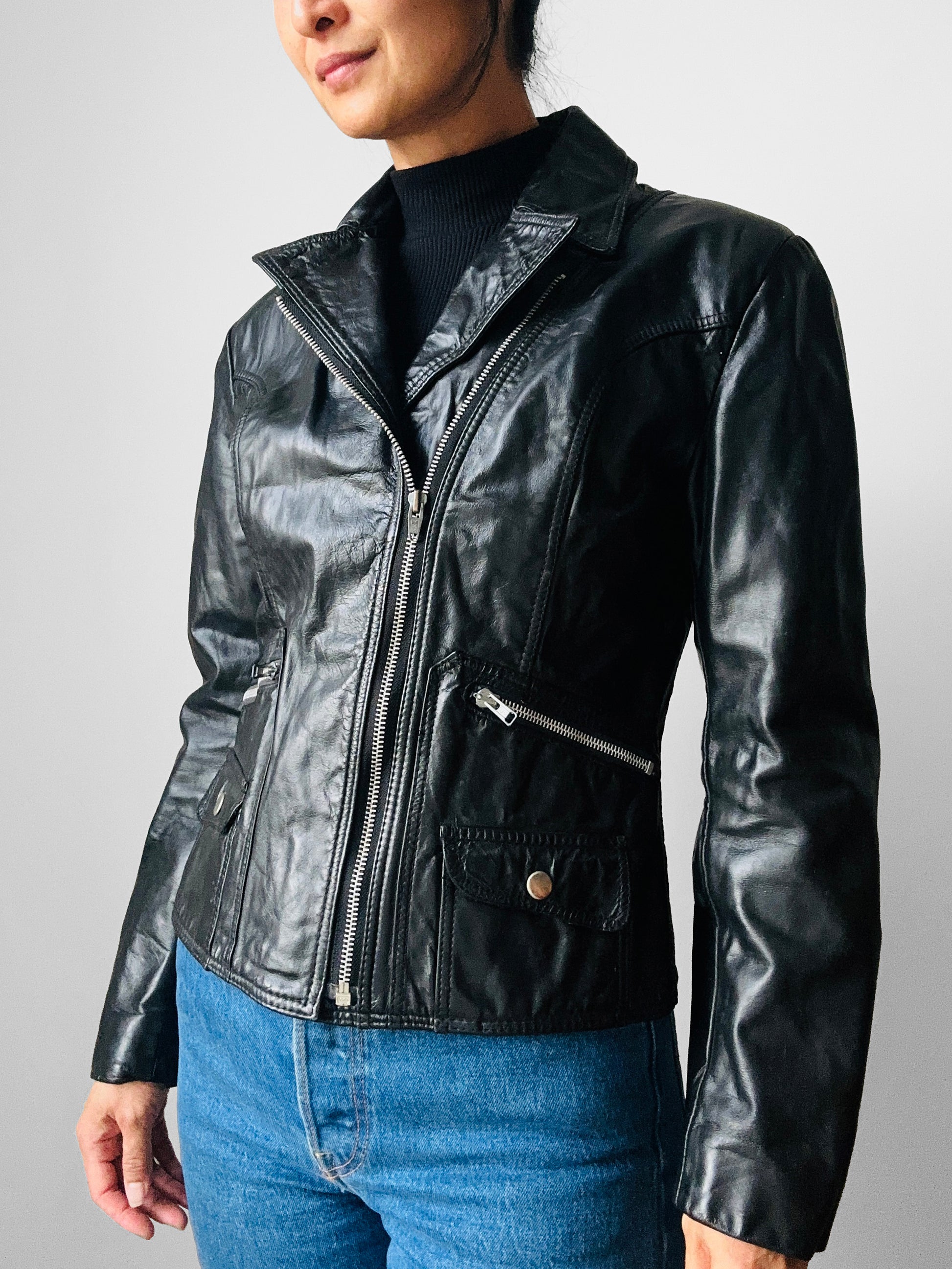 DESCRIPTION: There’s nothing like the attitude of a well-worn vintage leather—and this piece delivers it in spades. Crafted with iconic 70s craftsmanship, this short-waisted biker-inspired jacket features an edgy asymmetrical zip, giving it that classic moto vibe with a modern twist. The lighter-weight leather makes it perfect for layering through Spring, Summer, and Fall, while its relaxed fit drapes like a dream.