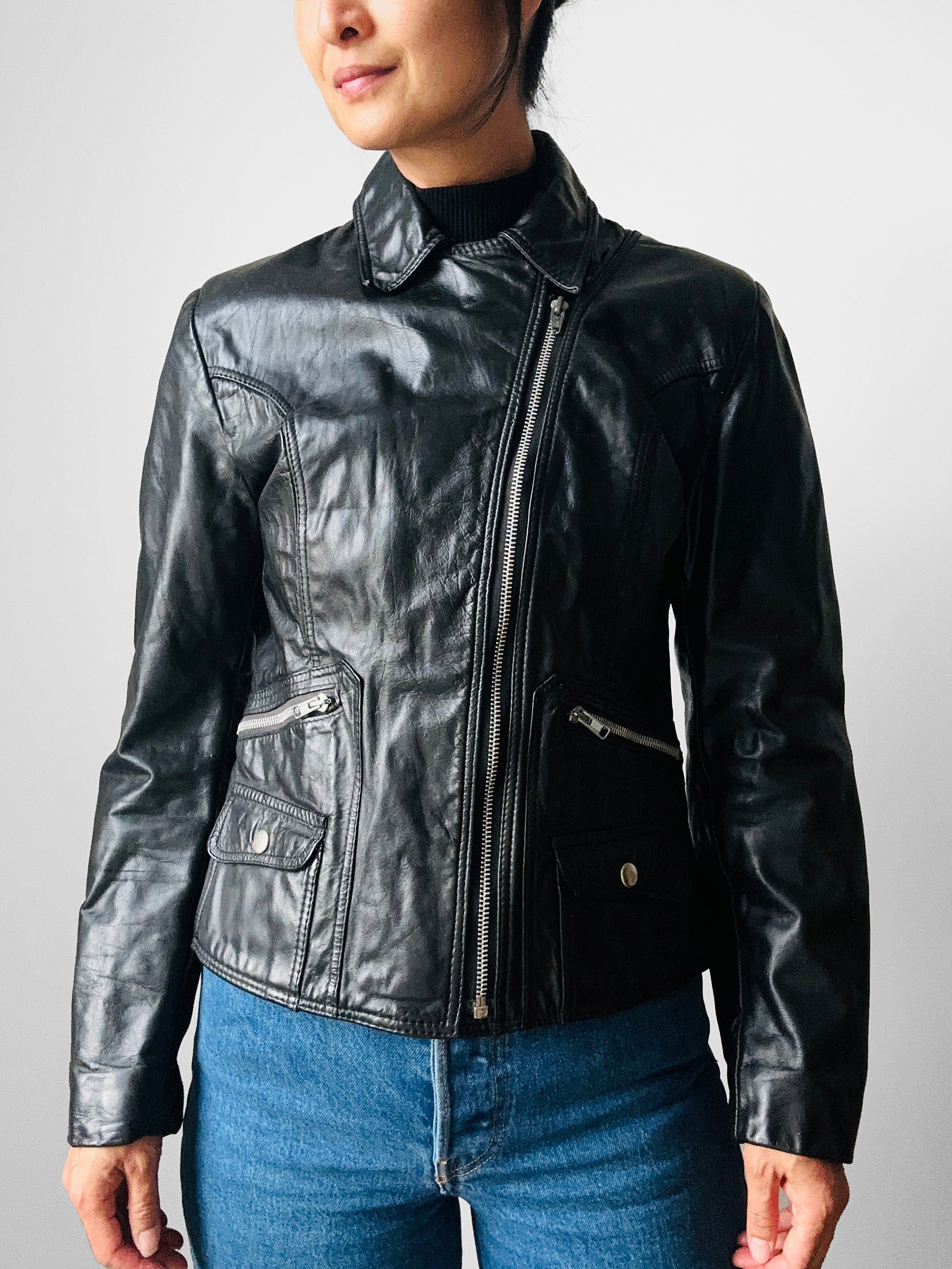 1970s - 1980s Black Asymmetrical Zippered Leather Biker Jacket - Sz. S