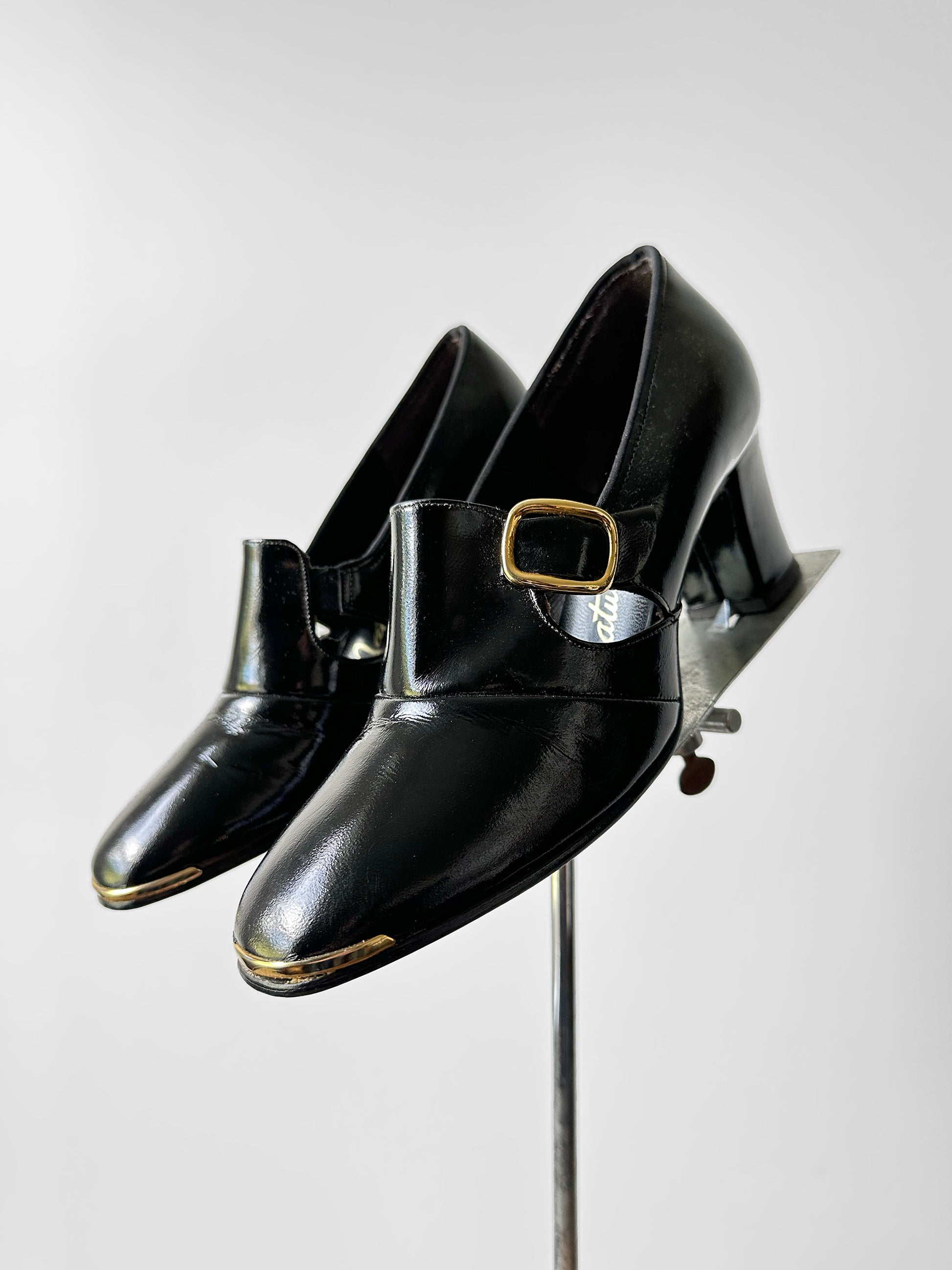 DESCRIPTION: This 60s - 70s set features a glossy patent leather finish and a chic gold-tone buckle, they exude timeless sophistication. The sleek silhouette is effortlessly elegant, making them perfect for everything from polished office looks to glamorous evening outfits. A true blend of classic style and modern versatility—these heels are your go-to for elevating any ensemble.