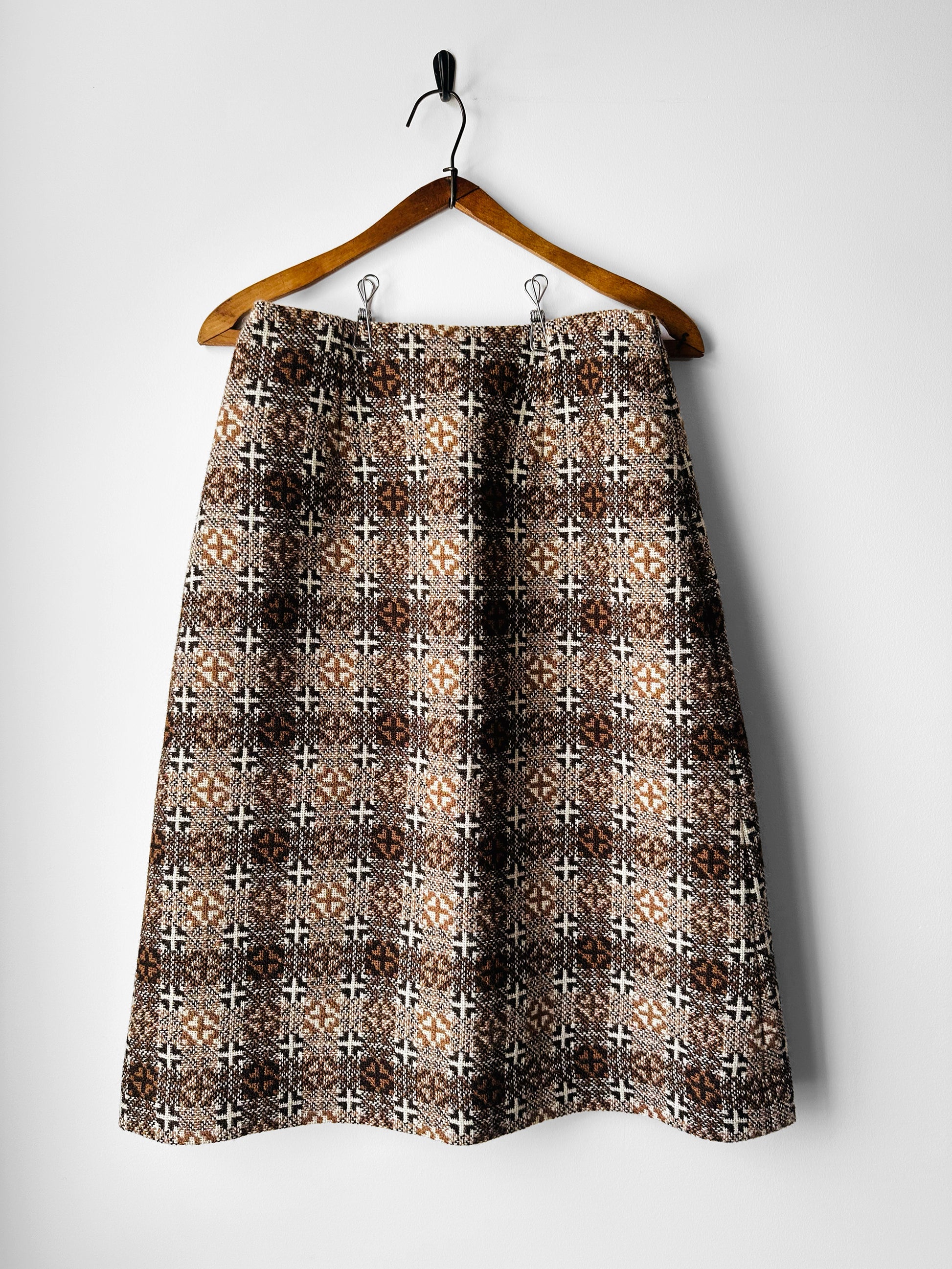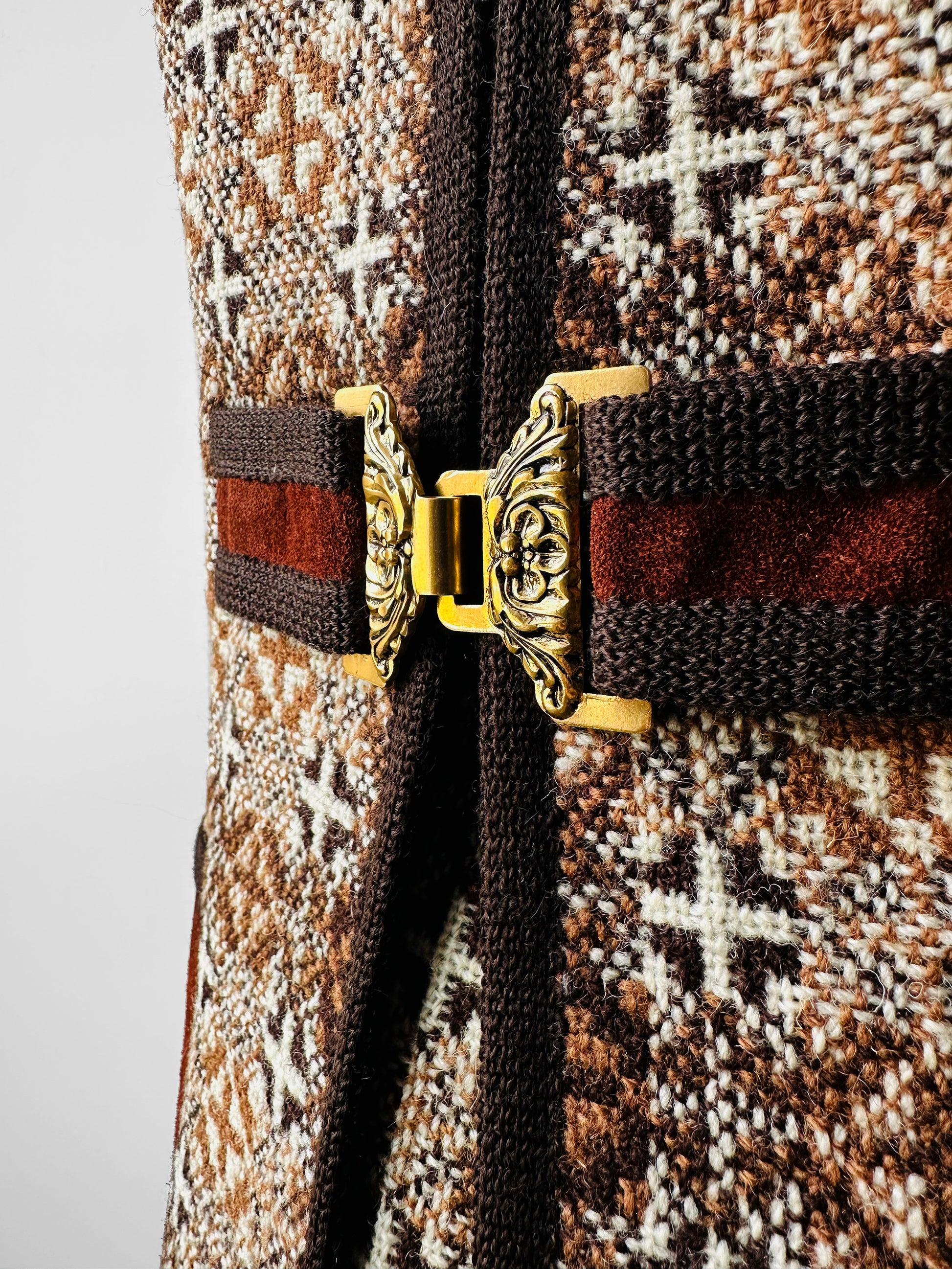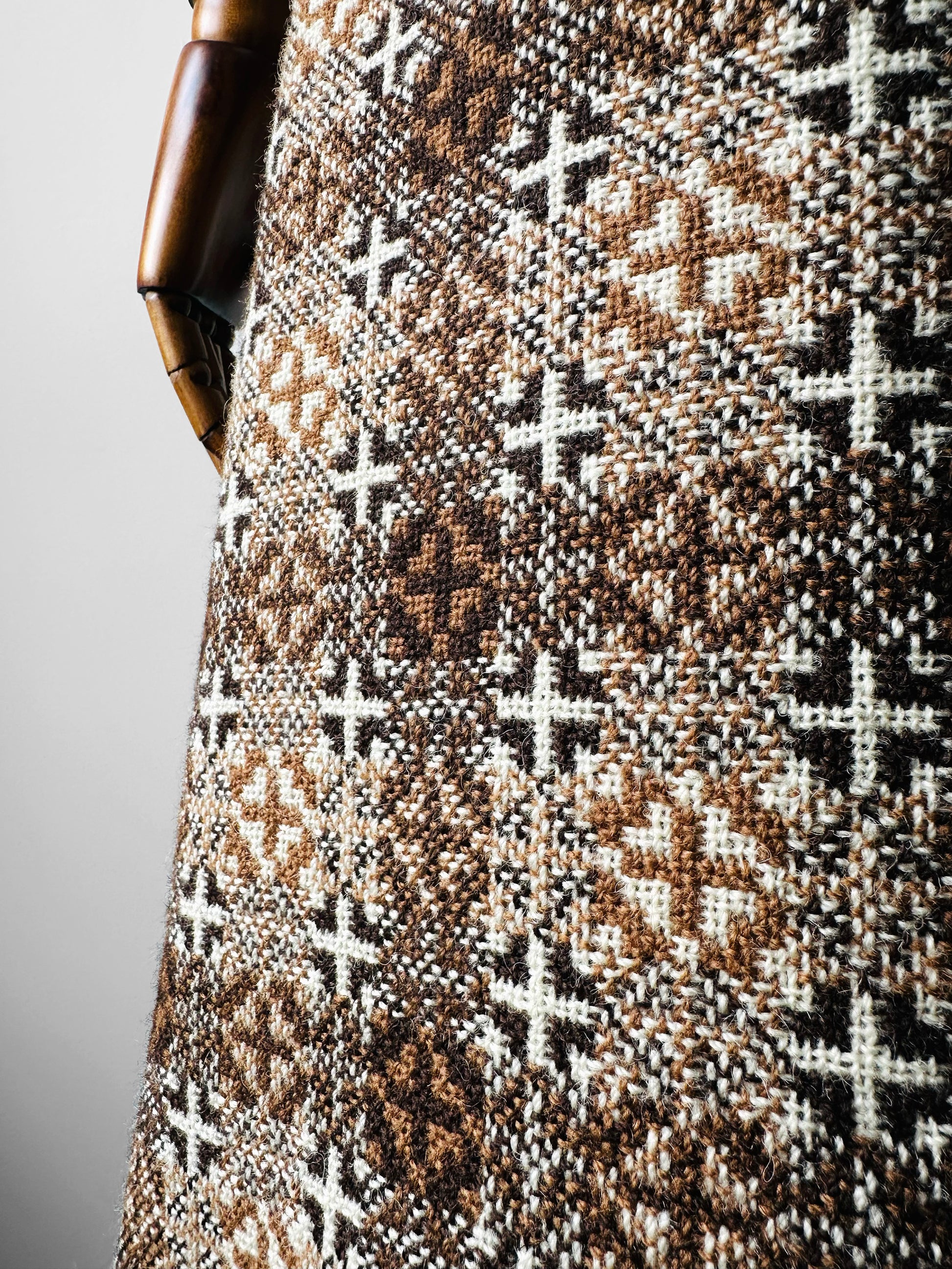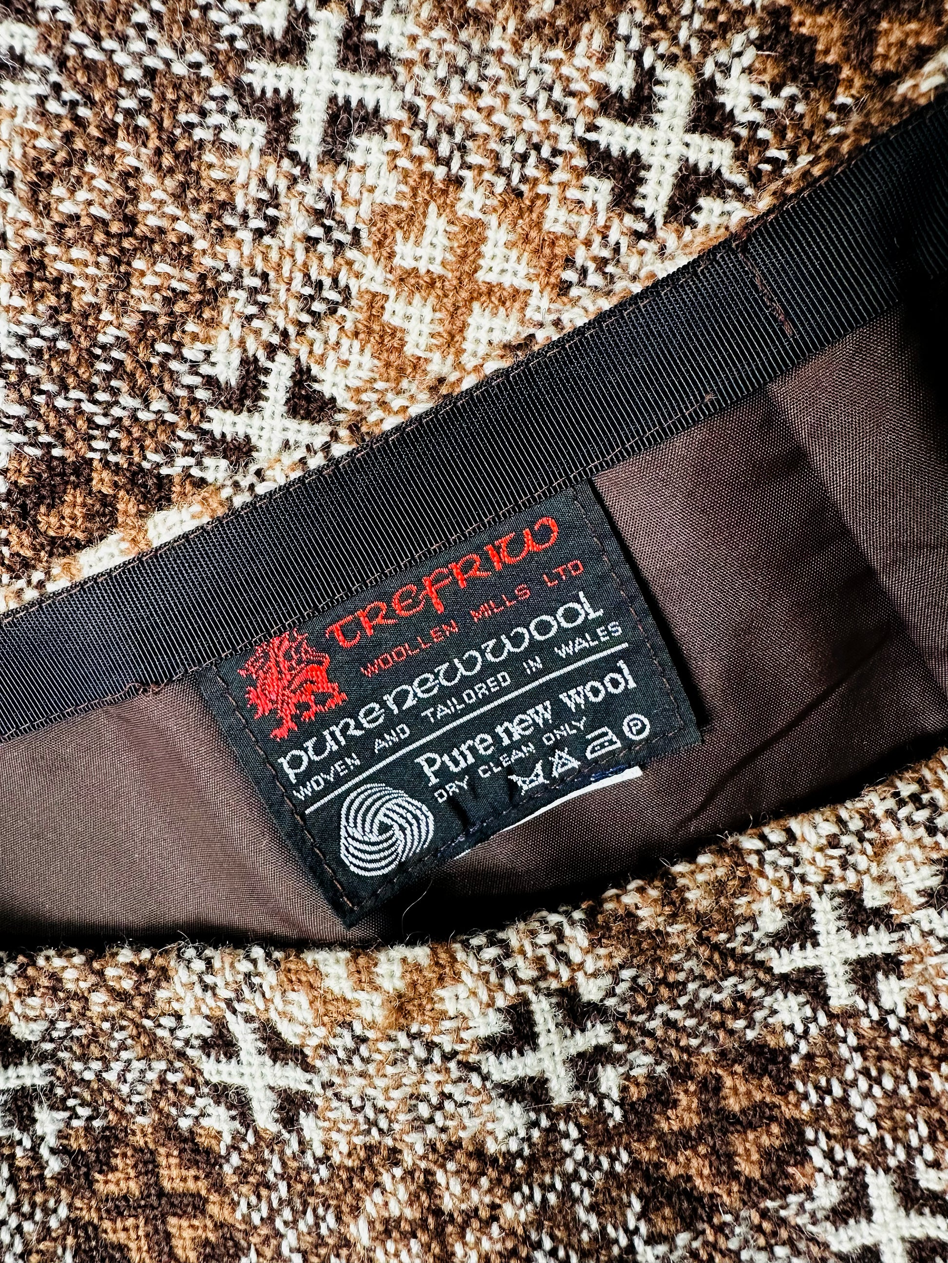 DESCRIPTION: Turn heads with this striking vest and skirt set—a true celebration of Welsh heritage and timeless style. Crafted in the iconic Welsh Tapestry weave, the fabric boasts intricate geometric patterns that are as bold as they are beautiful, rendered in rich, earthy tones that speak to tradition. The reversible design offers versatility, while the pure new wool ensures a luxurious feel and enduring quality. Finished with a distinctive clasp closure, this set is more than vintage—it’s a statement piece for those who appreciate artistry, authenticity, and effortless elegance. Wear as set or separates, either way you're turning heads for all the right reasons.