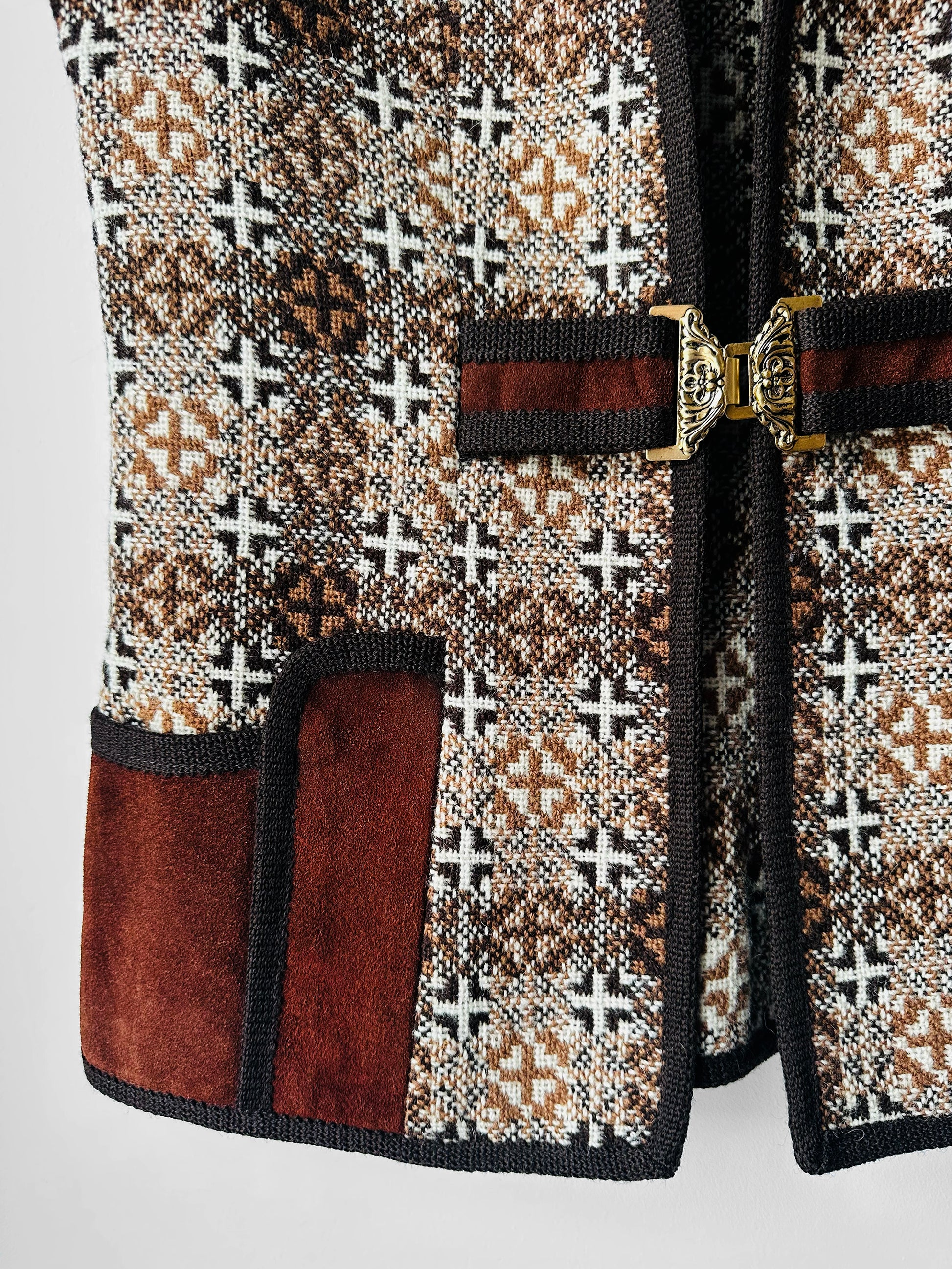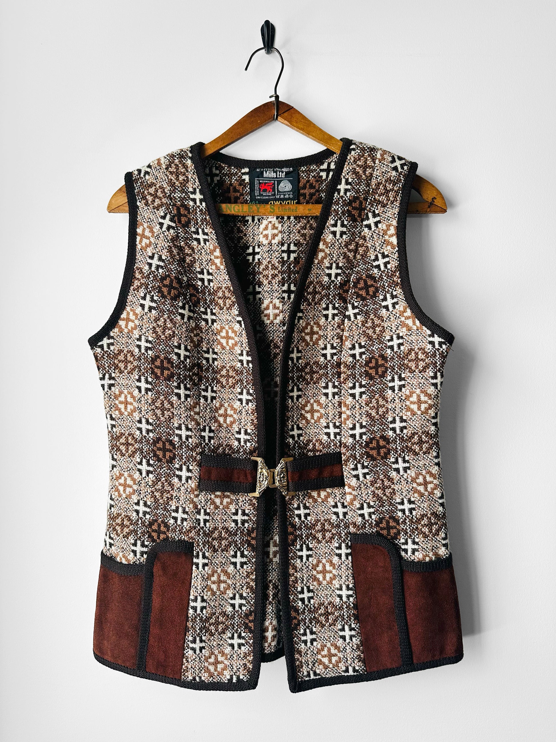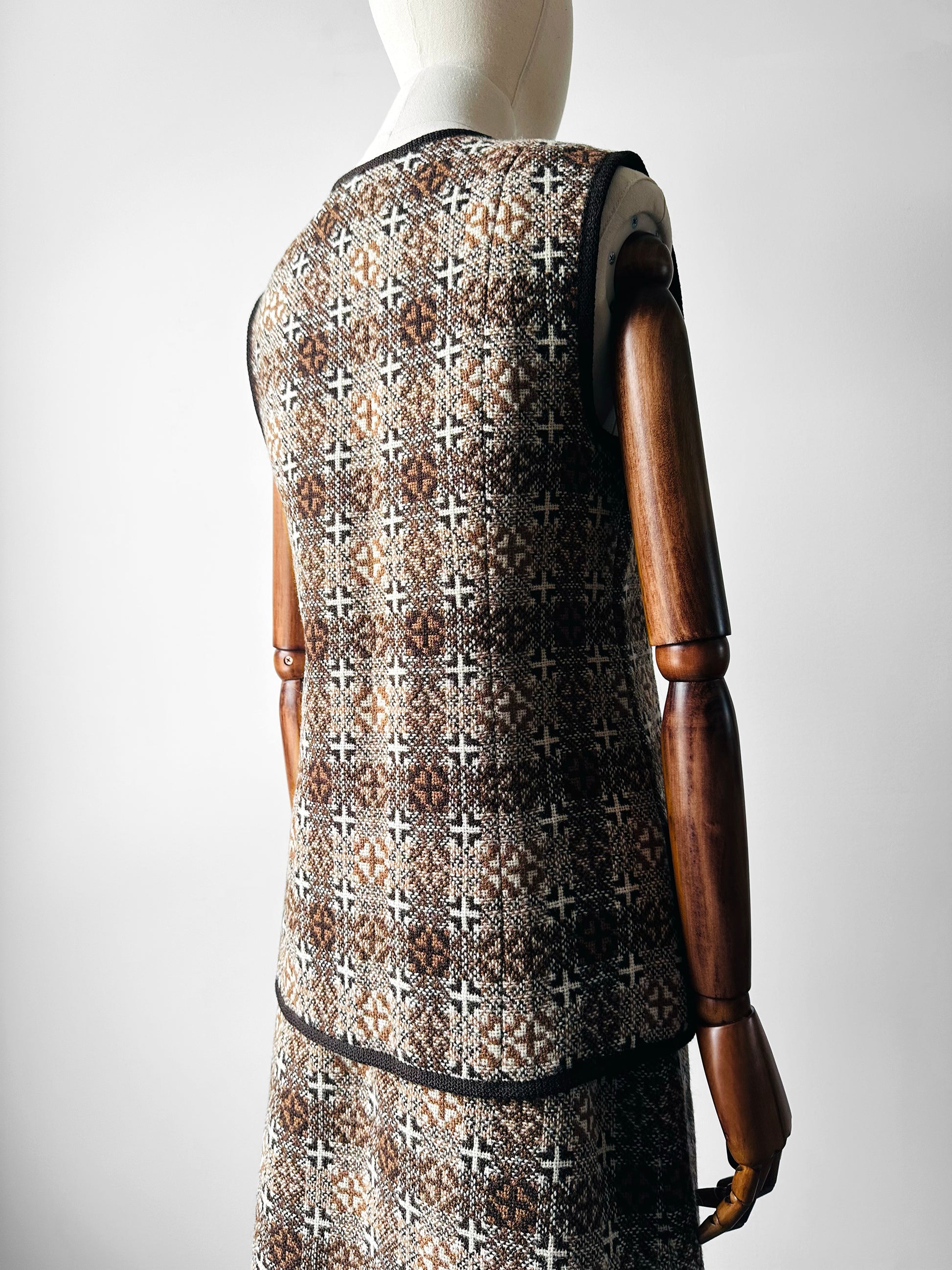 1960s - 1970s Brown and Cream Trefriw Woolen Suede Pocket Skirt and Vest Two-Piece Set - Sz. S/M
