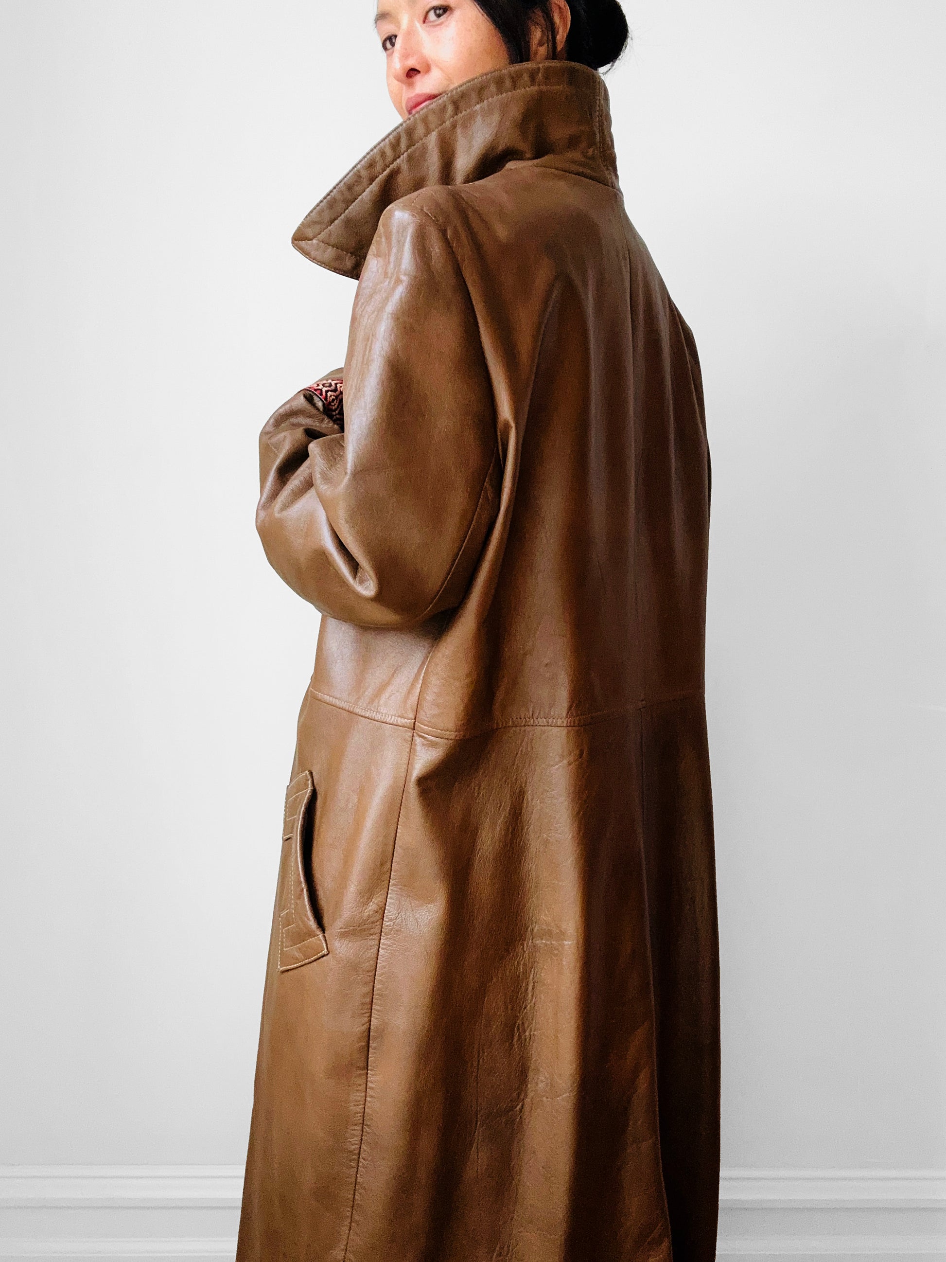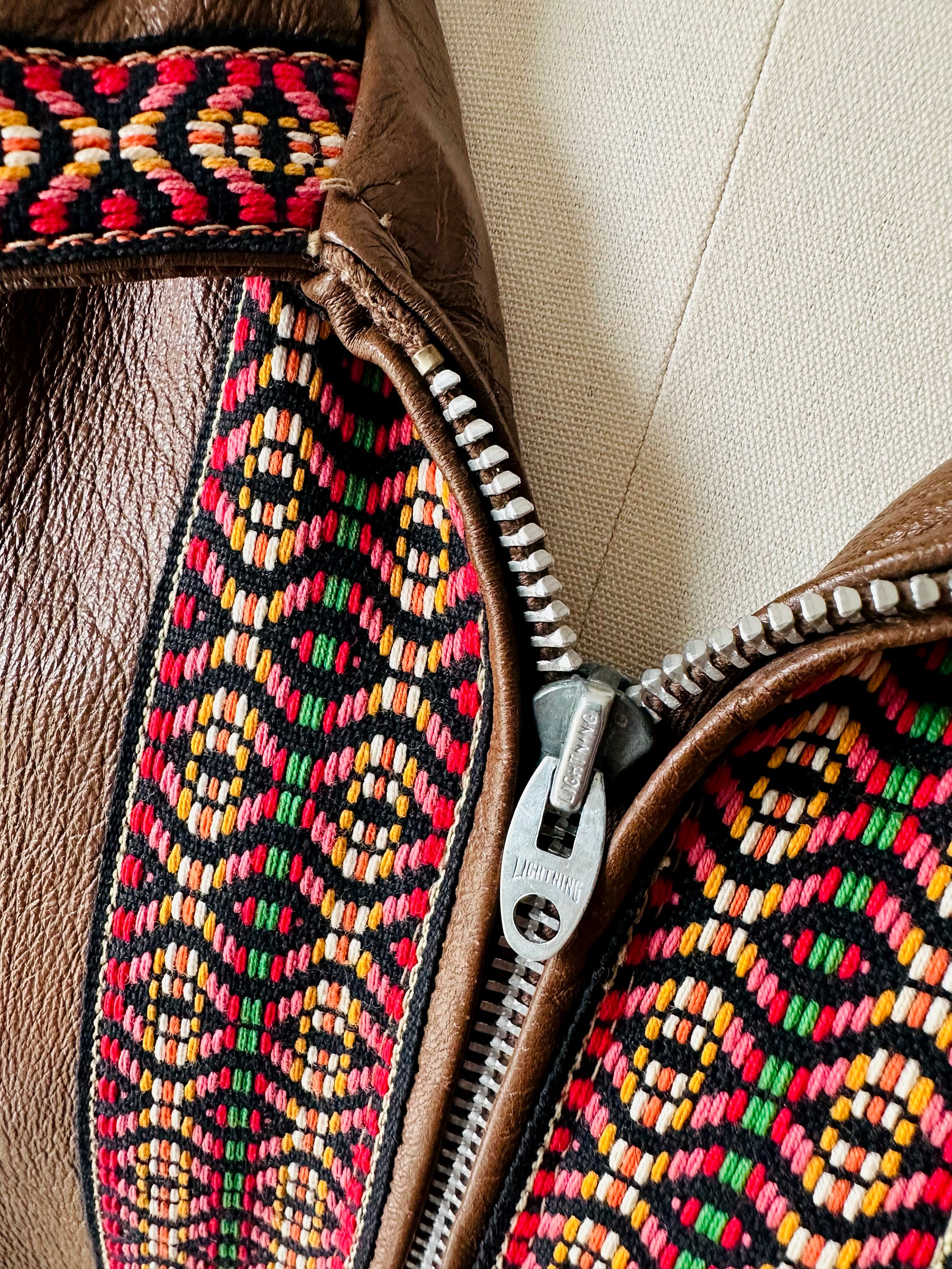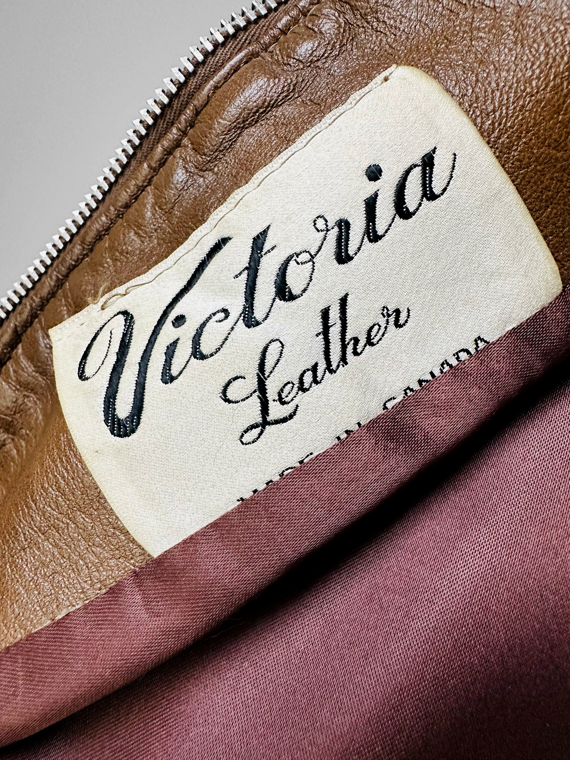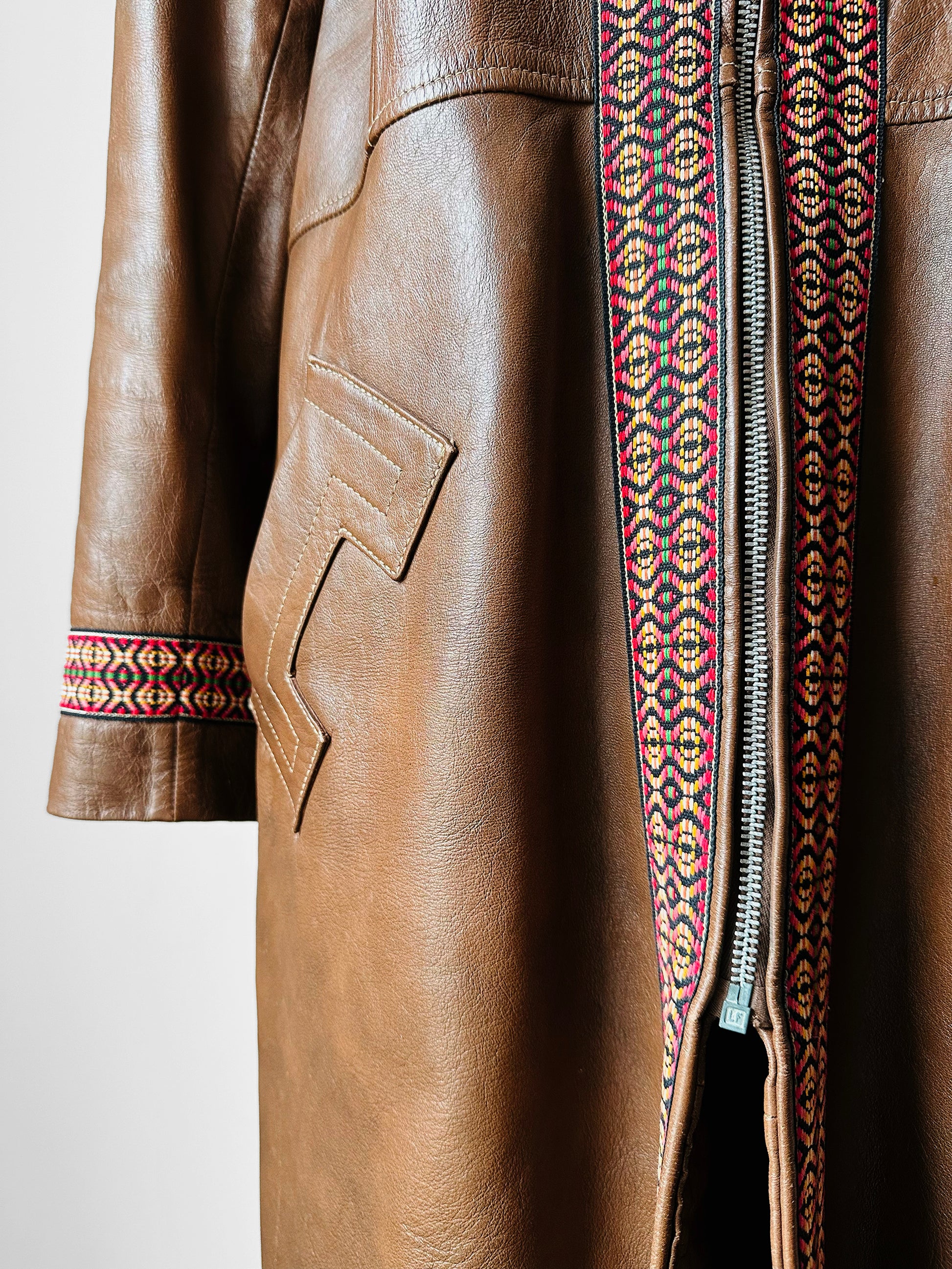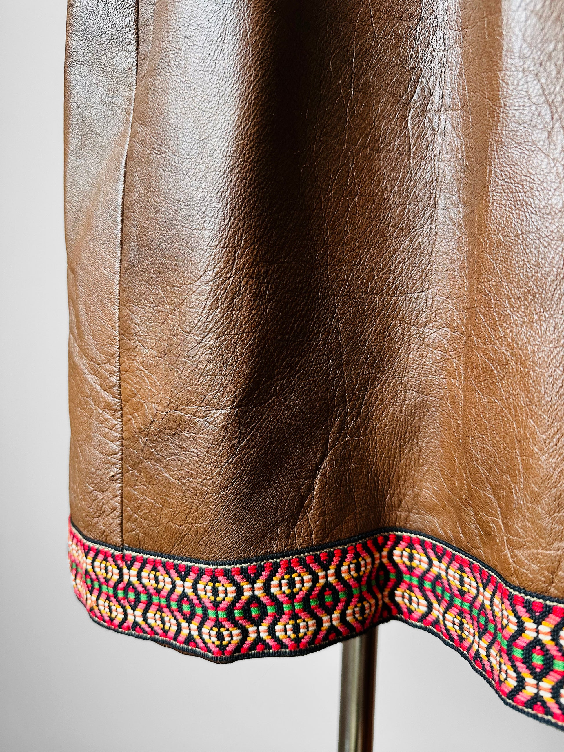 This late 1960s leather coat is done in a whiskey tone and has remained in overall excellent, gently worn, vintage condition through the years. A very warm Fall through Winter weight. Perfect for layering over your favourite cable knit sweater. Metal Lightening brand zipper. Eye catching woven trim detail. Made in Canada. Quality make and feel.
