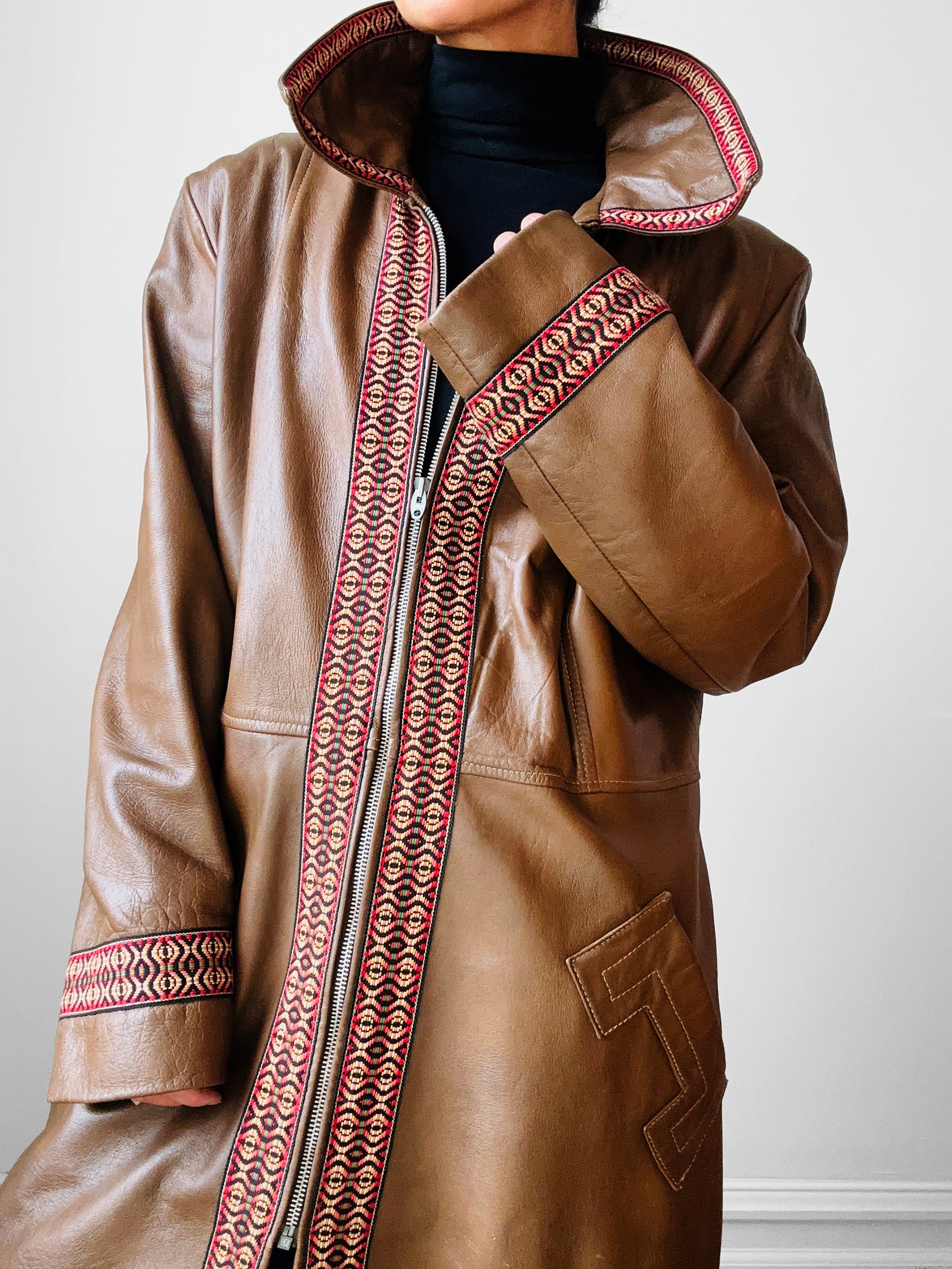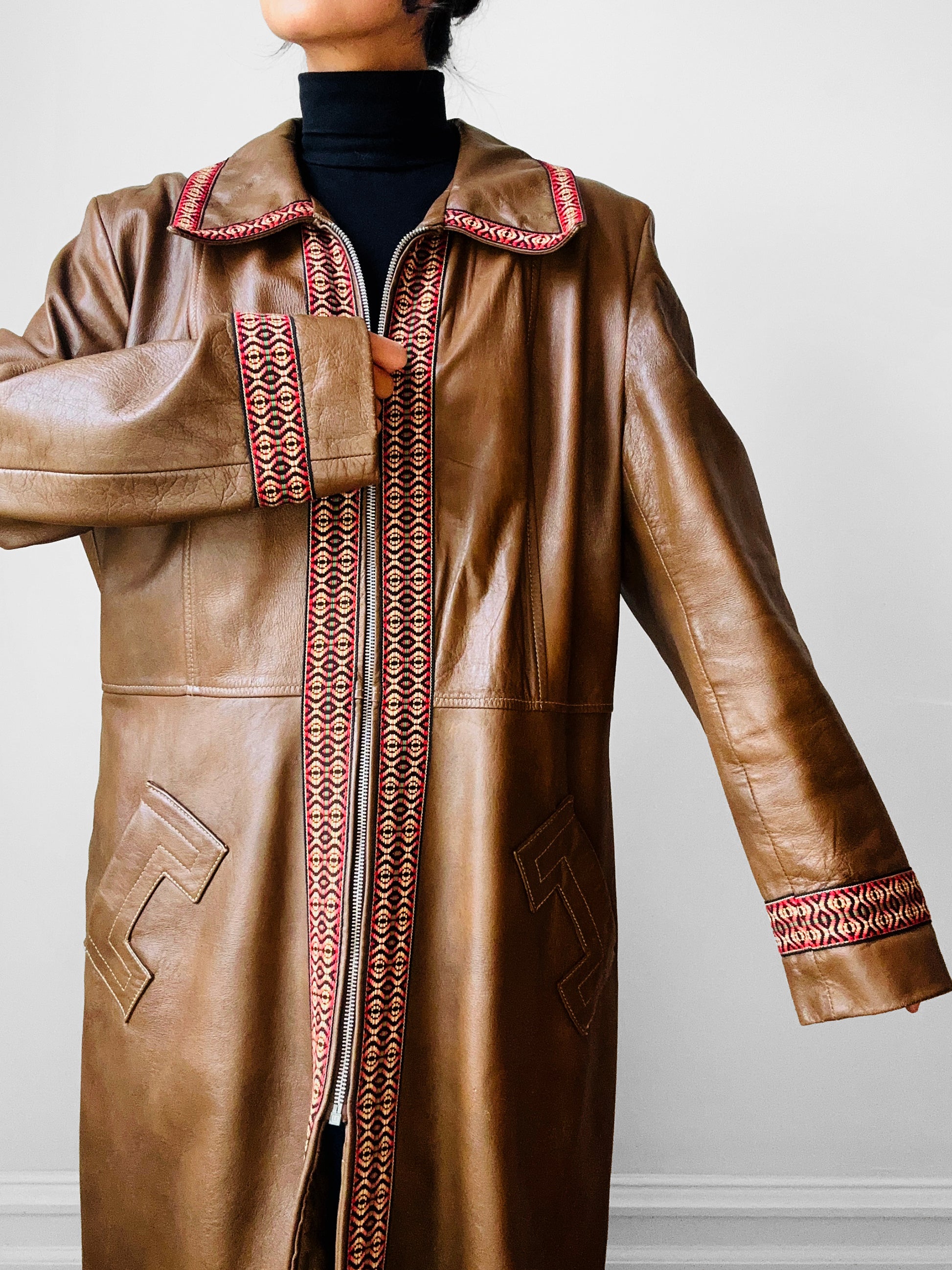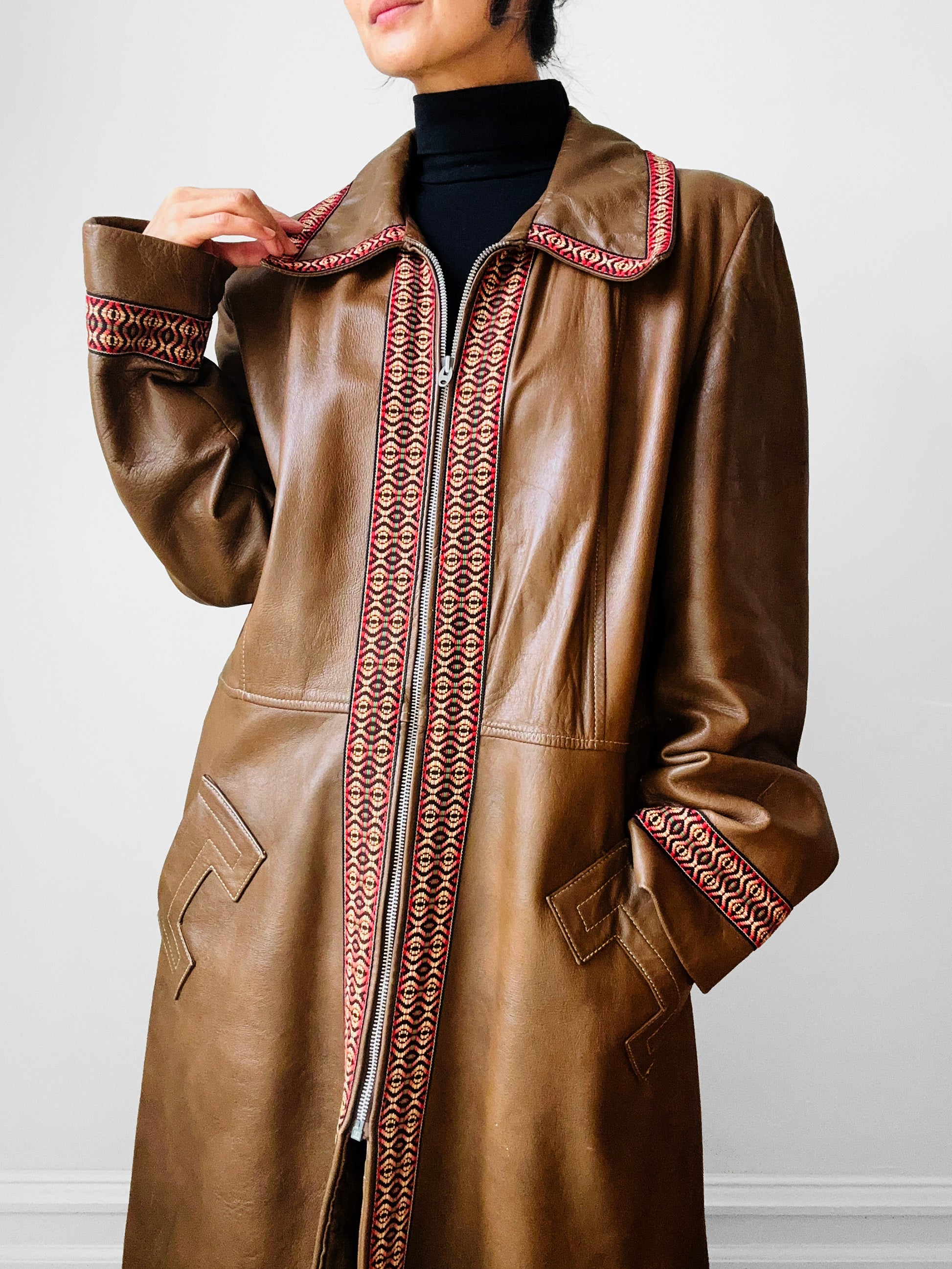 Late 1960s Saddle Brown Leather Woven Trim Metal Zipper Coat - Sz. M