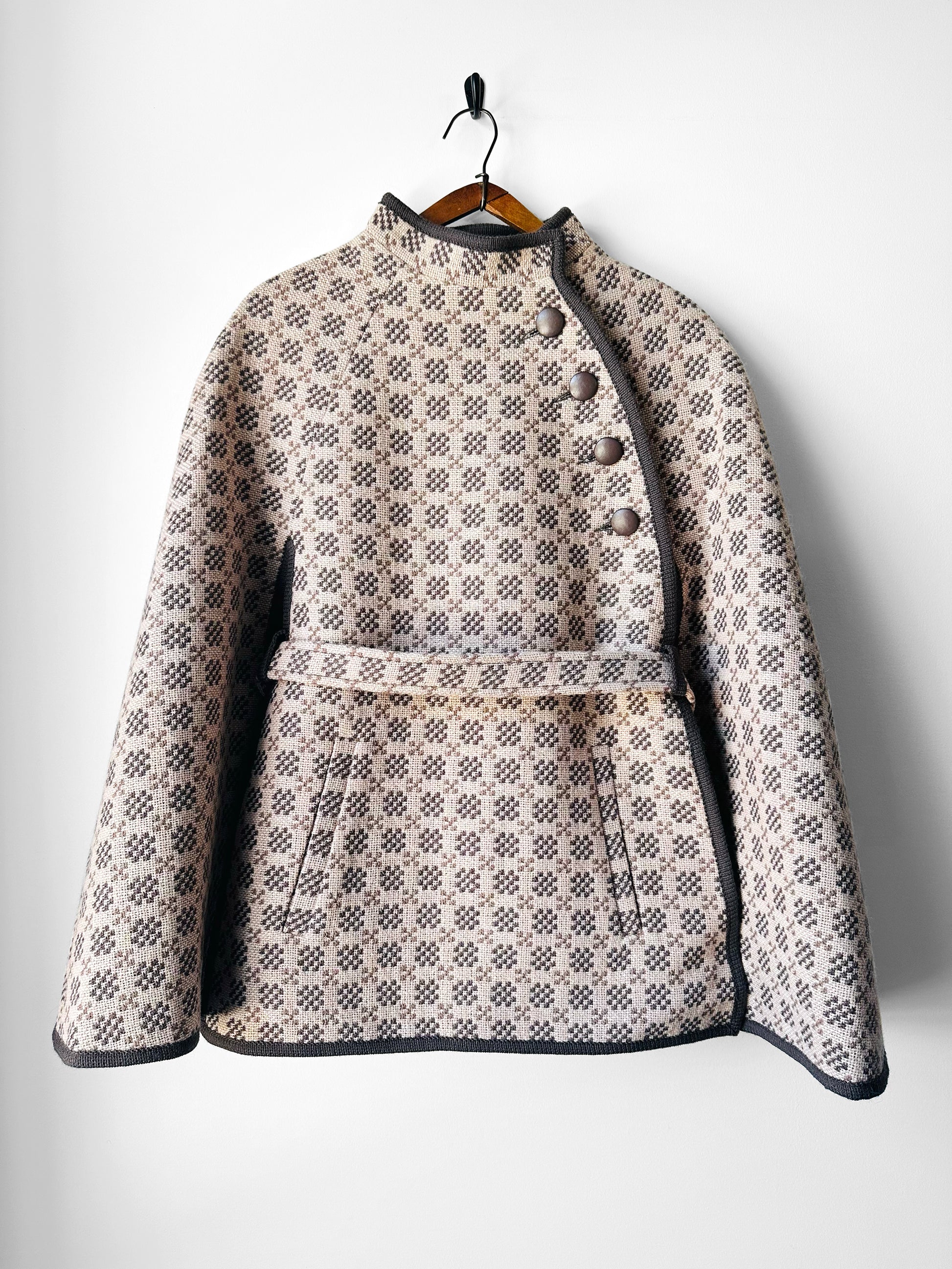 DESCRIPTION: Wrap yourself in heritage style with this striking Welsh wool cape jacket—a true statement of craftsmanship and design. Its bold, geometric tapestry-inspired pattern pays homage to traditional weaving, while the asymmetrical closure and belted waist create a flattering silhouette that exudes mid-century sophistication. Channeling the folk-chic revival of the 1960s and ’70s, this piece blends timeless artistry with effortless elegance, making it the perfect choice for those who appreciate fashion with a story.