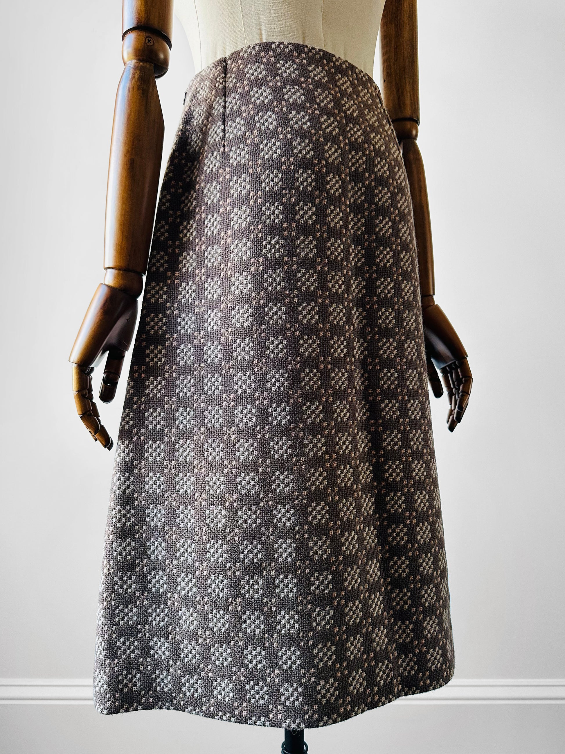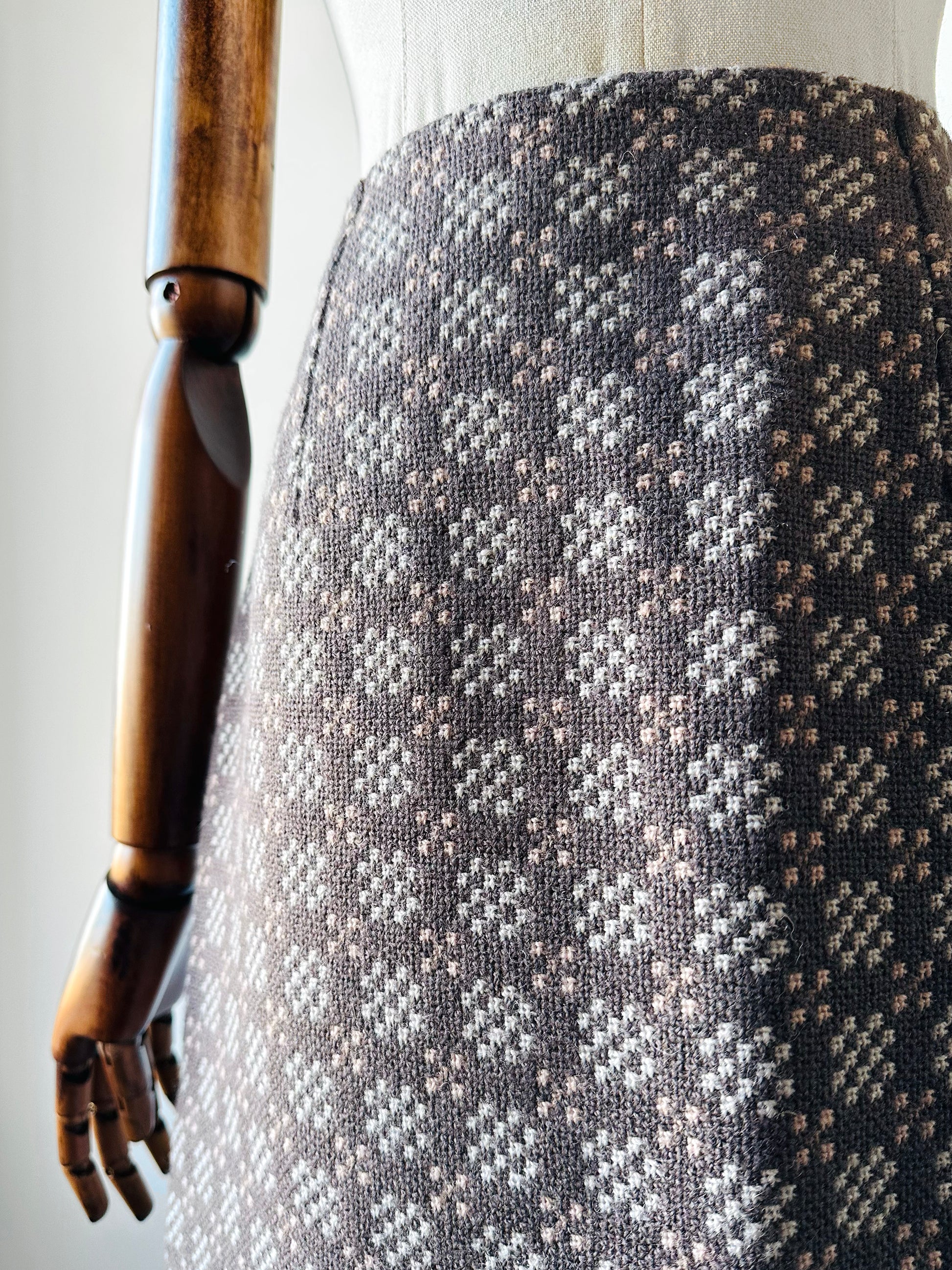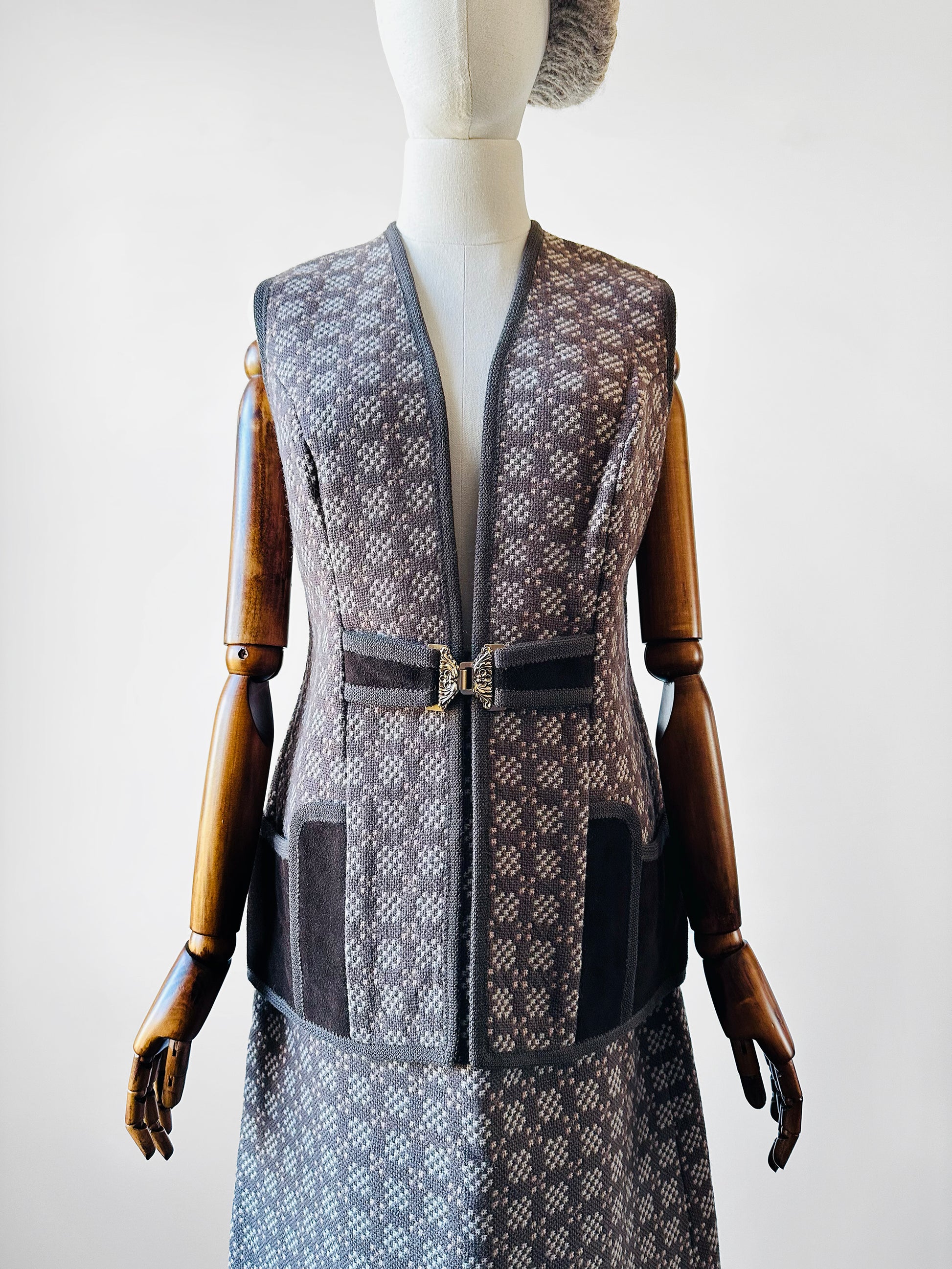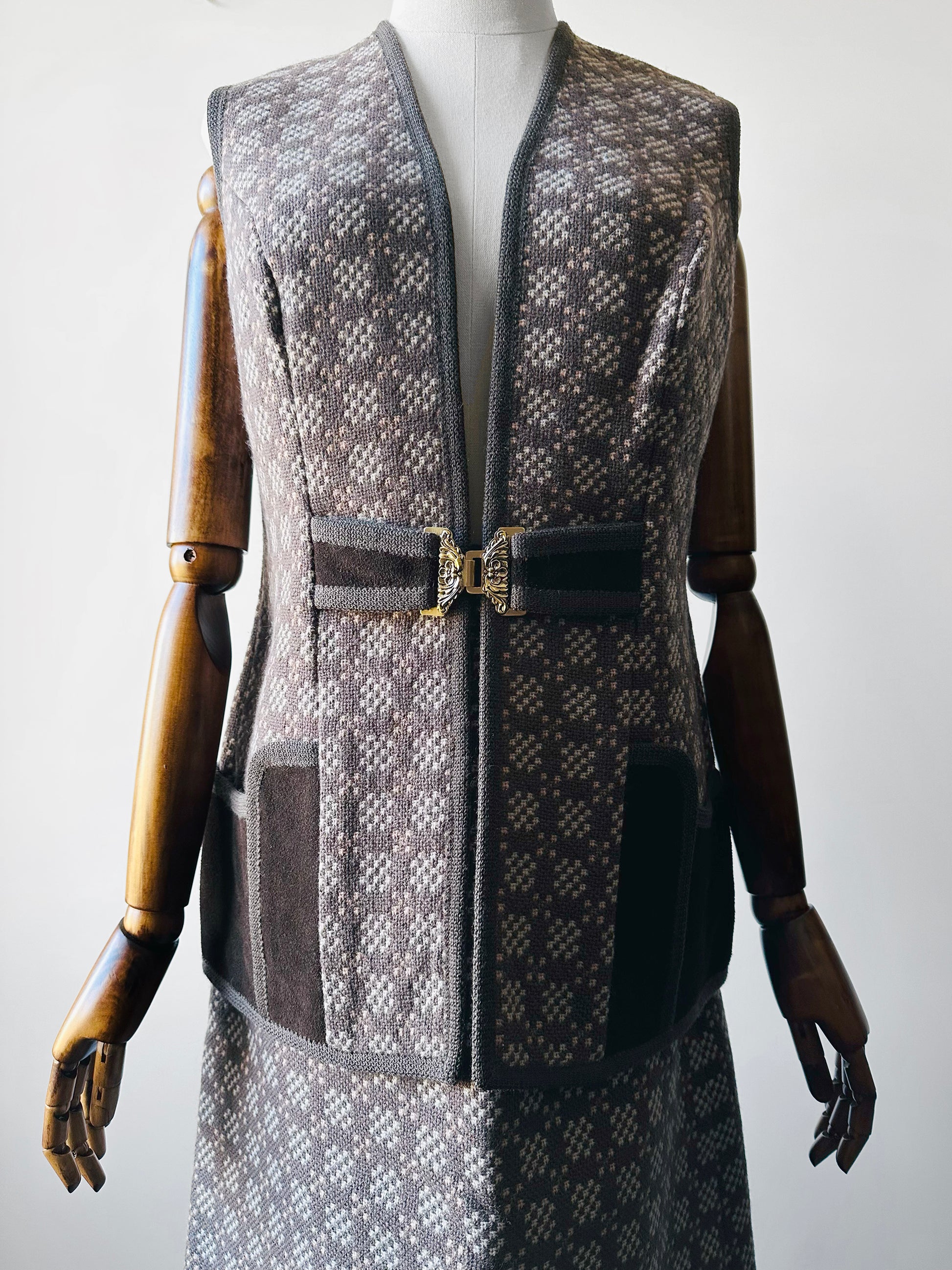1960s - 1970s Taupe and Cream Welsh Woollen Suede Pocket Two-Piece Skirt and Vest Set