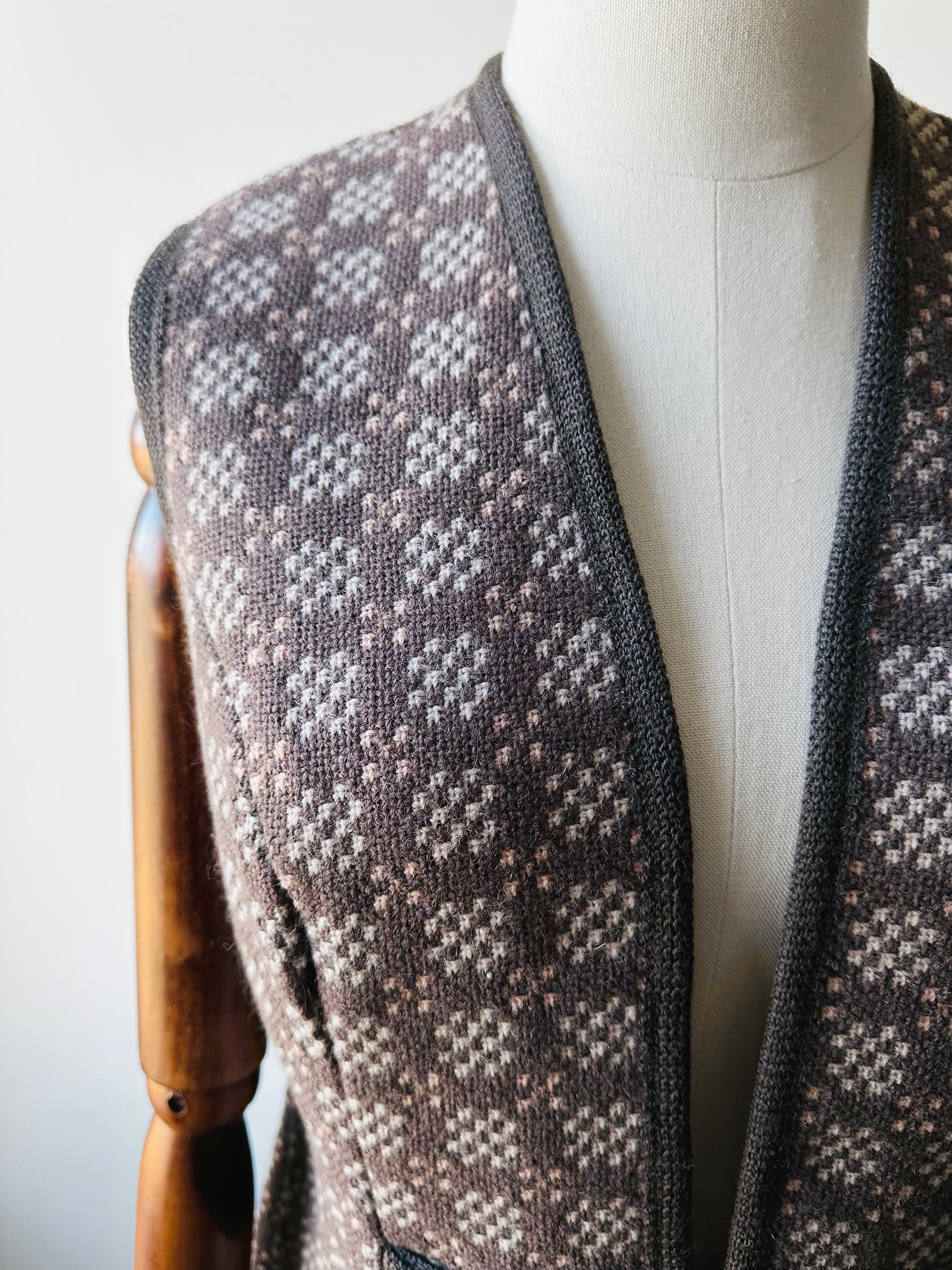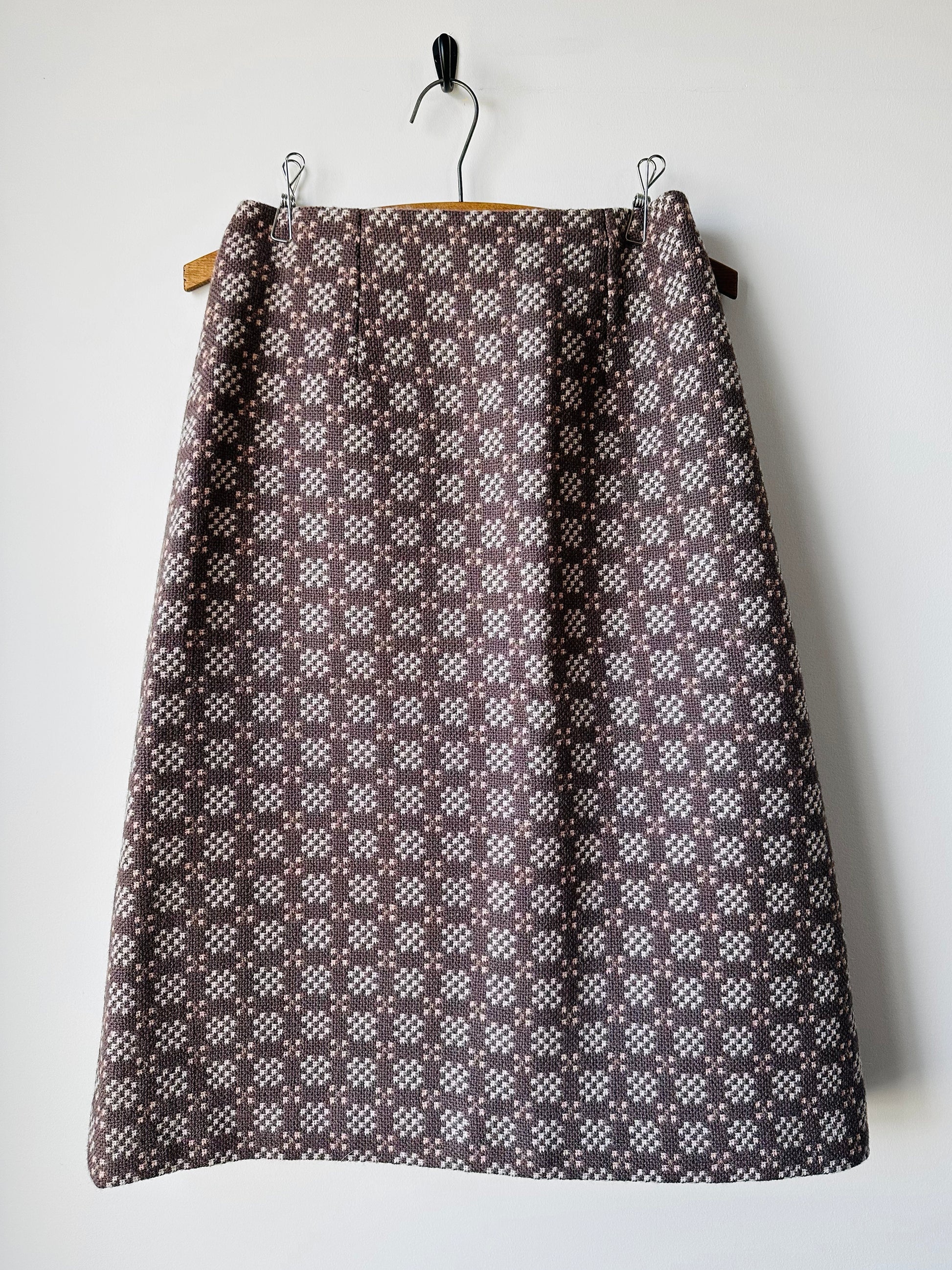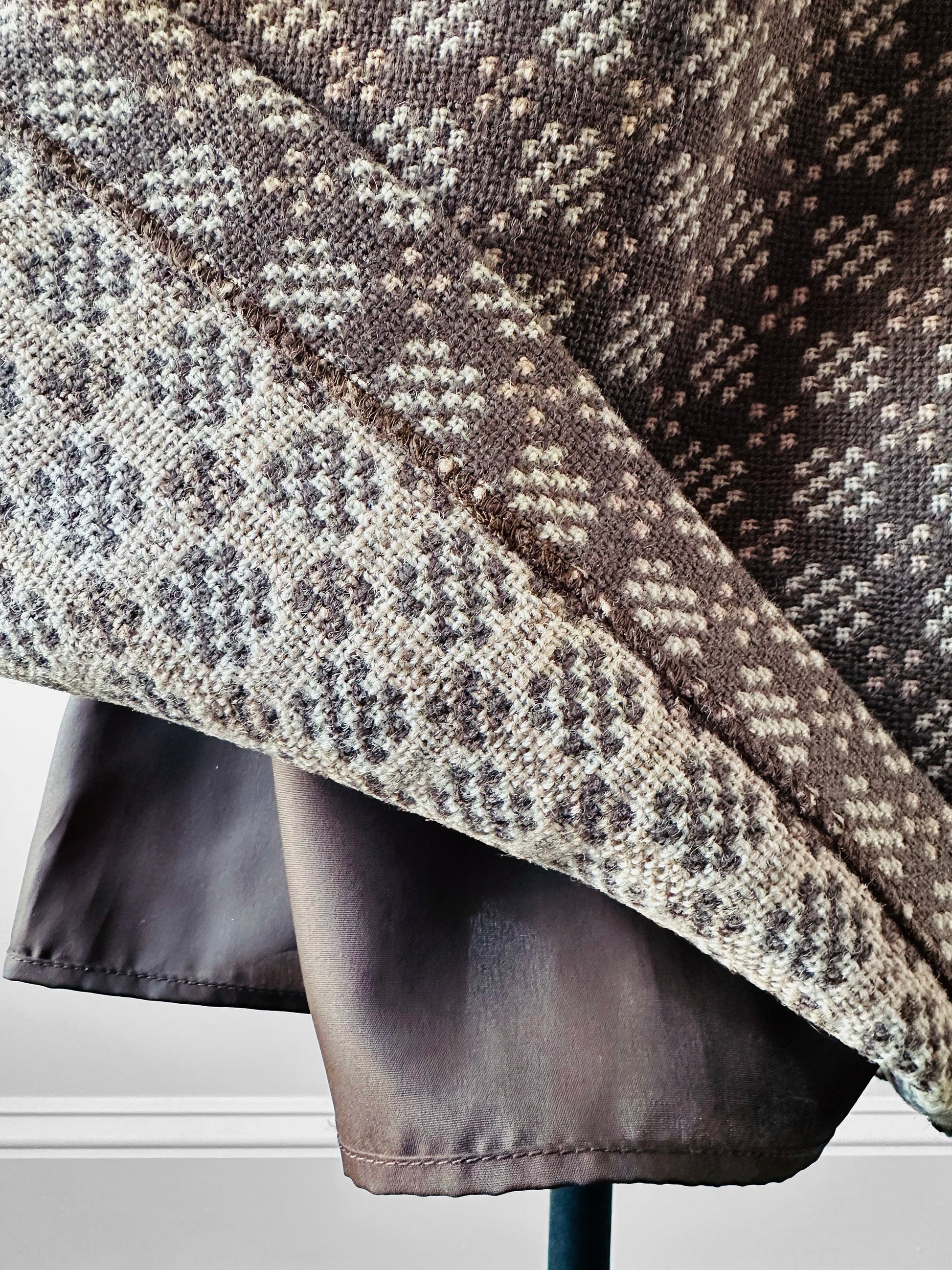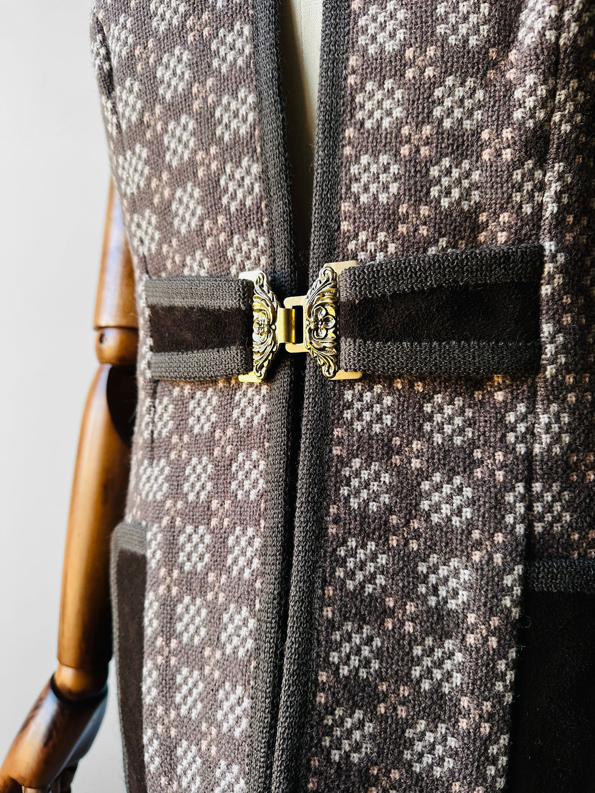 DESCRIPTION: Turn heads with this striking vest and skirt set—a true celebration of Welsh heritage and timeless style. Crafted in the iconic Welsh Tapestry weave, the fabric boasts intricate geometric patterns that are as bold as they are beautiful, rendered in rich, earthy tones that speak to tradition. The reversible design offers versatility, while the pure new wool ensures a luxurious feel and enduring quality. Finished with a distinctive clasp closure, this set is more than vintage—it’s a statement piece for those who appreciate artistry, authenticity, and effortless elegance. Wear as set or separates, either way you're turning heads for all the right reasons.