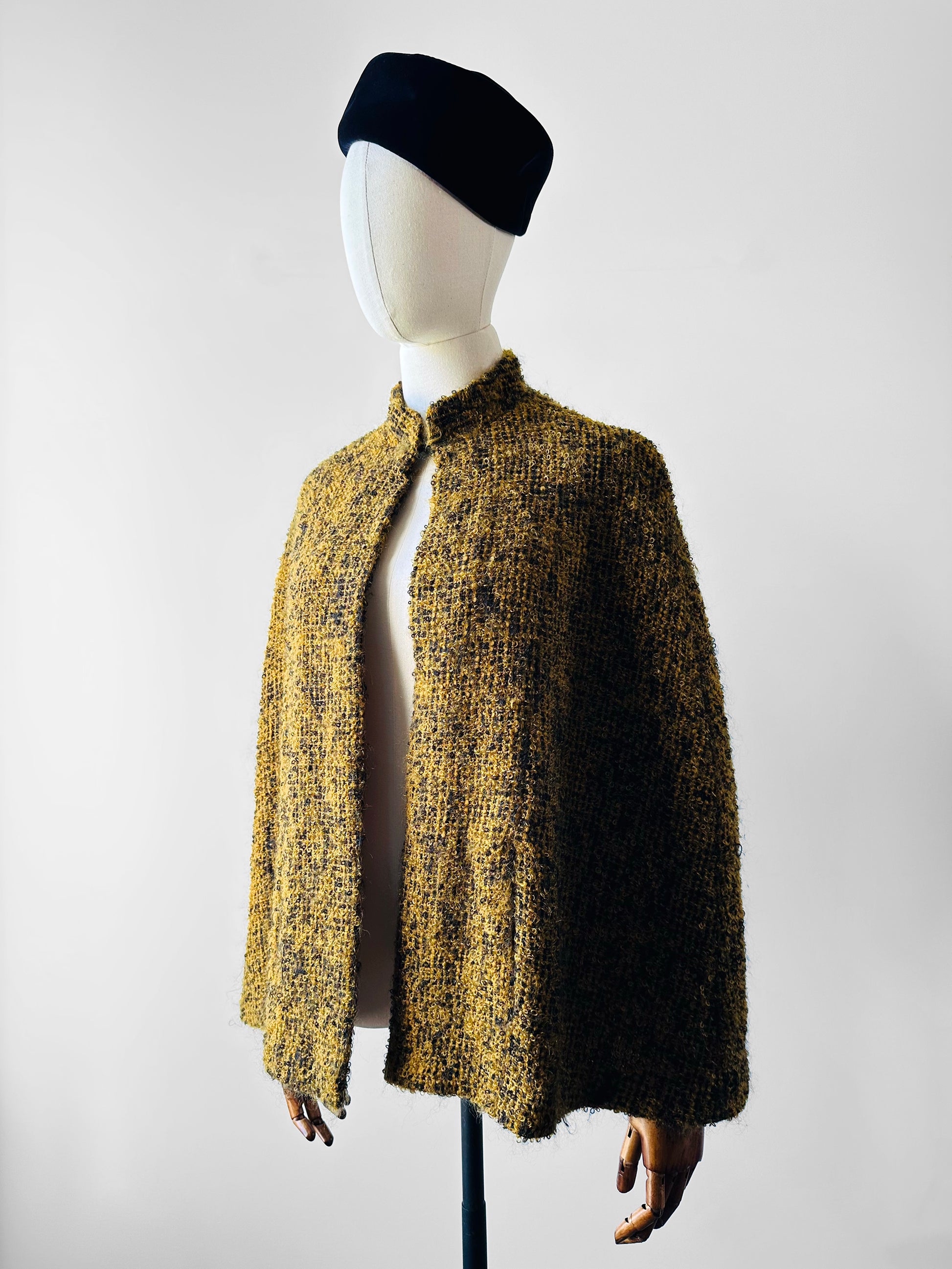 1960s - 1970s Yellow and Black High Collar Open Front Tweed Cape