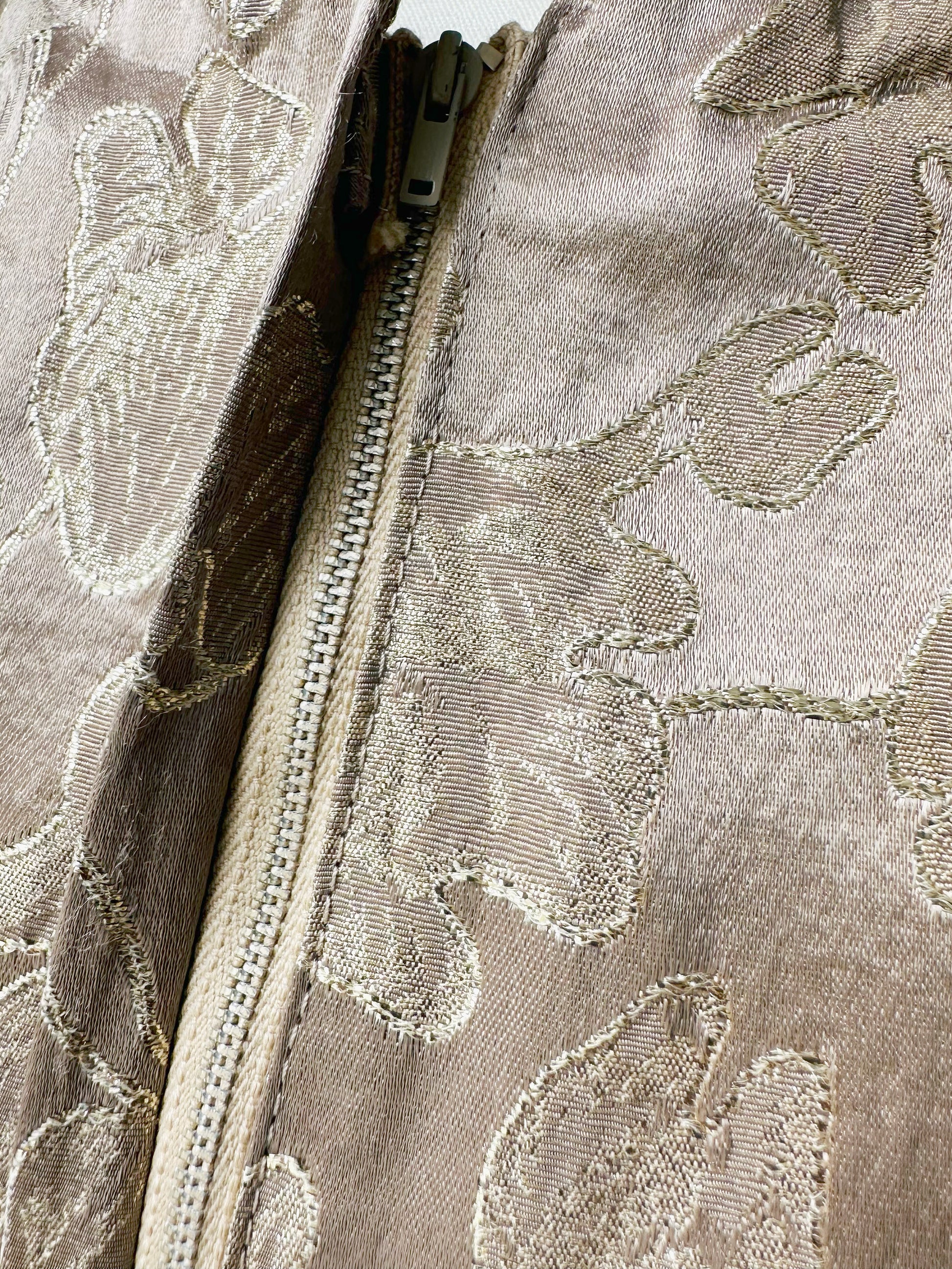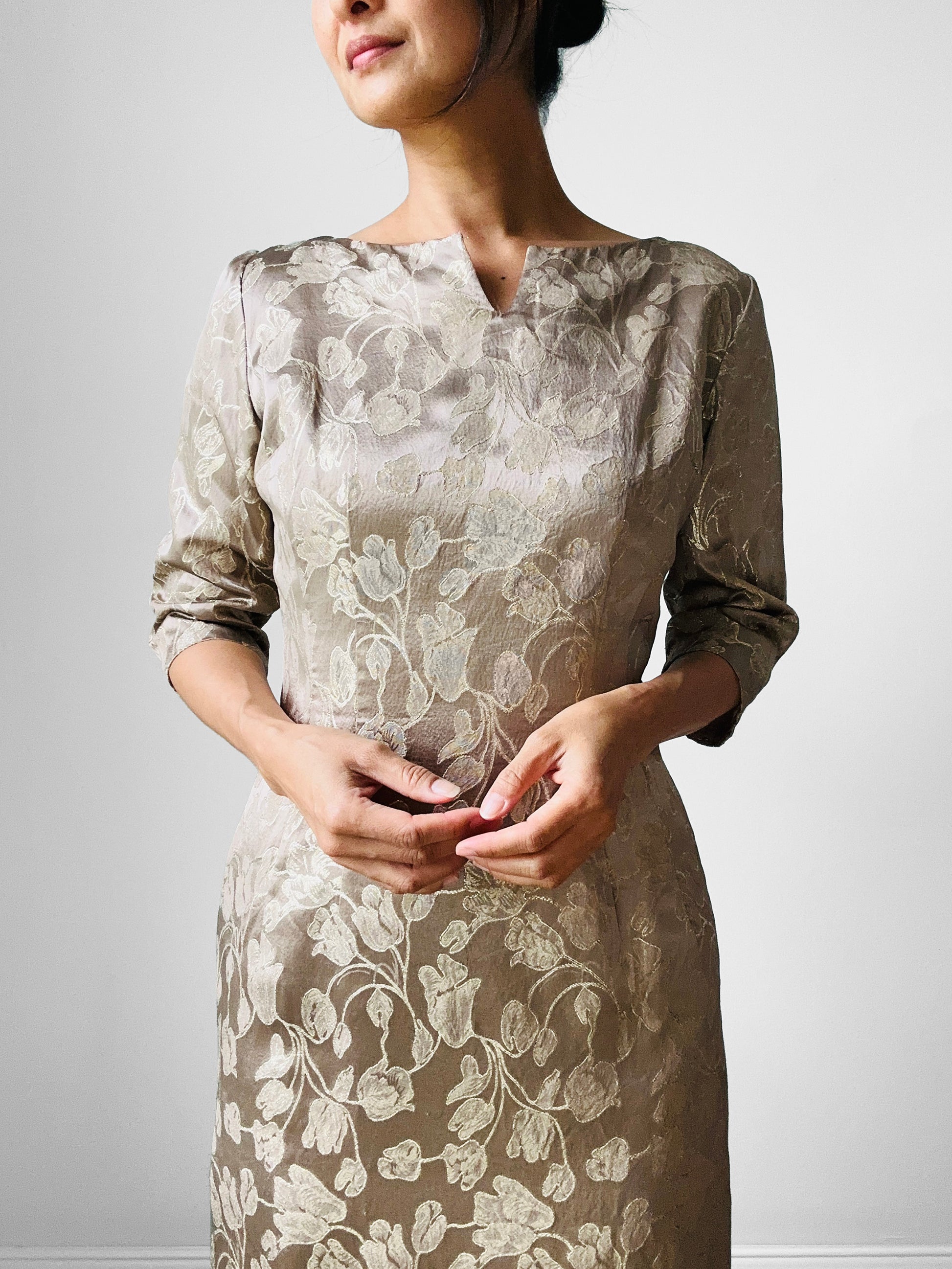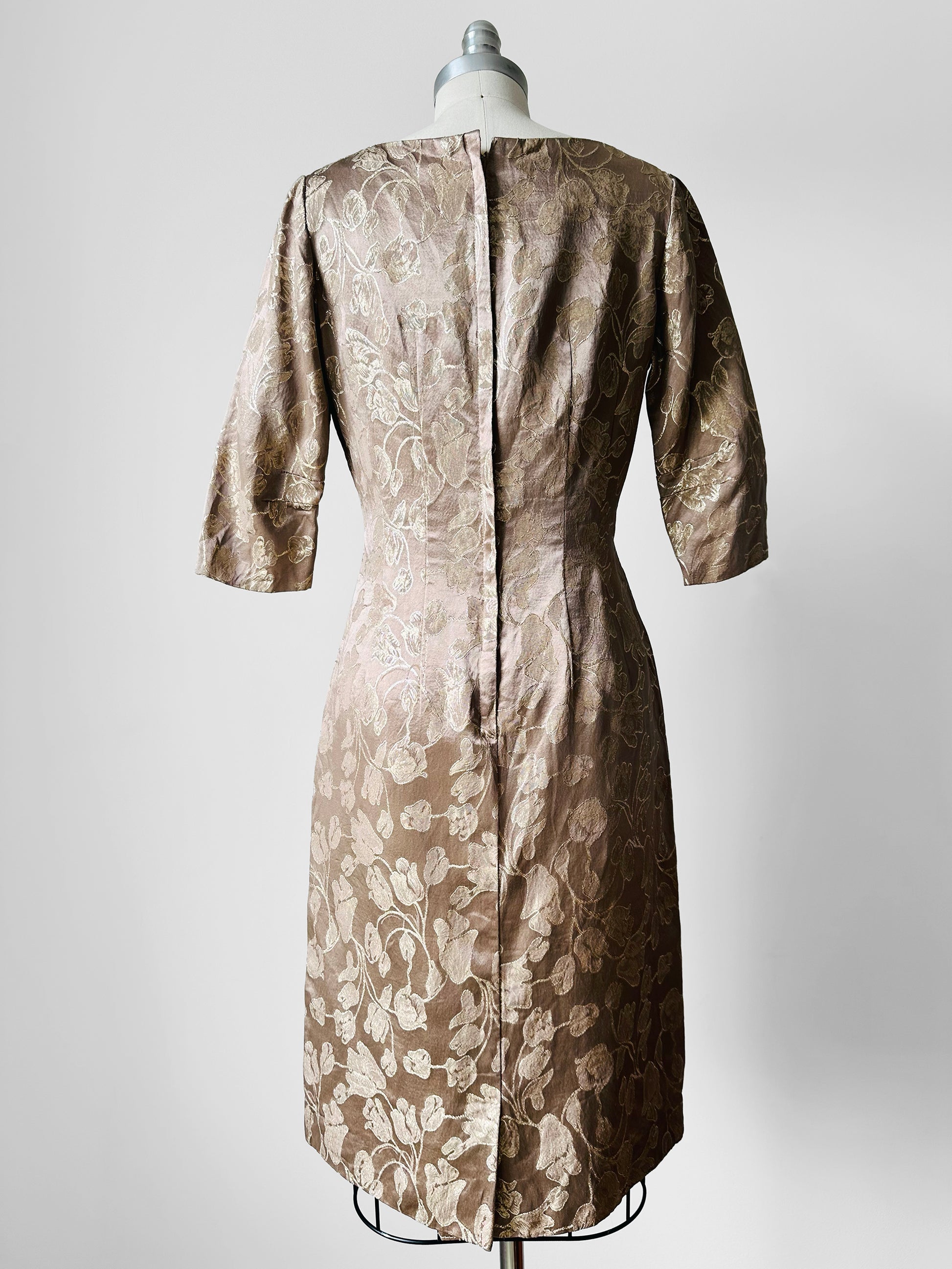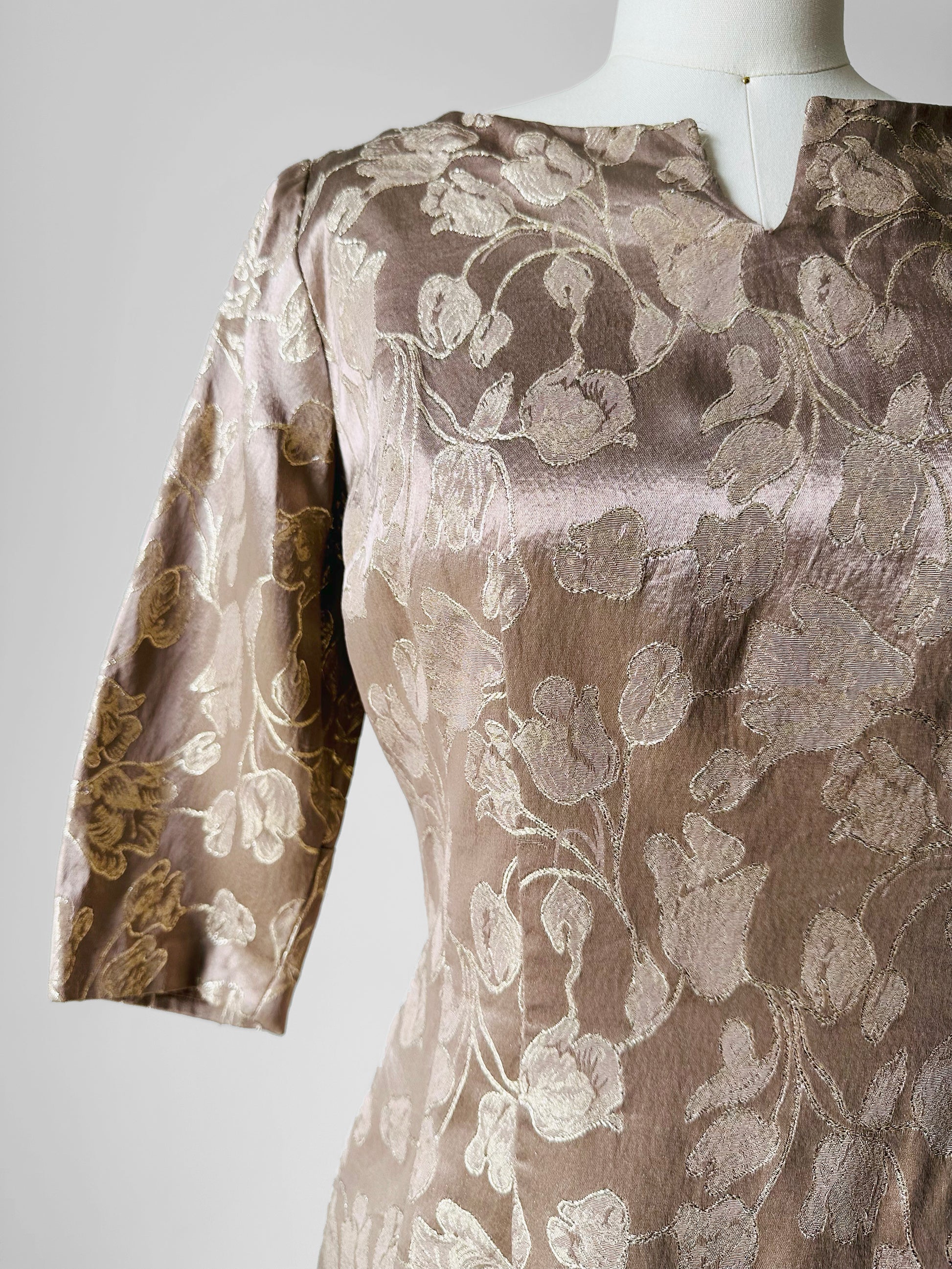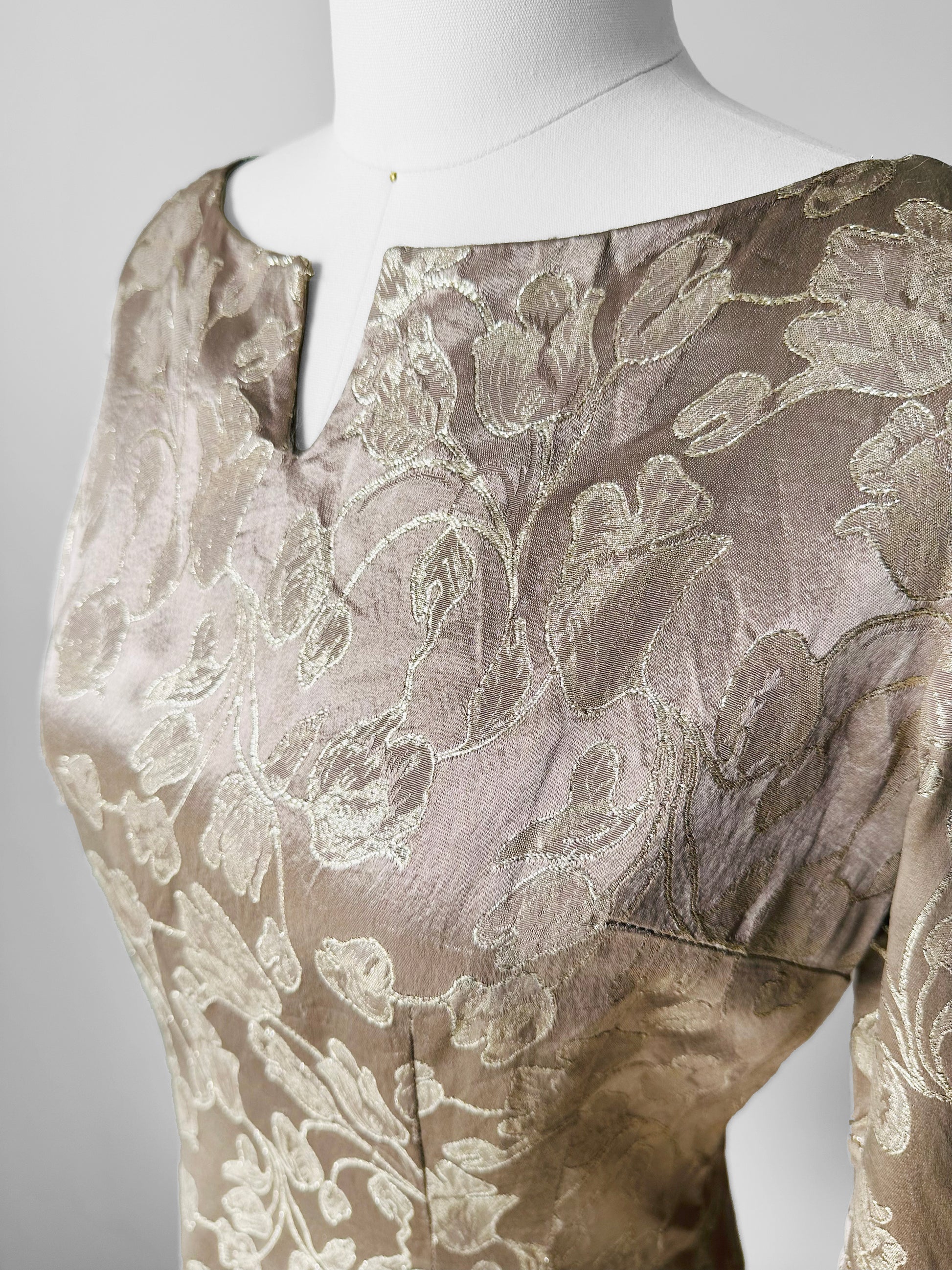 DESCRIPTIONS: This mid-century beauty exudes timeless elegance. Crafted in a shimmering taupe-champagne hue, the fabric catches the light with a subtle, luminous shift. The tone-on-tone floral pattern adds depth and texture, its slightly raised design accented with delicate metallic threads for a refined touch. This dress is a true classic—perfect for collectors or anyone seeking a statement piece that embodies the grace and Mid-Century glamour.