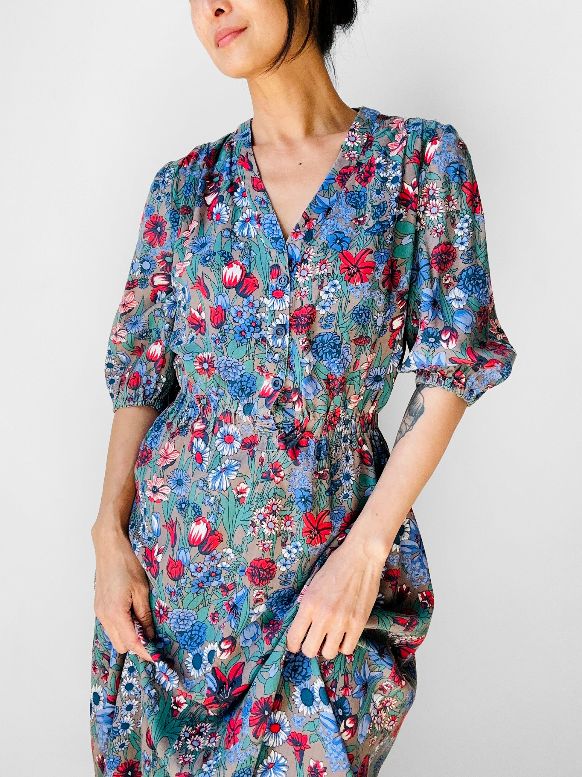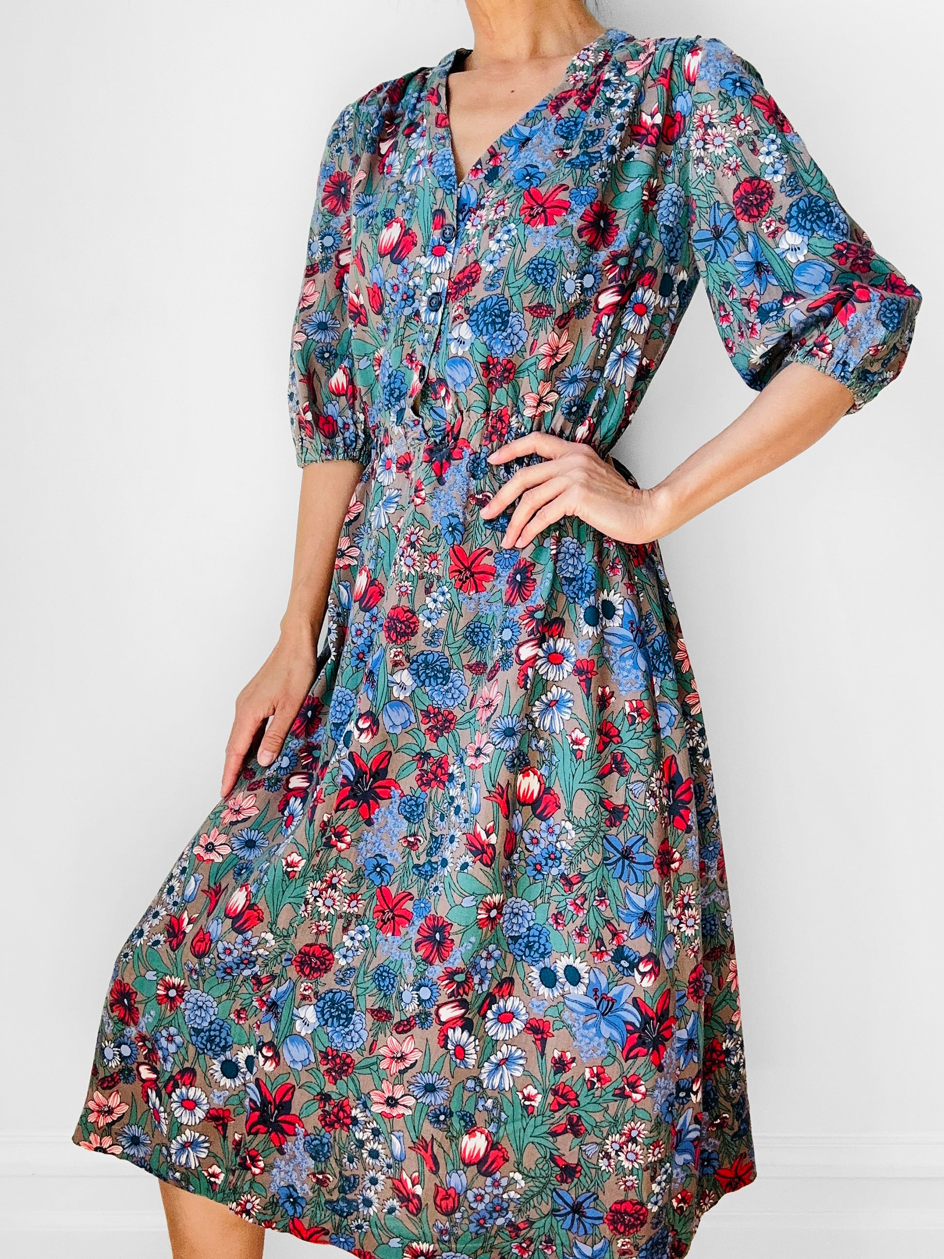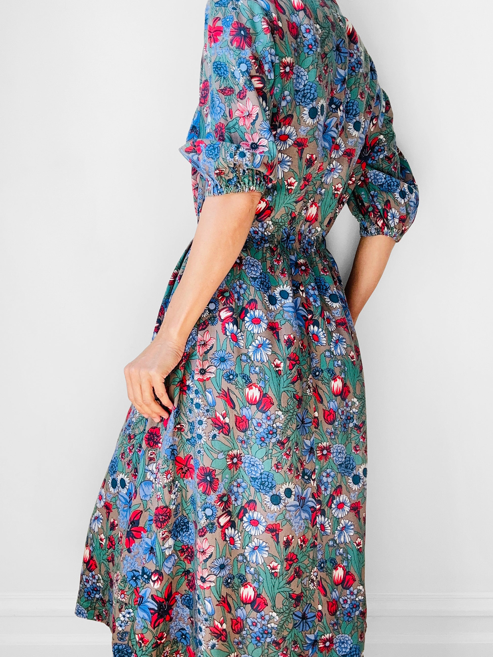 Love the laid back French country style of this beautiful floral cotton dress. Such a light and airy feel to the fabric that you know is just going to bet better and softer with time. Comfortable elastic waist. In excellent, gently worn, vintage condition.