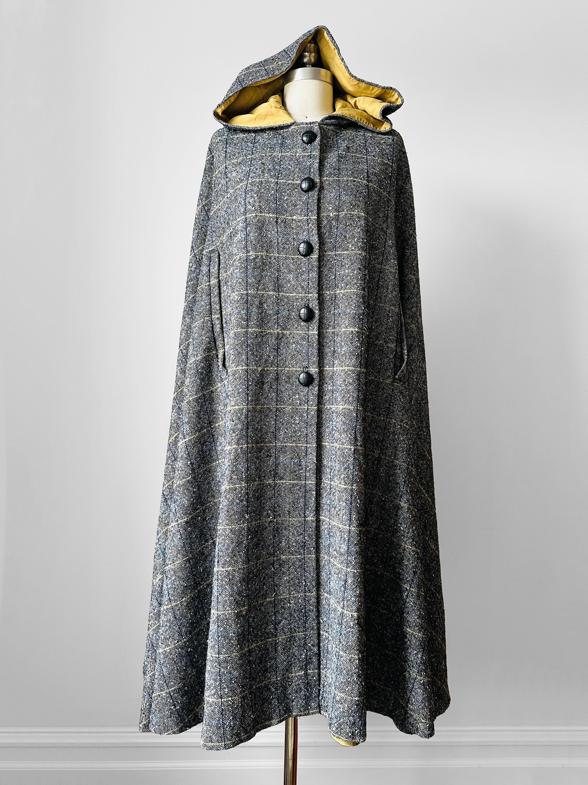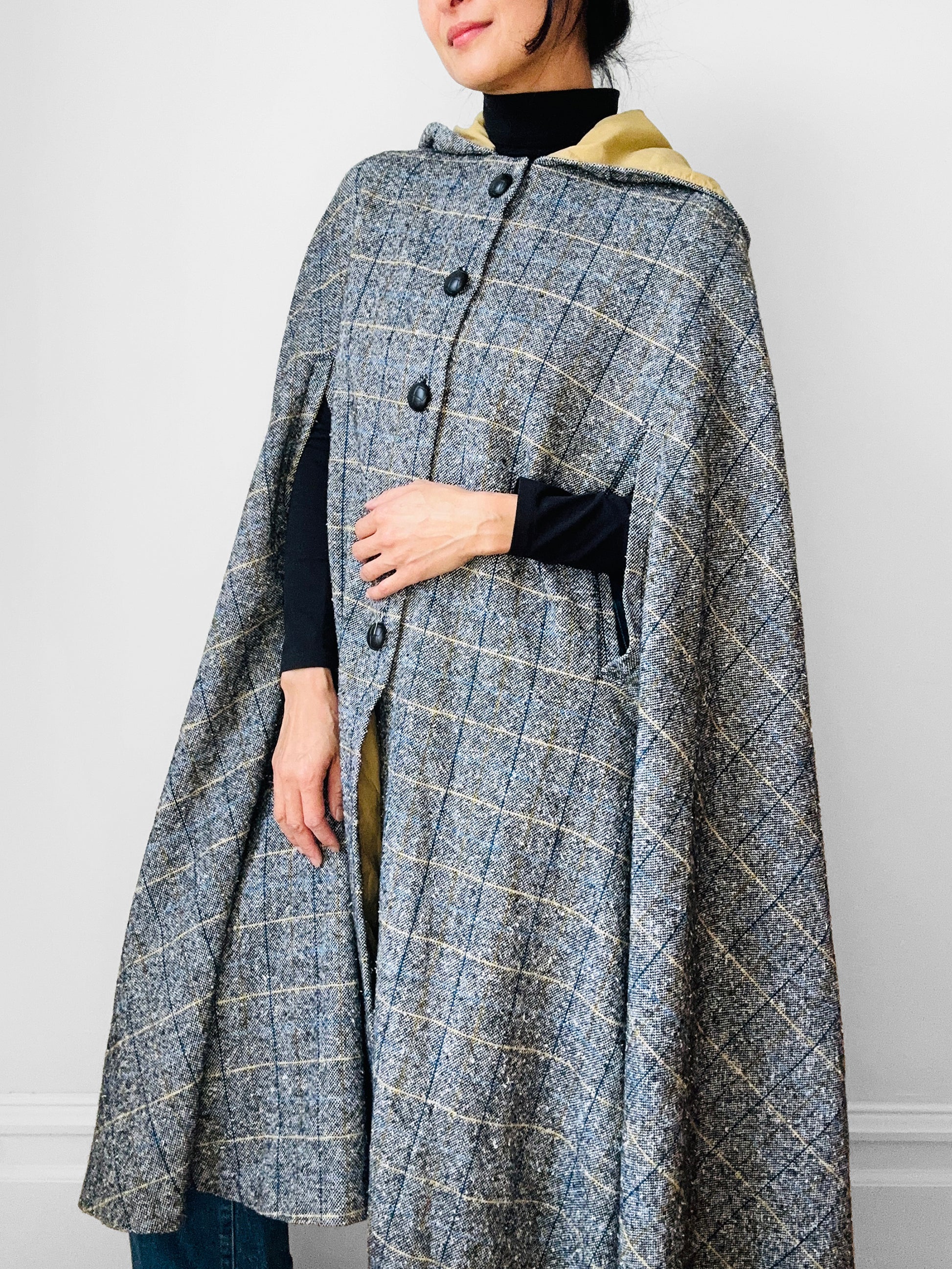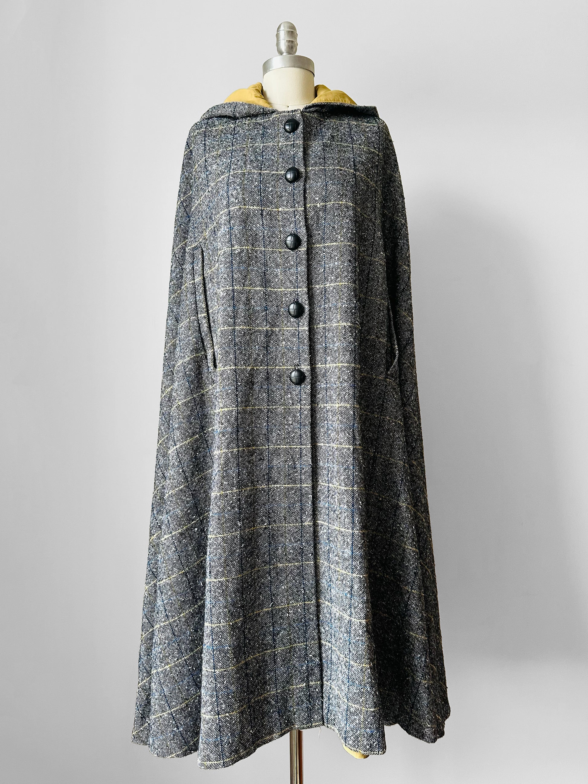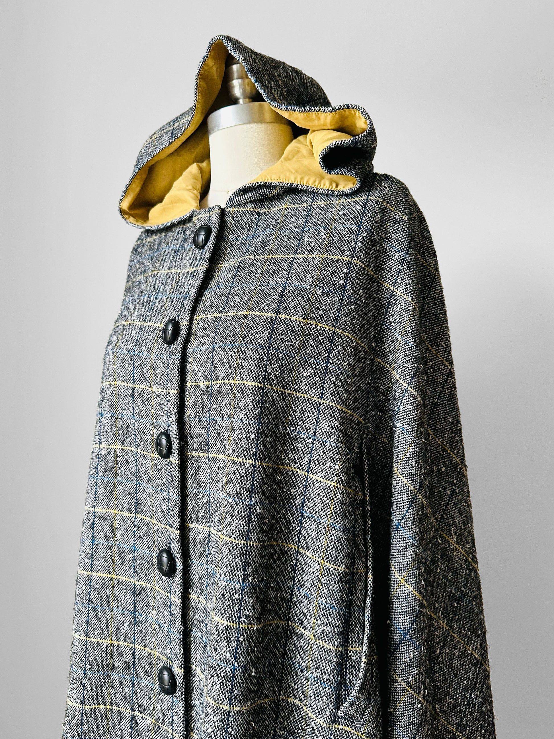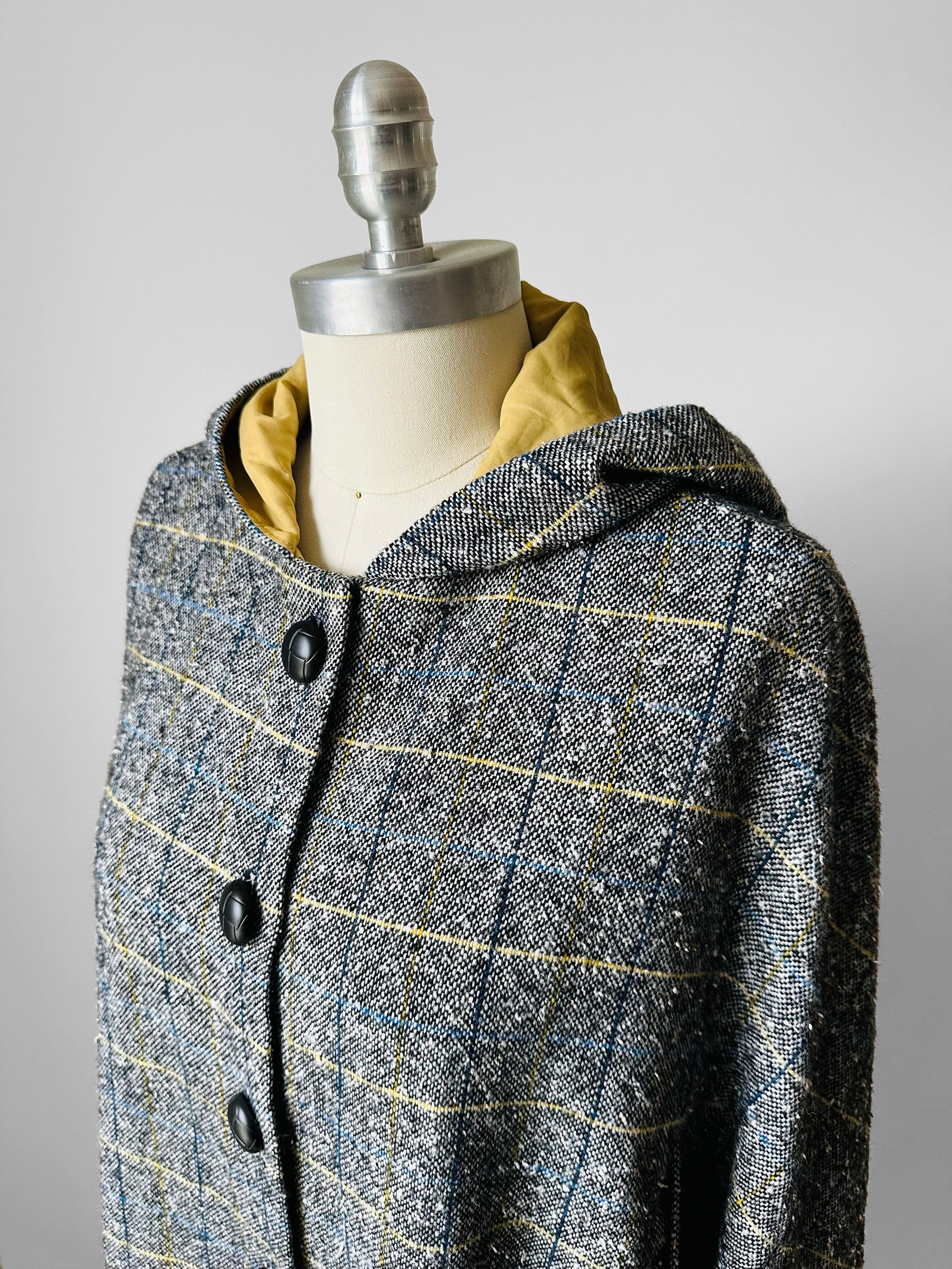 1960s Grey Plaid Hooded Cape Coat - Sz. O/S
