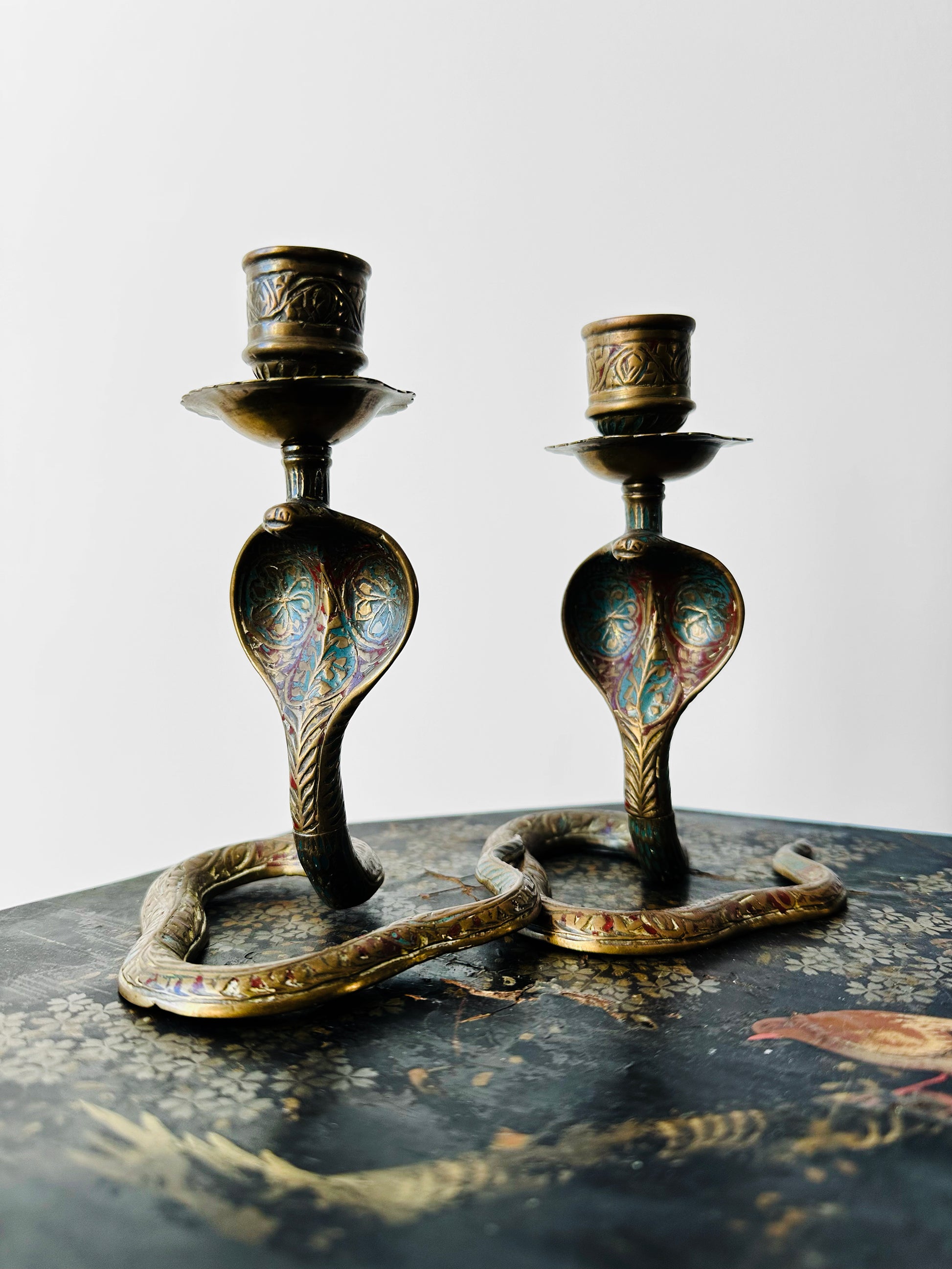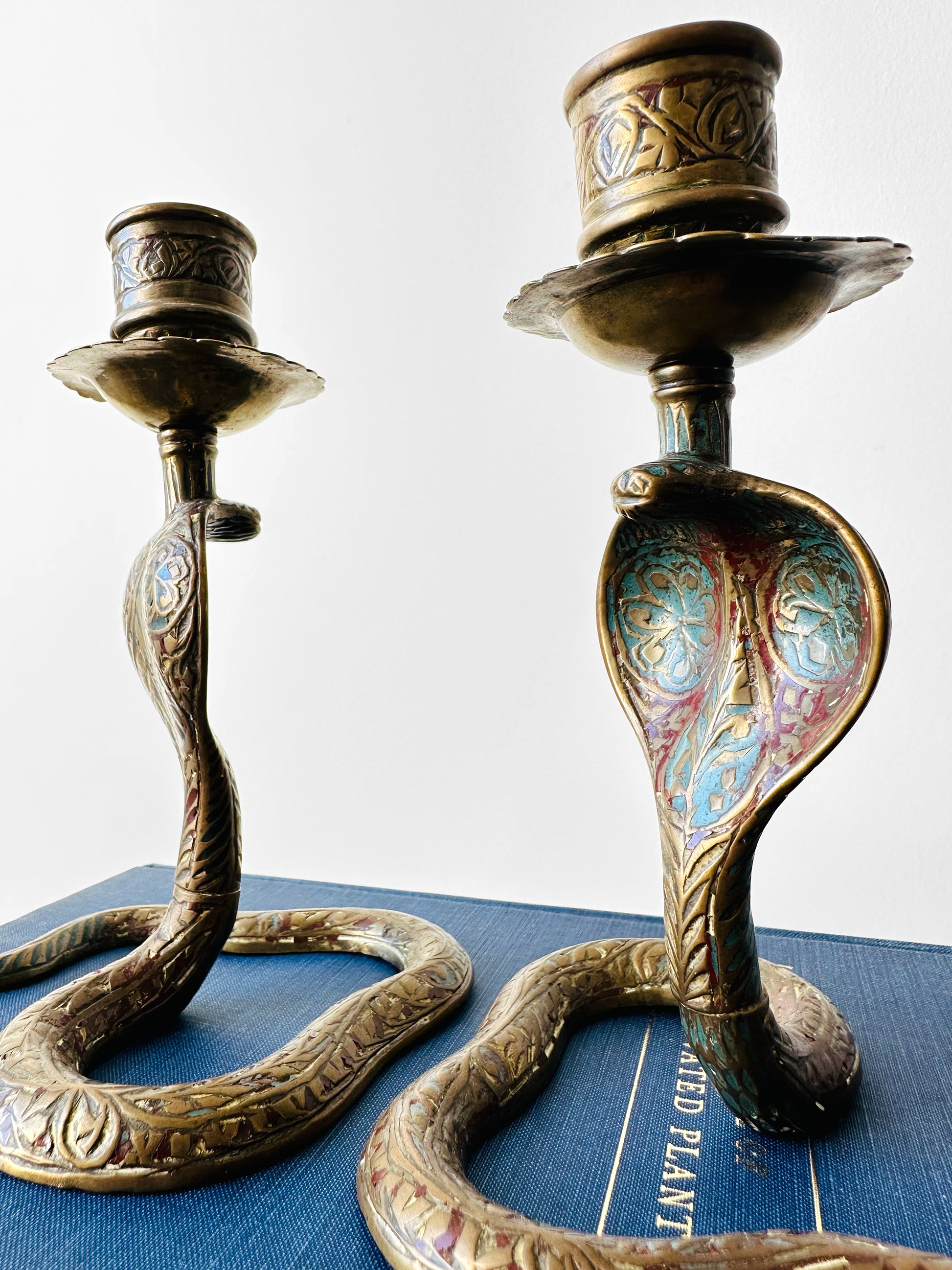 1960s Mid 20th Century Etched Hand-Painted Brass Cobra Candleholders Set