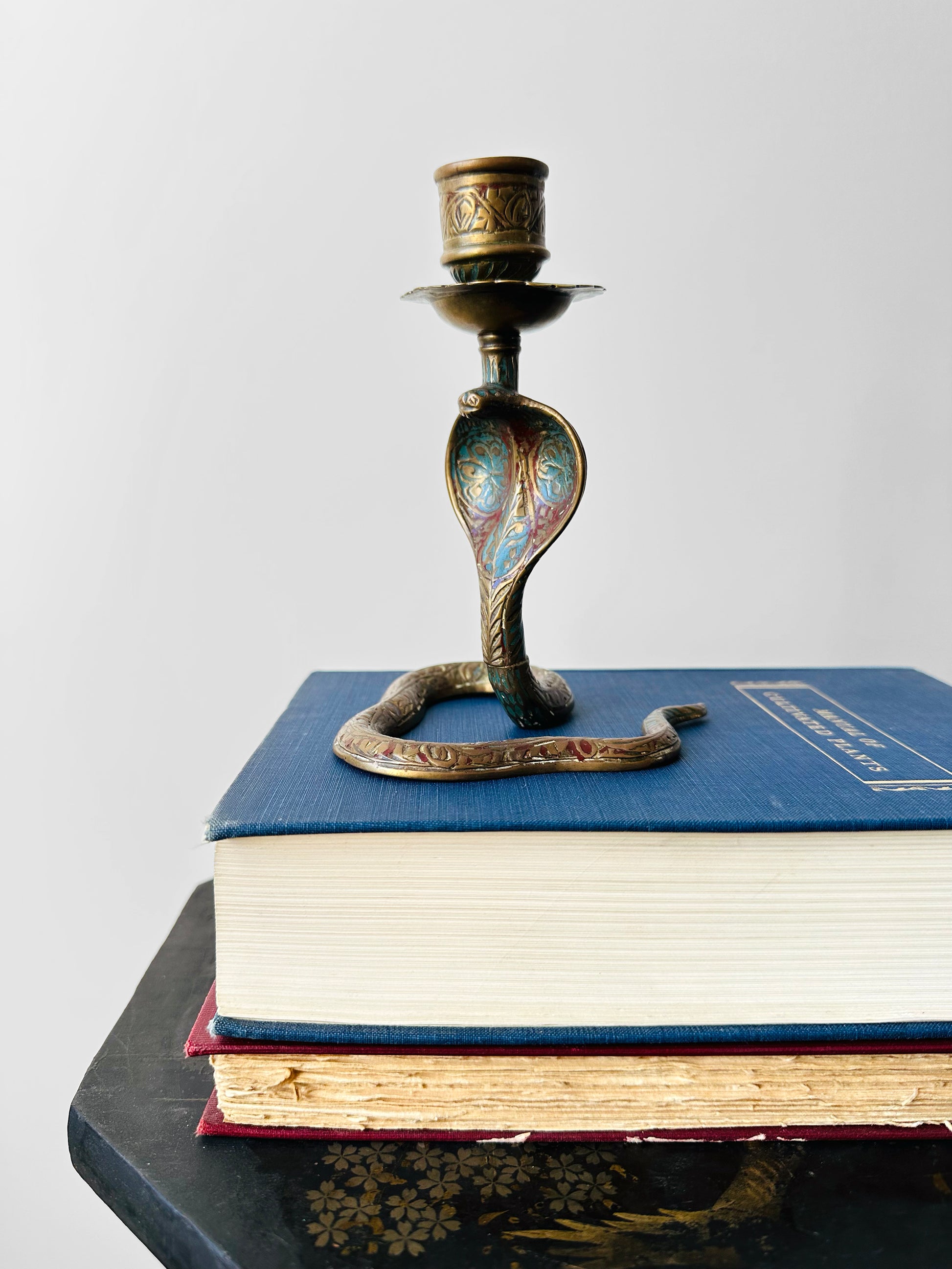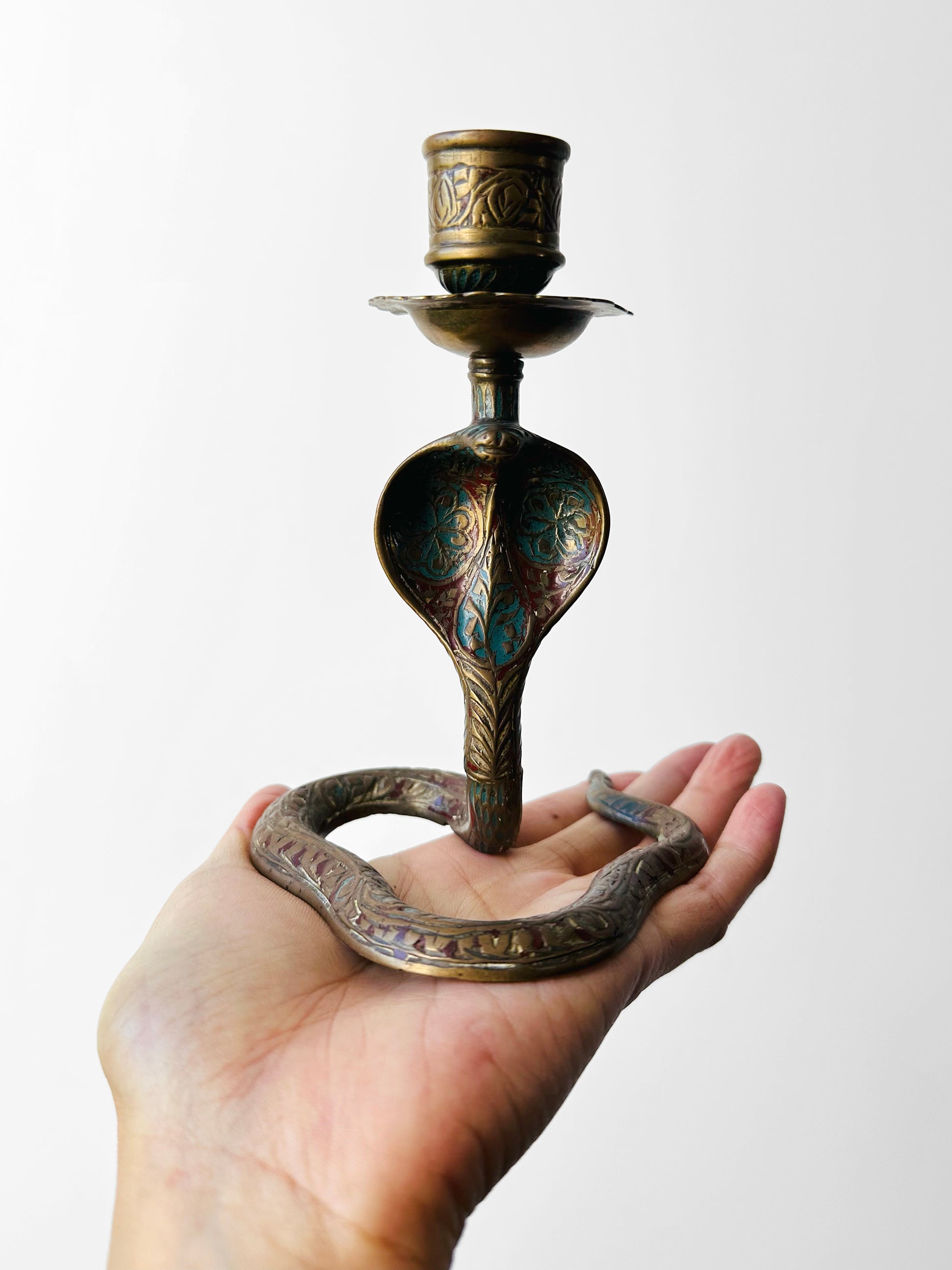 CONDITION: This item is in overall, excellent, gently worn, vintage condition with some surface wear and patina. The entire piece from top to tail screws apart into 4 sections. The top on one of the cobras doesn't sit perfectly straight when screwed in, but the candle can be positioned to.