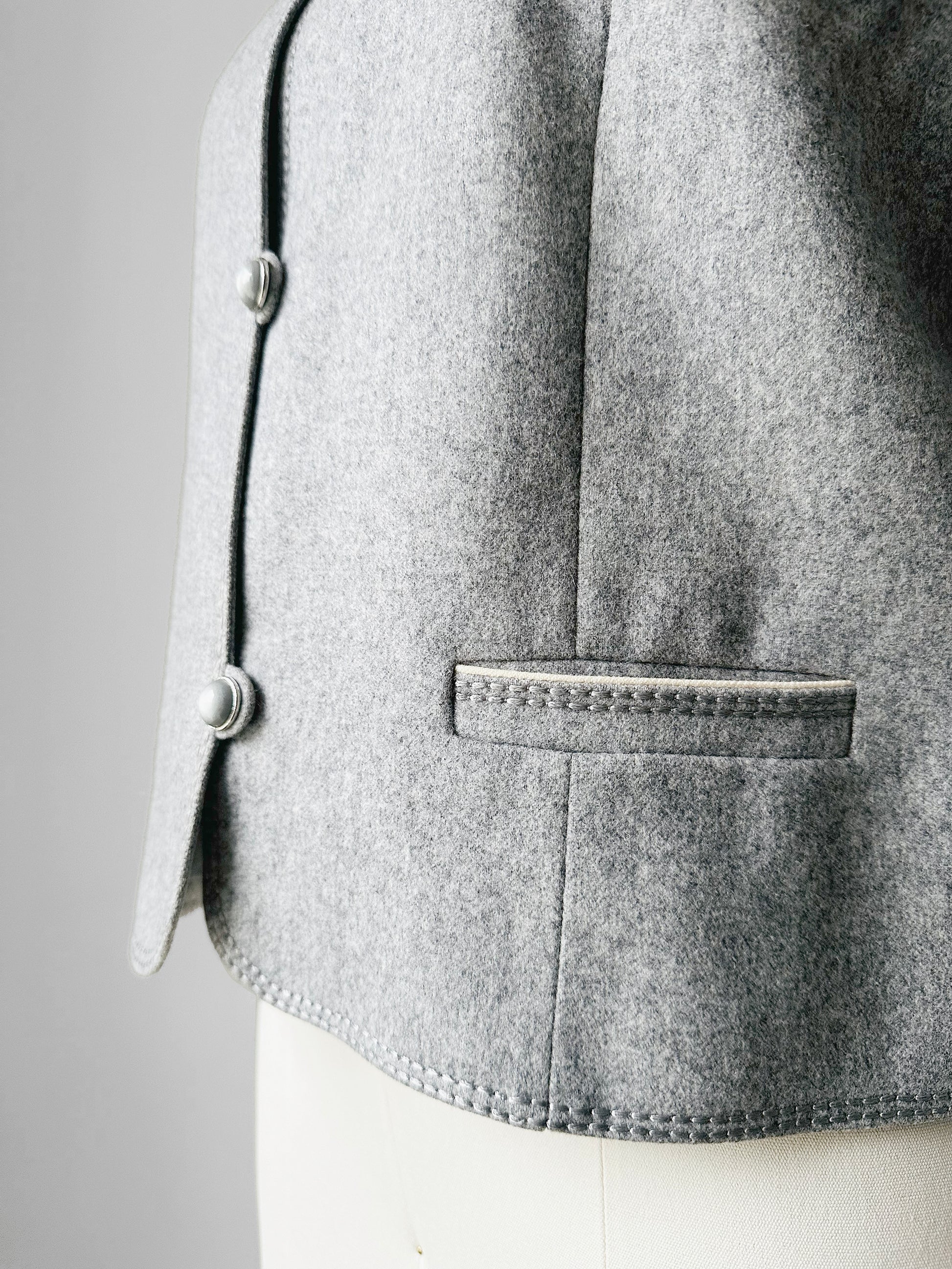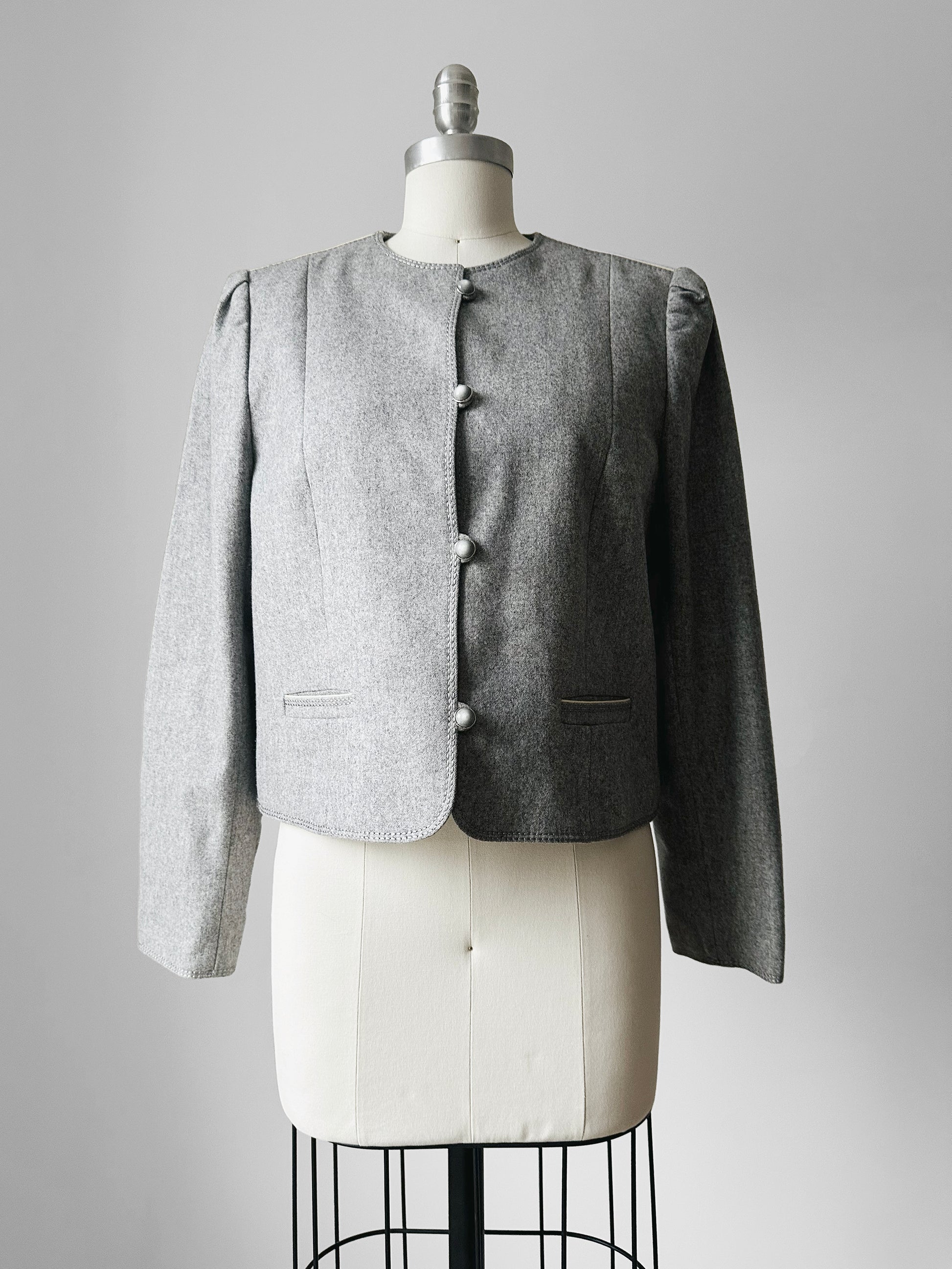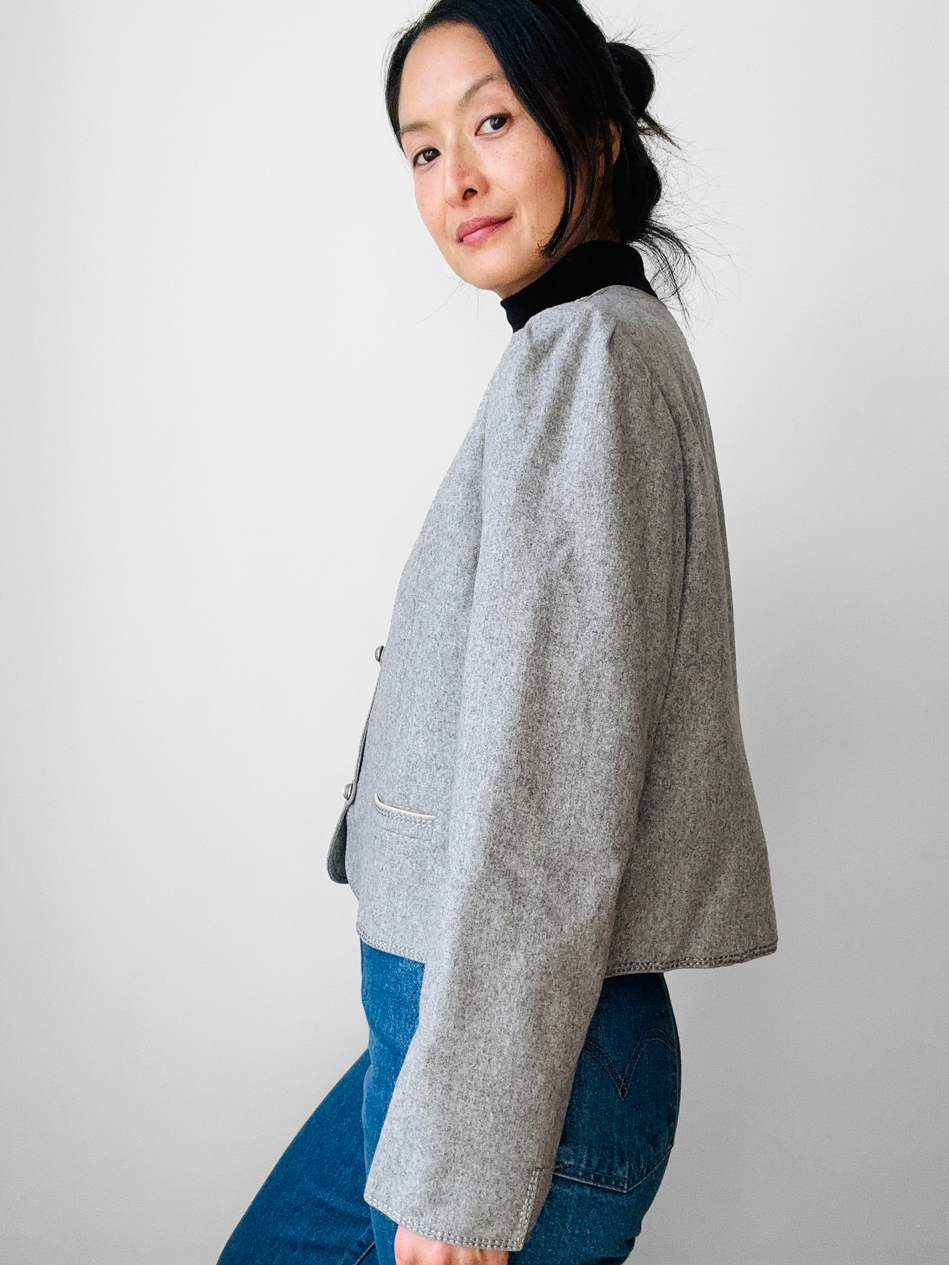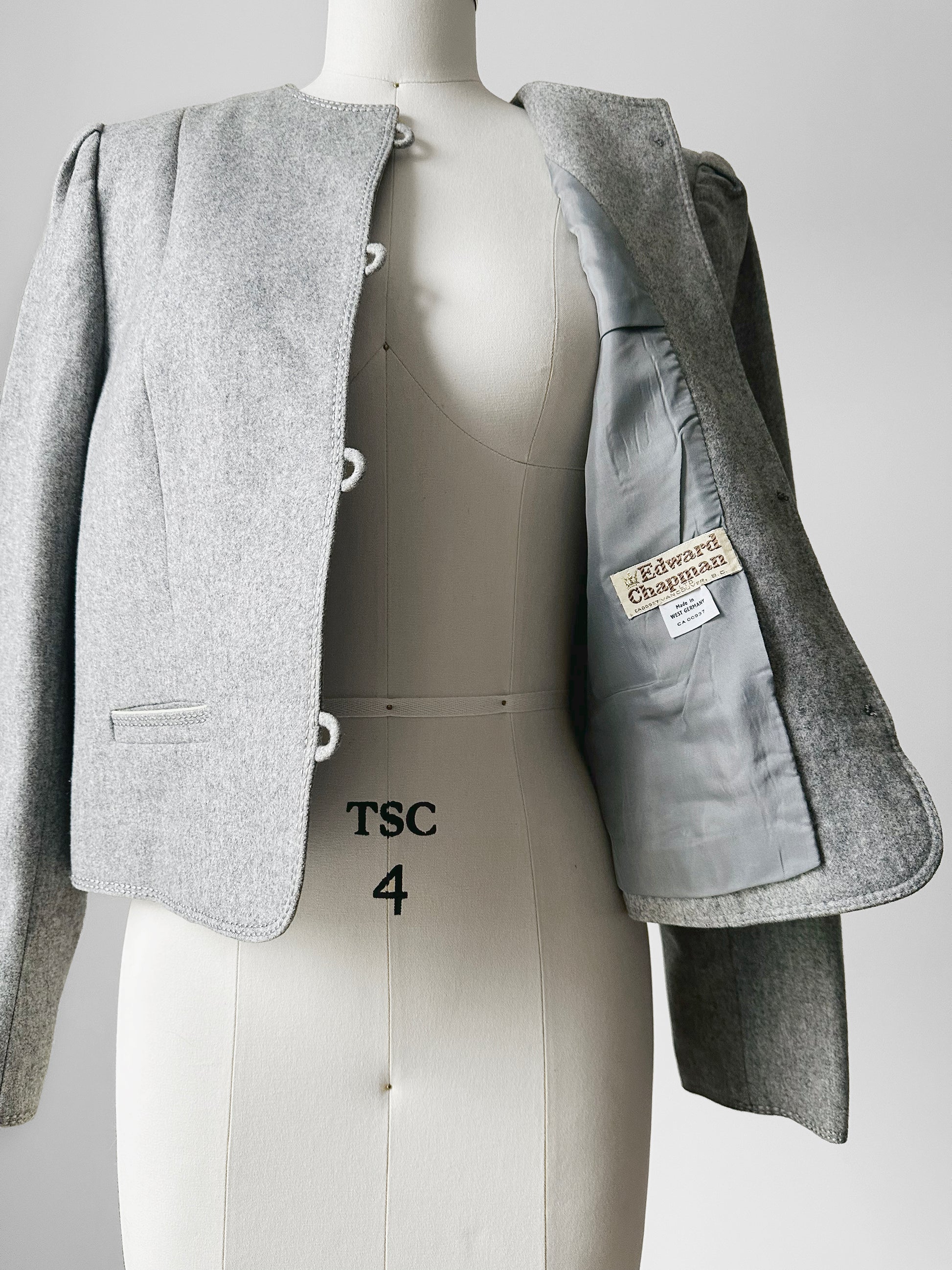 DESCRIPTION: Elevate your look with this stunning short-waisted wool jacket, a true nod to vintage sophistication. Crafted from luxurious soft grey wool with impeccable stitched detailing, it offers a tailored silhouette that flatters and defines. The cropped cut adds a modern edge to its classic design, making it perfect for layering over high-waisted trousers or a sleek dress. Timeless yet versatile, this piece brings understated glamour and a refined finish to any ensemble—a must-have for lovers of vintage style and elevated everyday fashion.