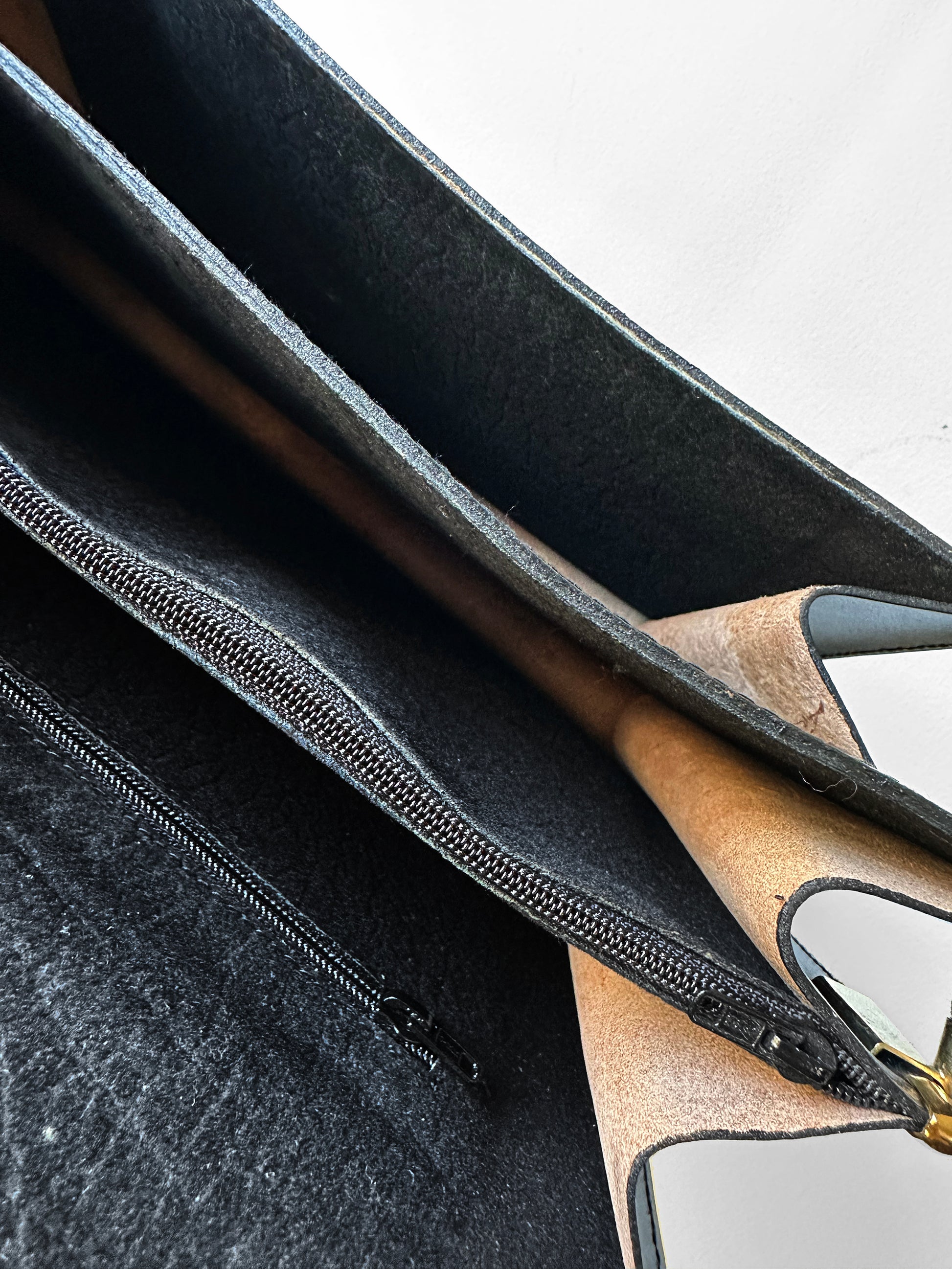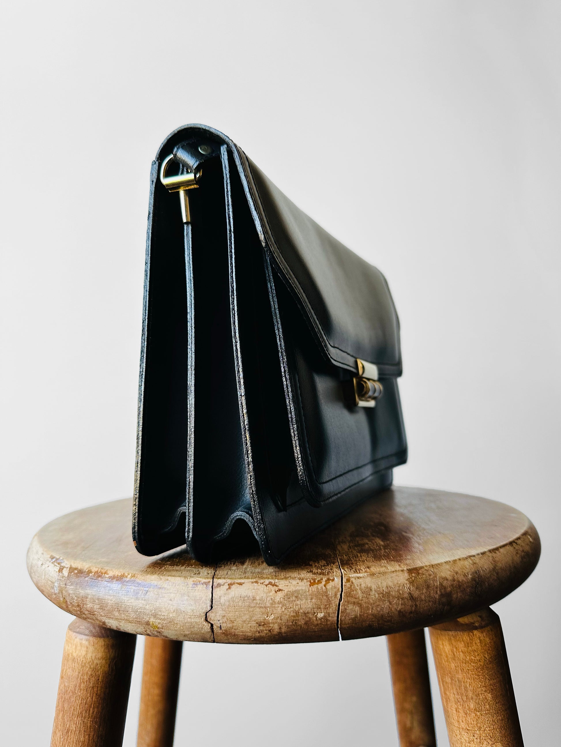 HISTORY: Mid-20th-century handbags blended practicality with evolving style, showcasing fine materials and meticulous craftsmanship. These pieces embodied elegance and durability, marking a defining era in fashion accessories. In the 1960s–70s, handbags ranged from structured briefcases and satchels to relaxed shoulder bags. Crafted from fine leather and accented with distinctive hardware—like the gold-tone clasp shown—they were both functional and stylish, reflecting the era’s sophistication.