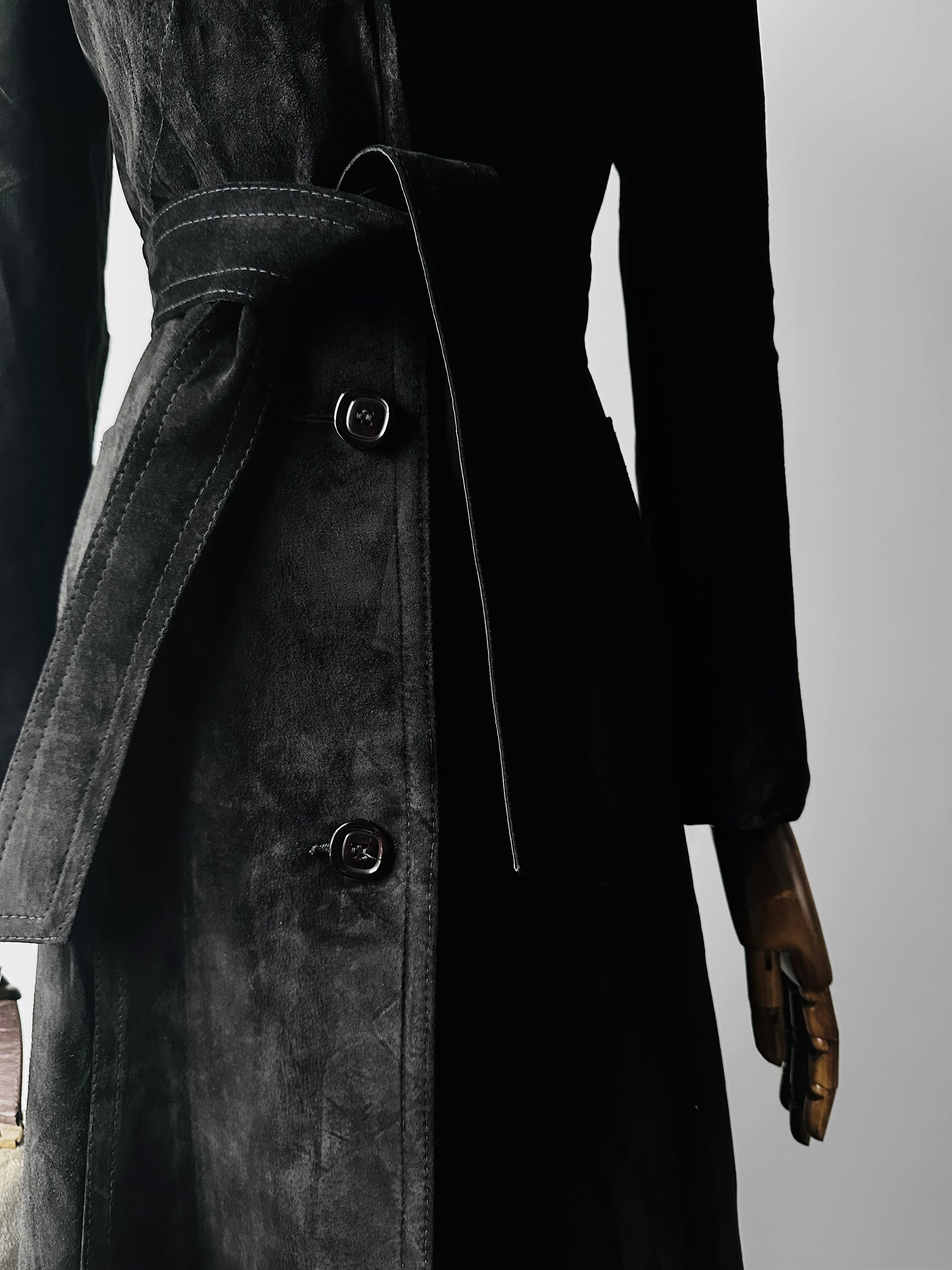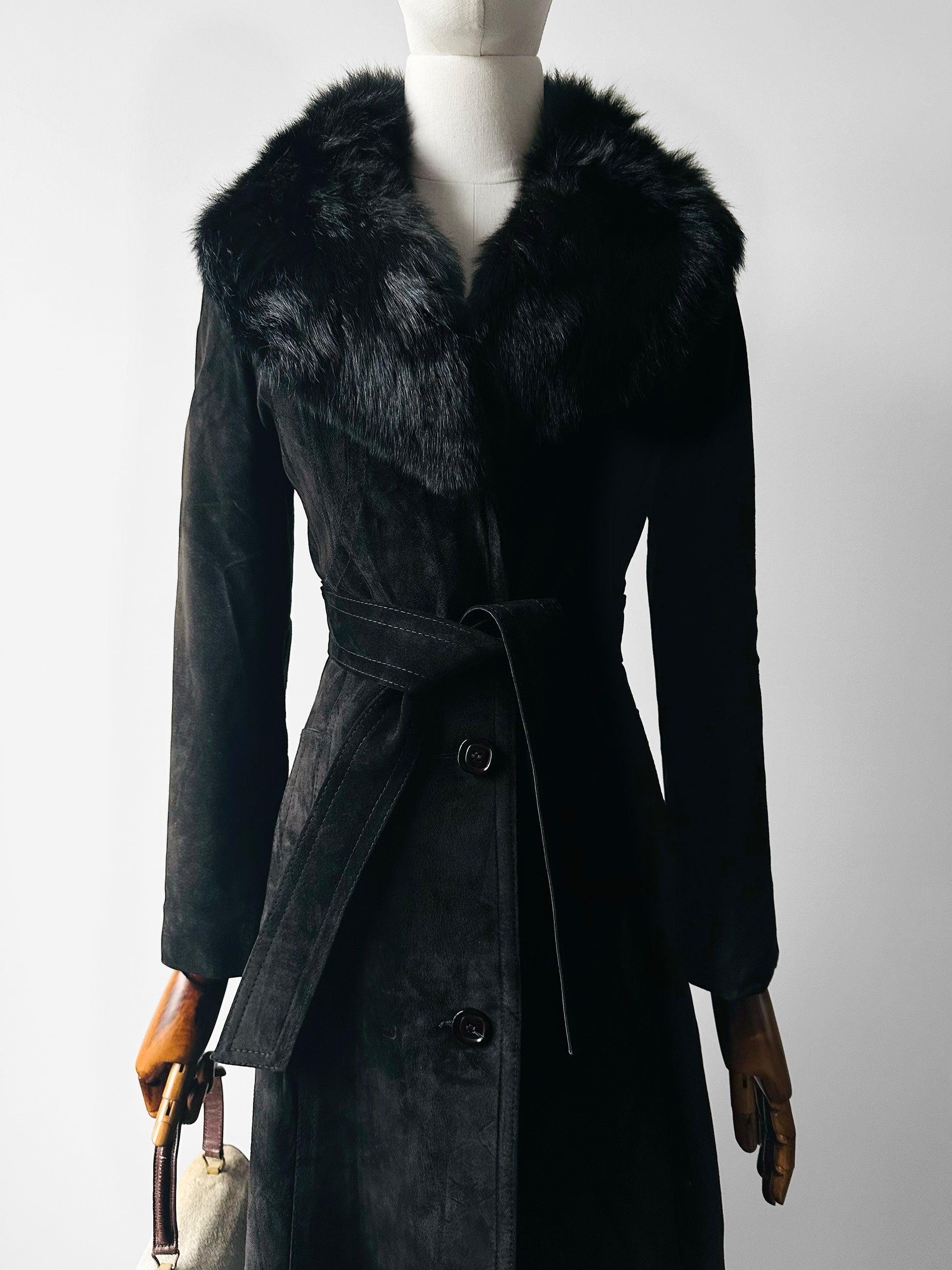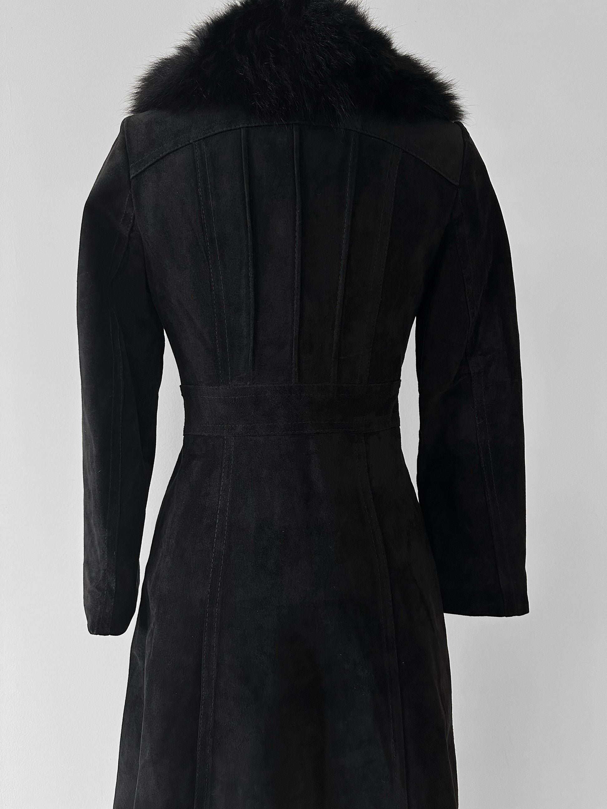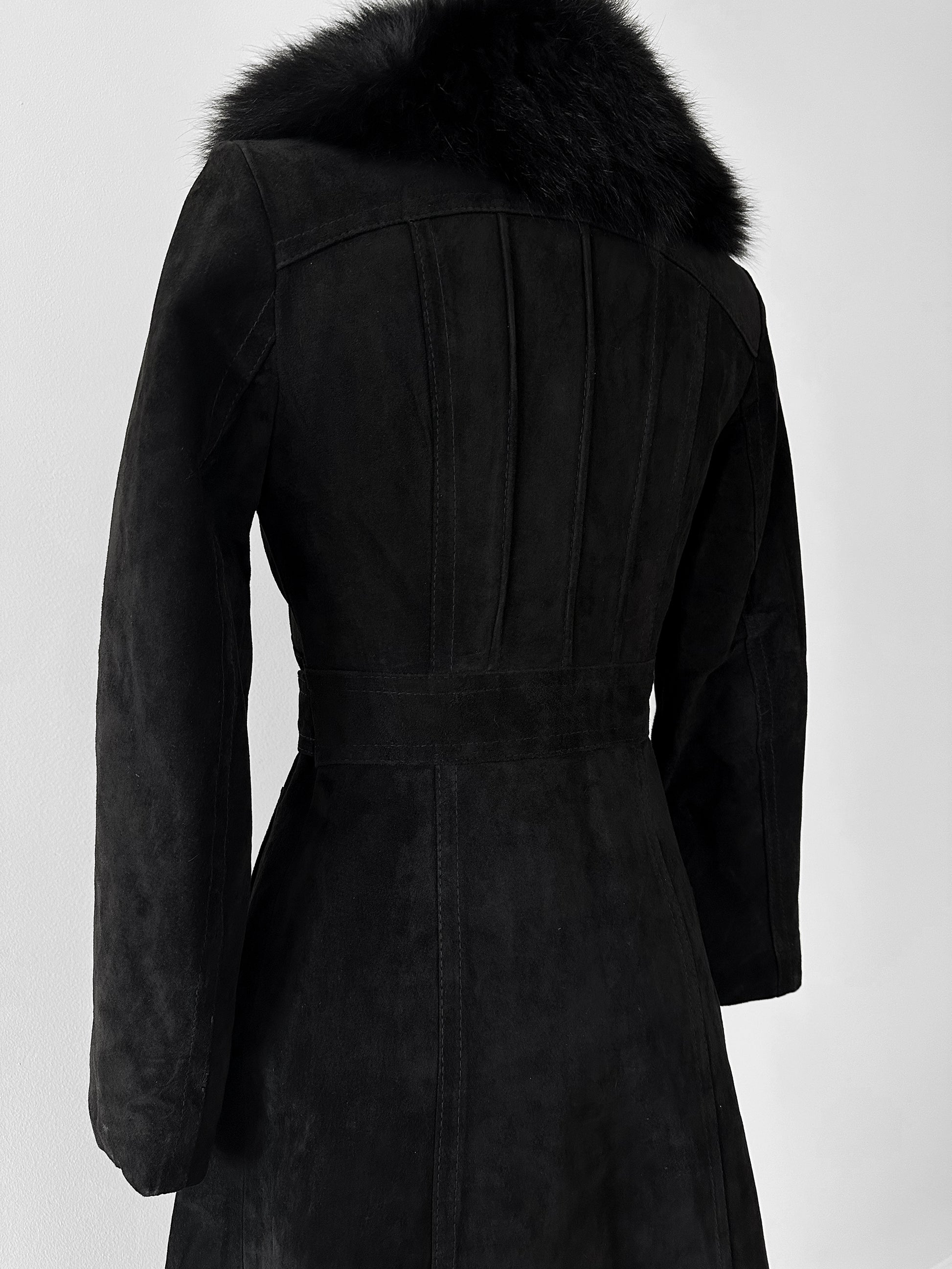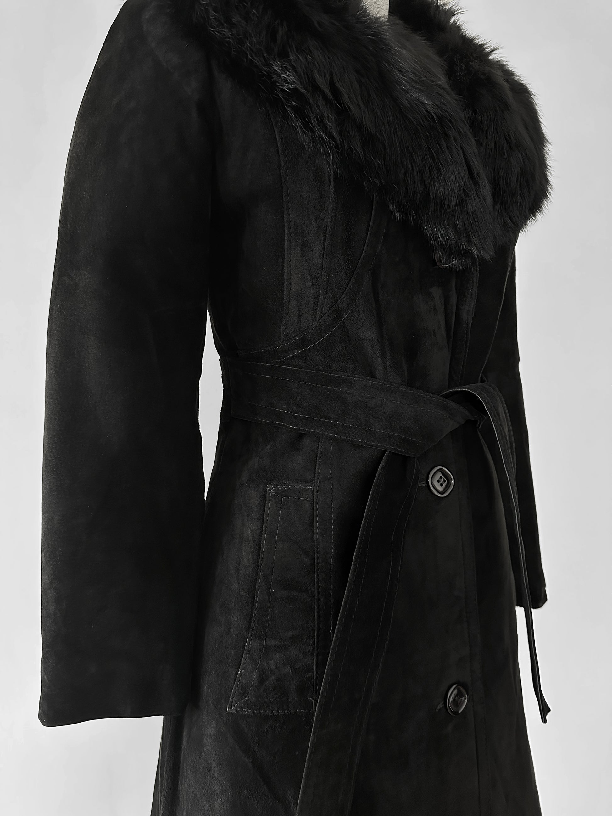 DESCRIPTION: Channel the bold sophistication of the 1970s with this stunning black suede trench coat. Featuring a tailored fit-and-flare silhouette, a plush fur collar, and a practical quilted lining, this piece blends luxury with comfort. The belted waist cinches for a flattering shape, while the soft suede add timeless luxury.