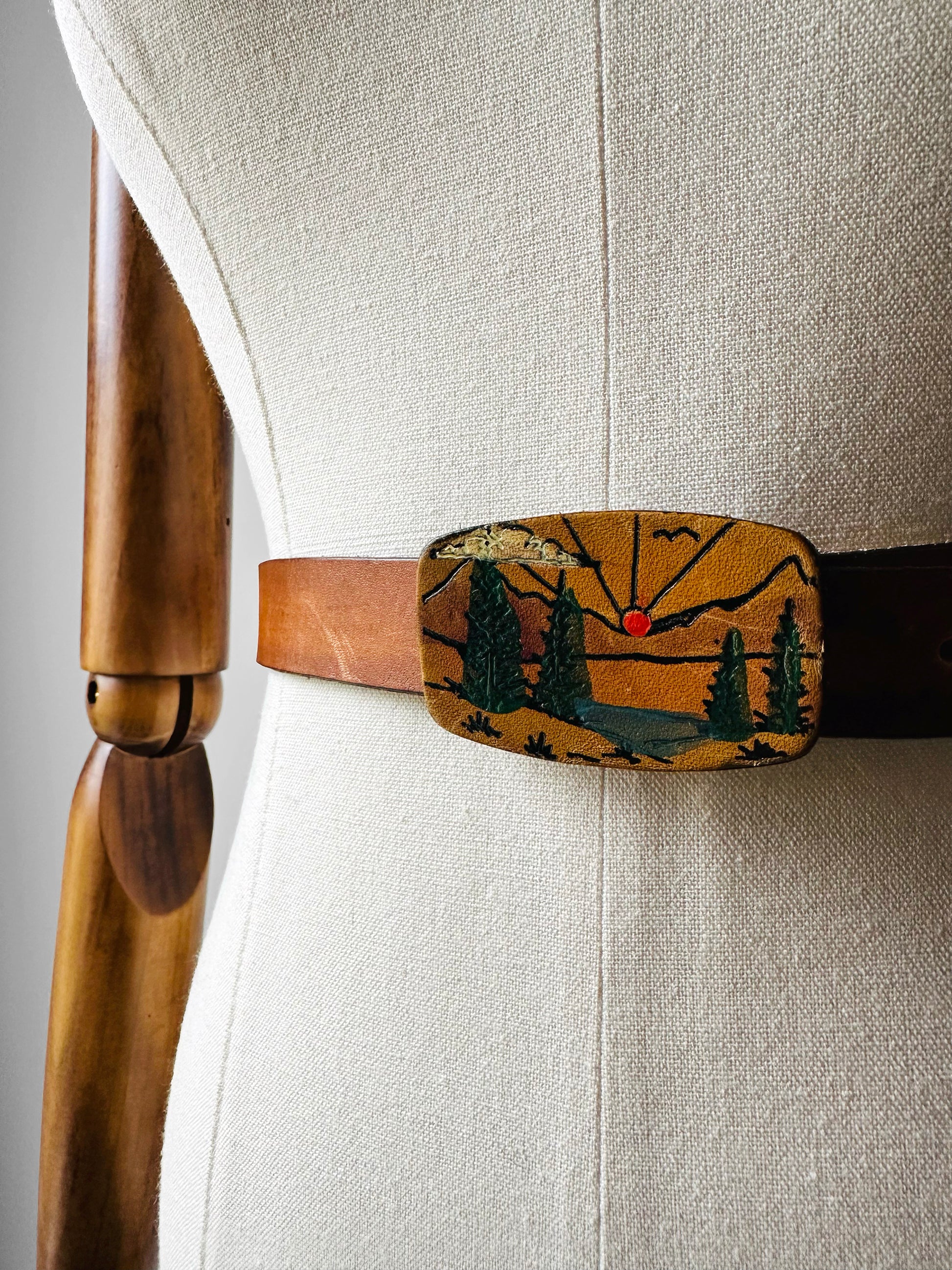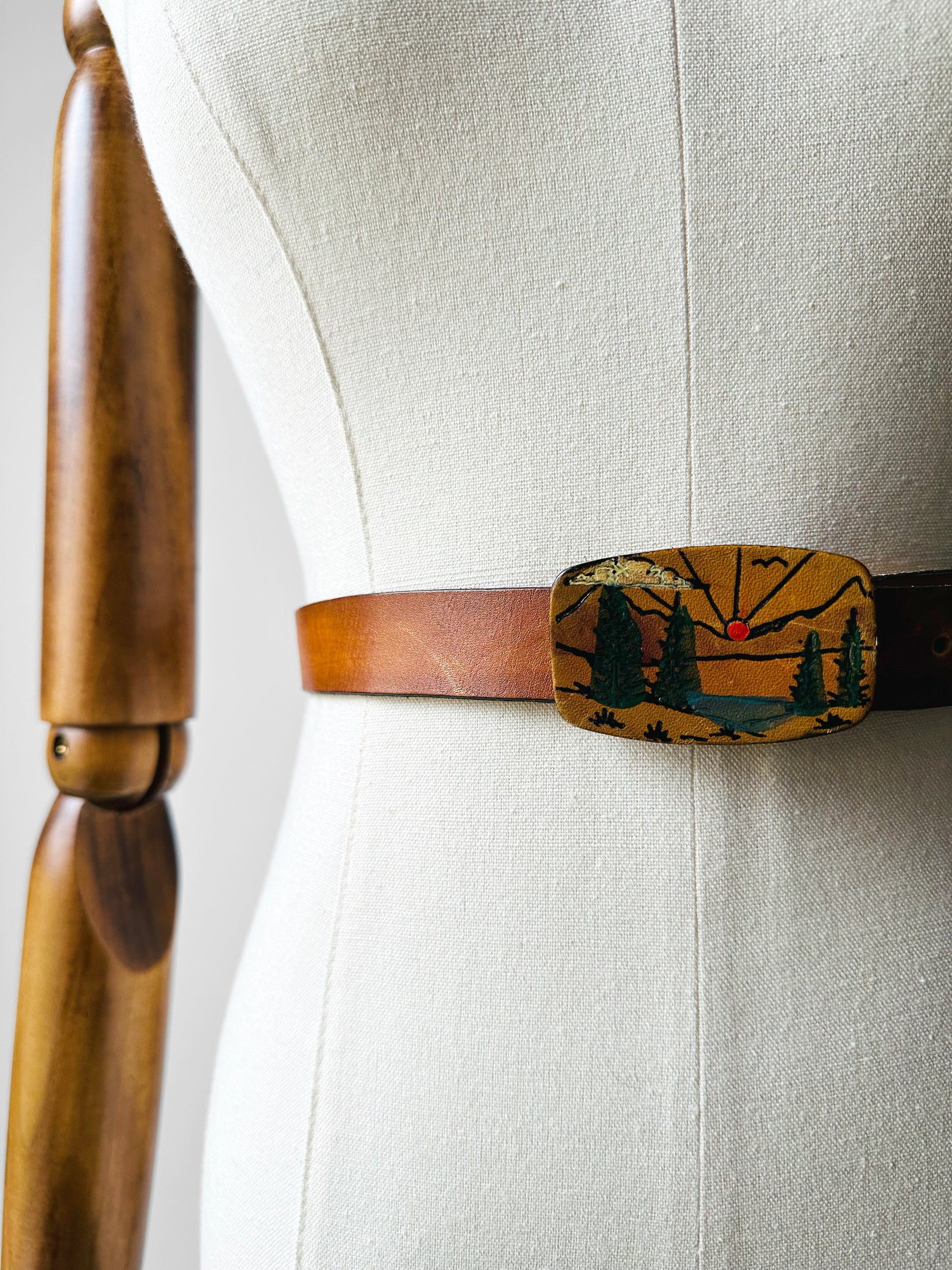 DESCRIPTION: Channel true 70s vibes with this stunning leather belt featuring a hand-painted woodsy landscape—a wearable work of art from the era of folk-inspired fashion. Each brushstroke reflects the artisanal spirit of the decade, when accessories were bold, personal, and full of character.