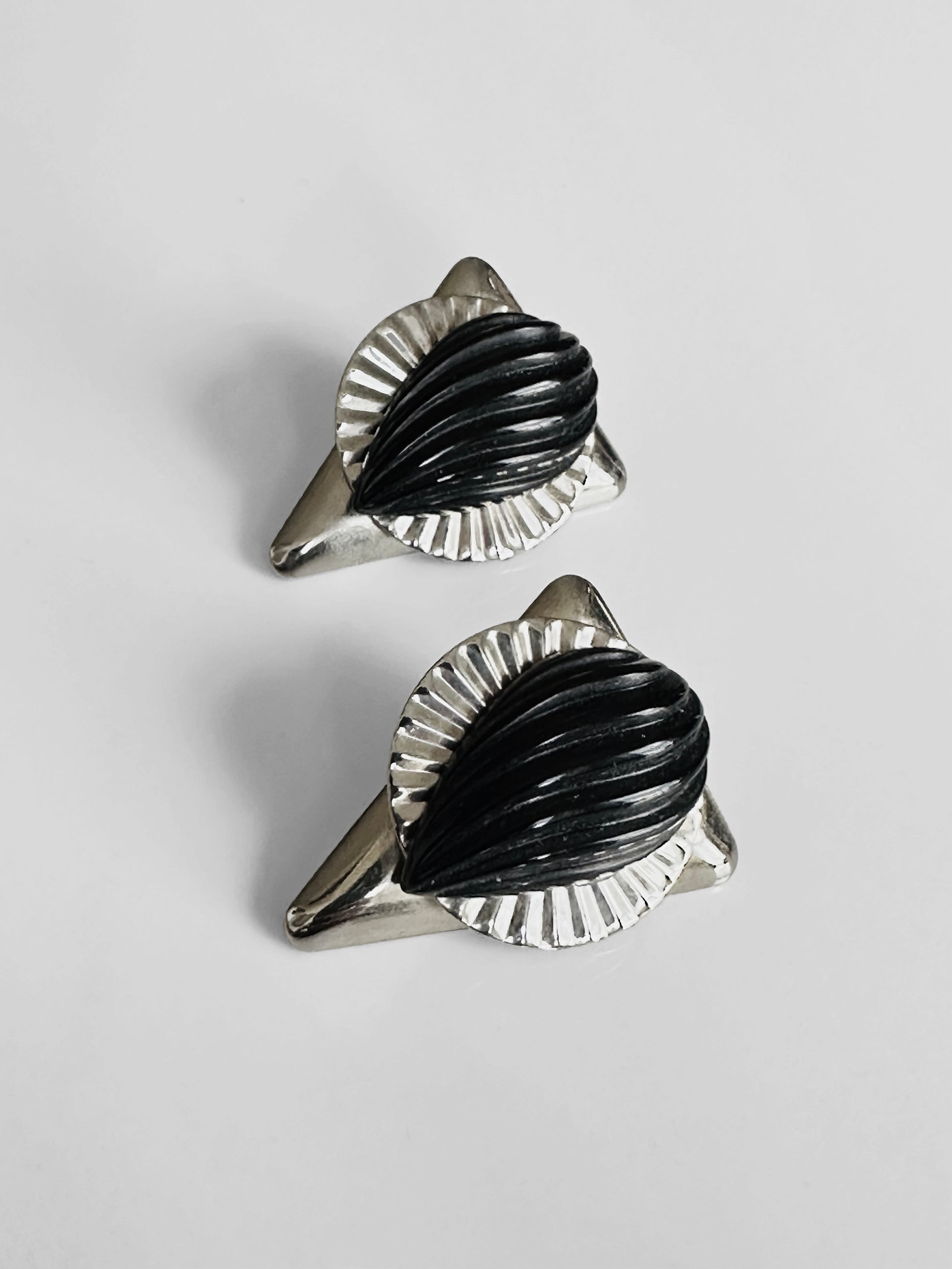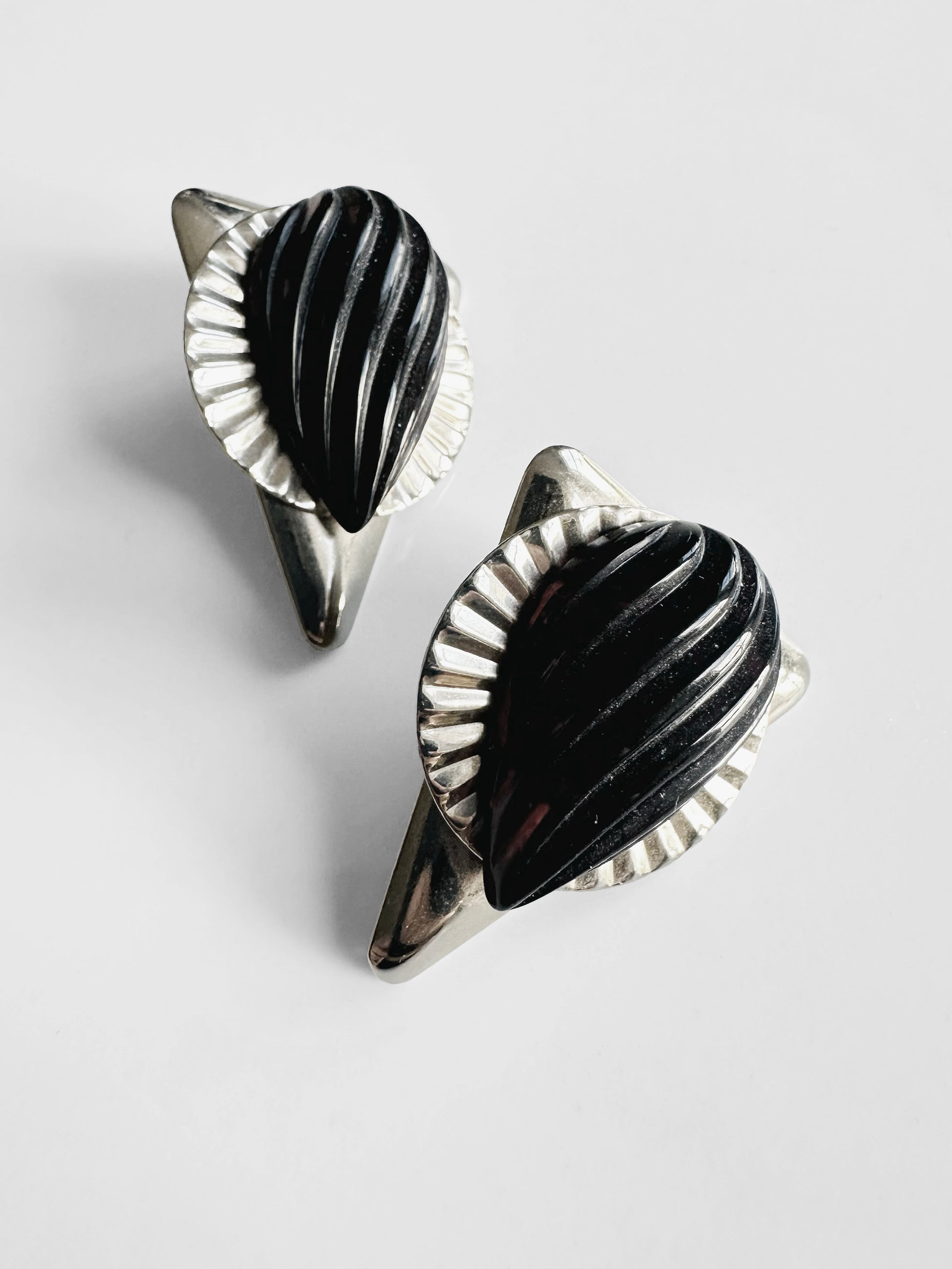 1970s Ribbed Black Resin and Fluted Metal Post Earrings