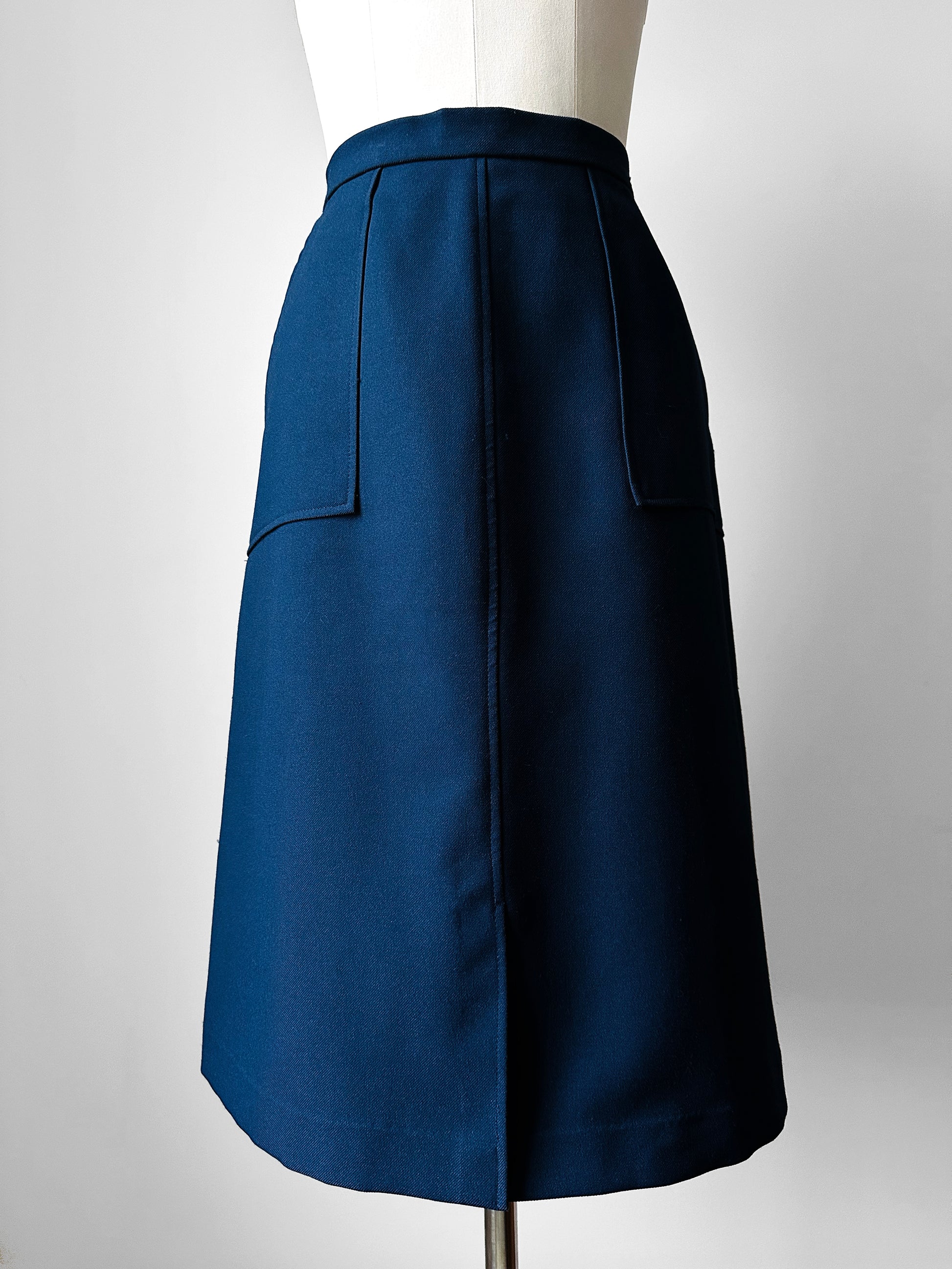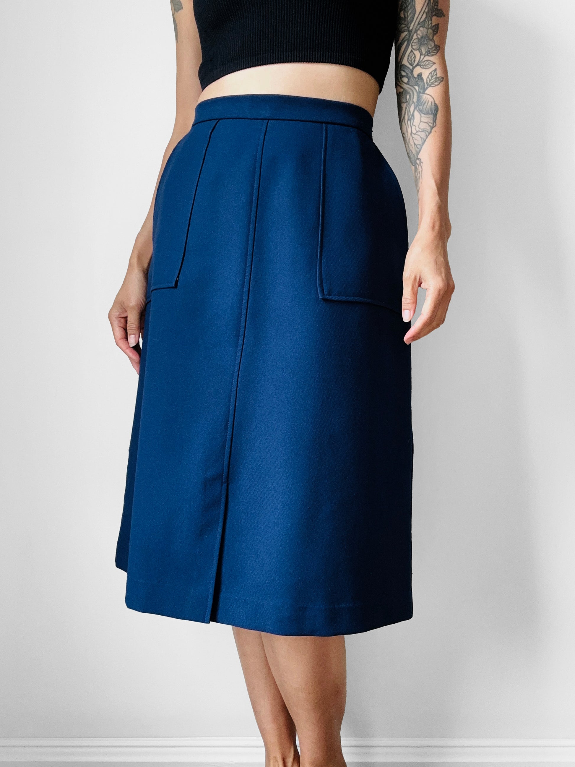 DESCRIPTION: When it comes to autumn styling, nothing beats the depth and sophistication of a rich navy hue. This classic A-line skirt is a true nod to 70s elegance, featuring bold front pockets that add both function and flair. Crafted from a mid-weight polyester, it offers structure with just the right amount of movement for a flattering silhouette. The zip-back closure keeps the look sleek and polished, making it perfect for pairing with cozy knits, crisp blouses, or layered under a tailored blazer. Timeless, versatile, and effortlessly chic—this piece is a wardrobe essential for lovers of vintage style.