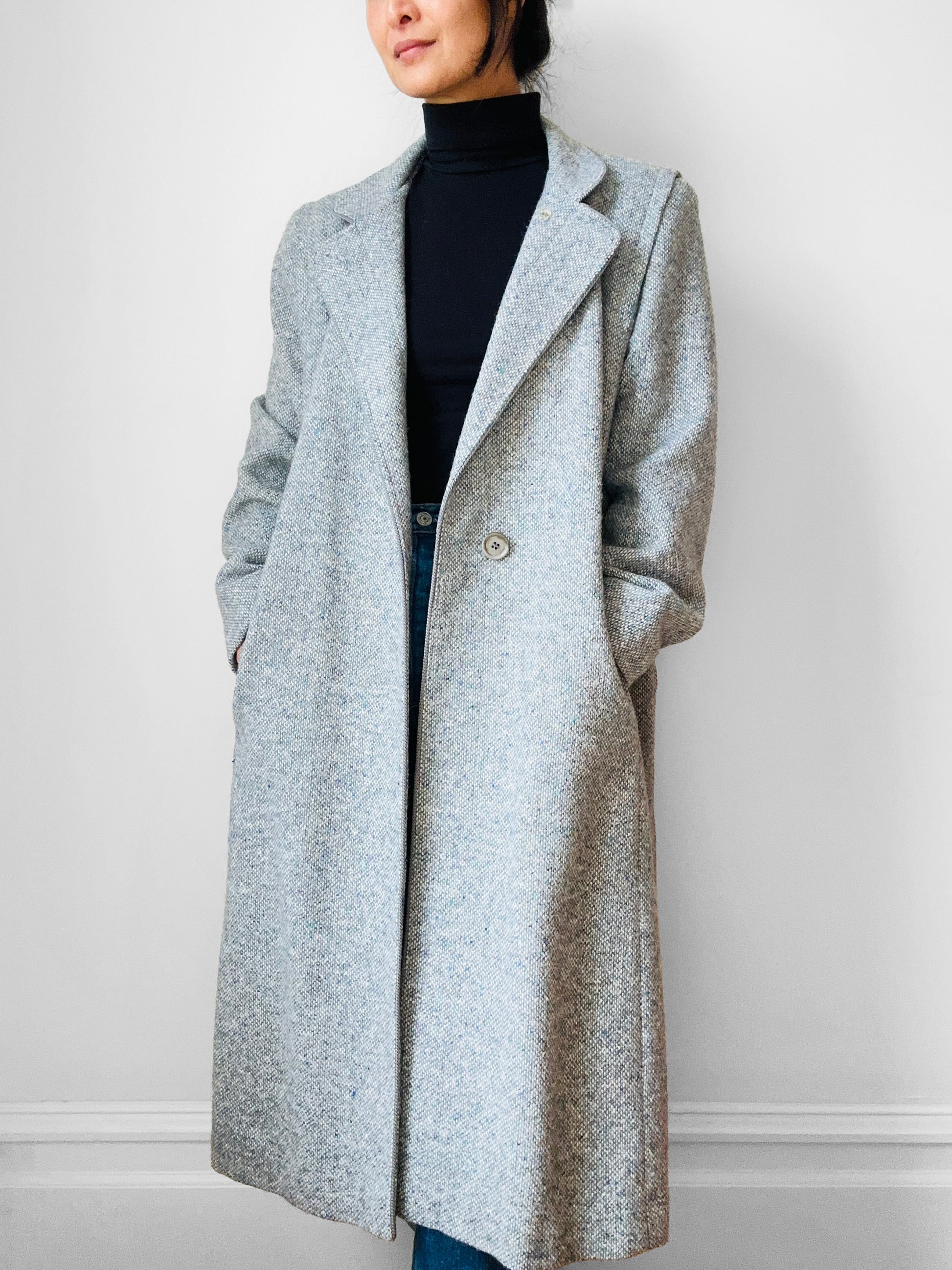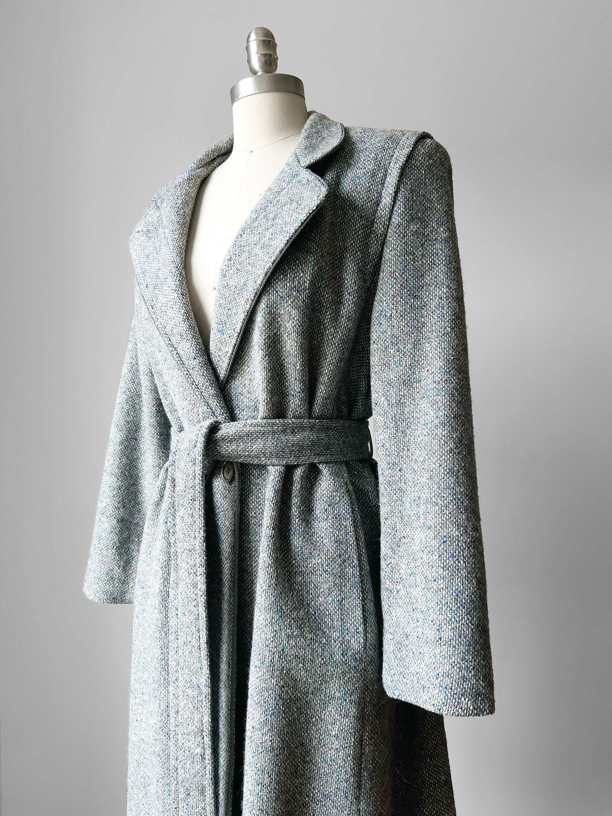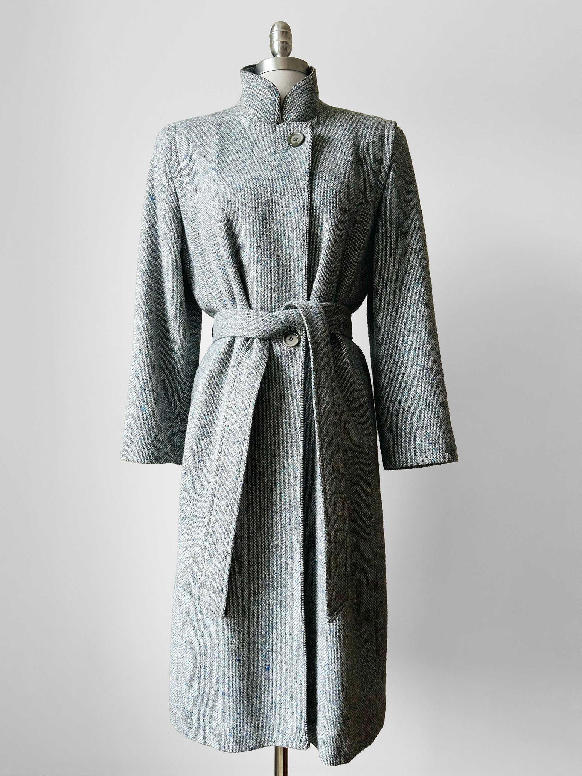 1970s - 1980s Slate Grey Mandarin Collar Wool Tweed Belted Coat - Sz. Sm