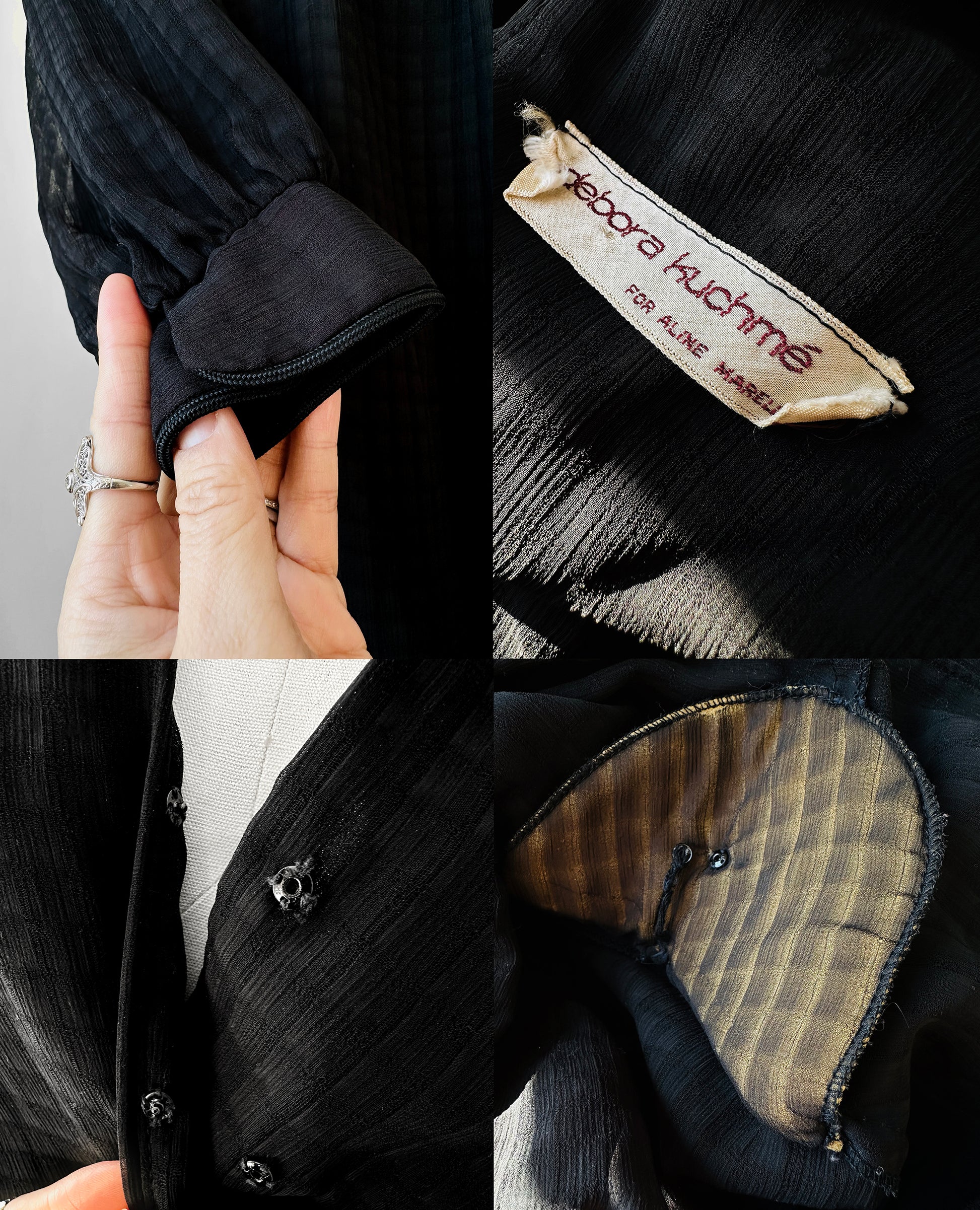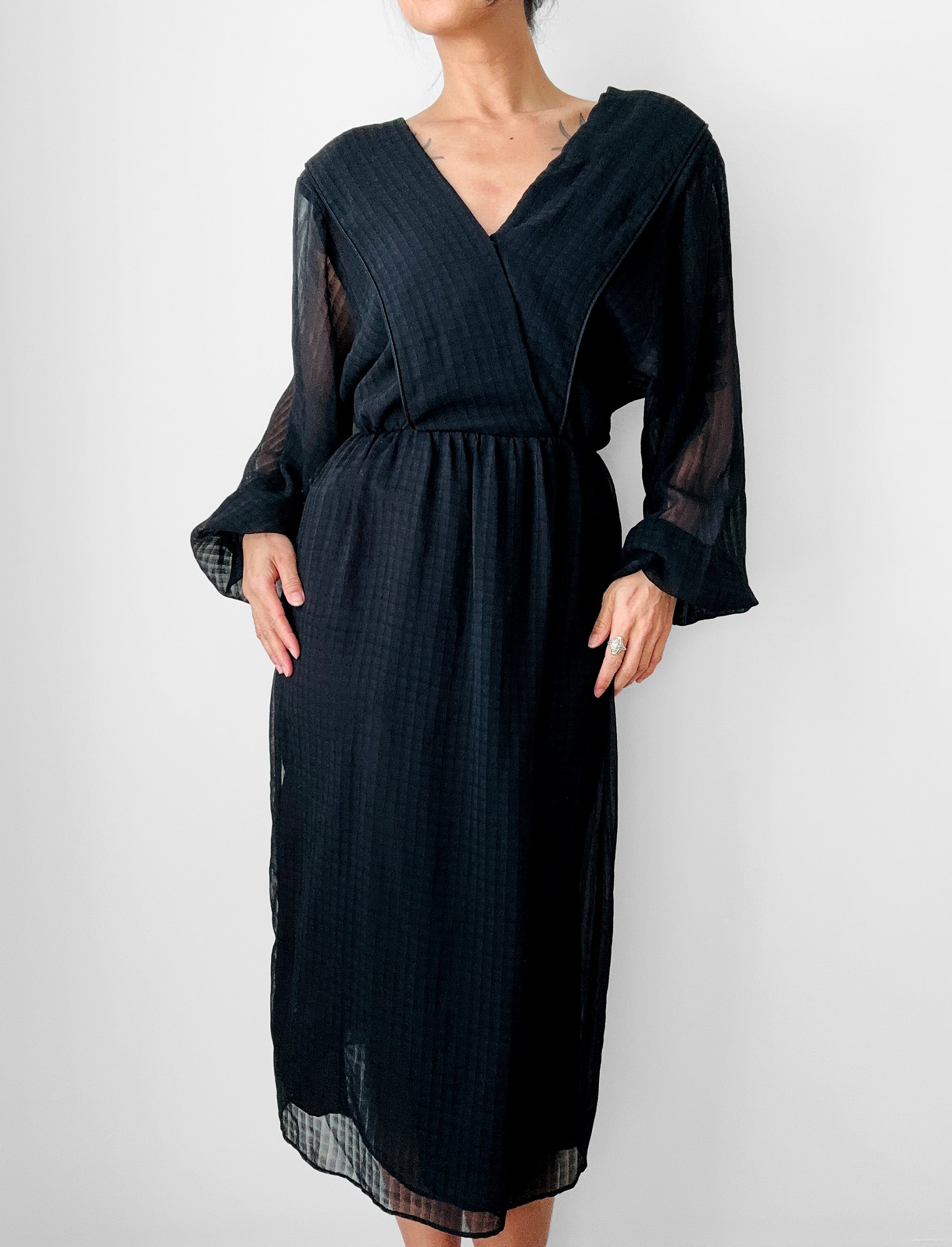 1980s - 1990s Black Patterned Semi Sheer V-neck Tone-On-Tone Dress - Sz. XS/S
