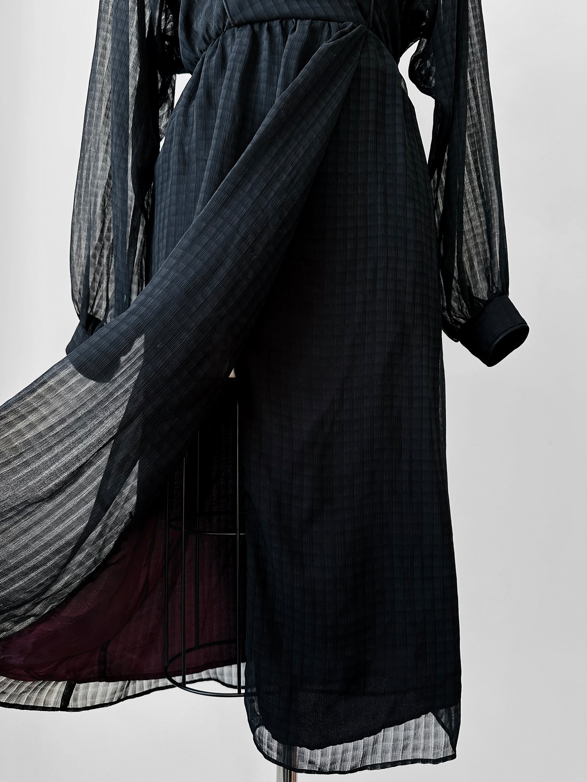 DESCRIPTION: This dress is pure drama in motion. Featuring a sultry V-neckline and striking cross-chest detail, it’s the ultimate blend of sophistication and edge. The voluminous balloon sleeves add a touch of high-fashion flair, while semi-sheer panels tease just enough skin for that perfect hint of allure. And let’s not forget the front slit—your secret weapon for a jaw-dropping leg reveal moment. Crafted in a chic tone-on-tone pattern, this piece is a true keeper for anyone who loves statement style with a timeless twist.