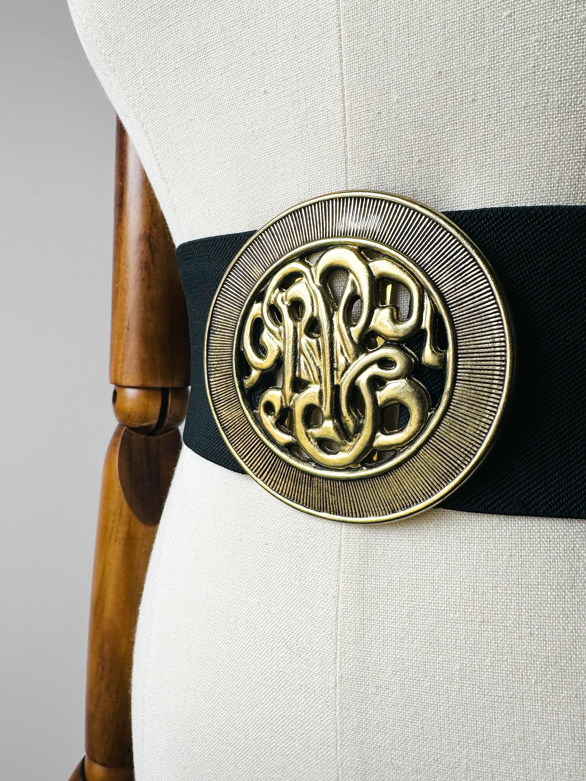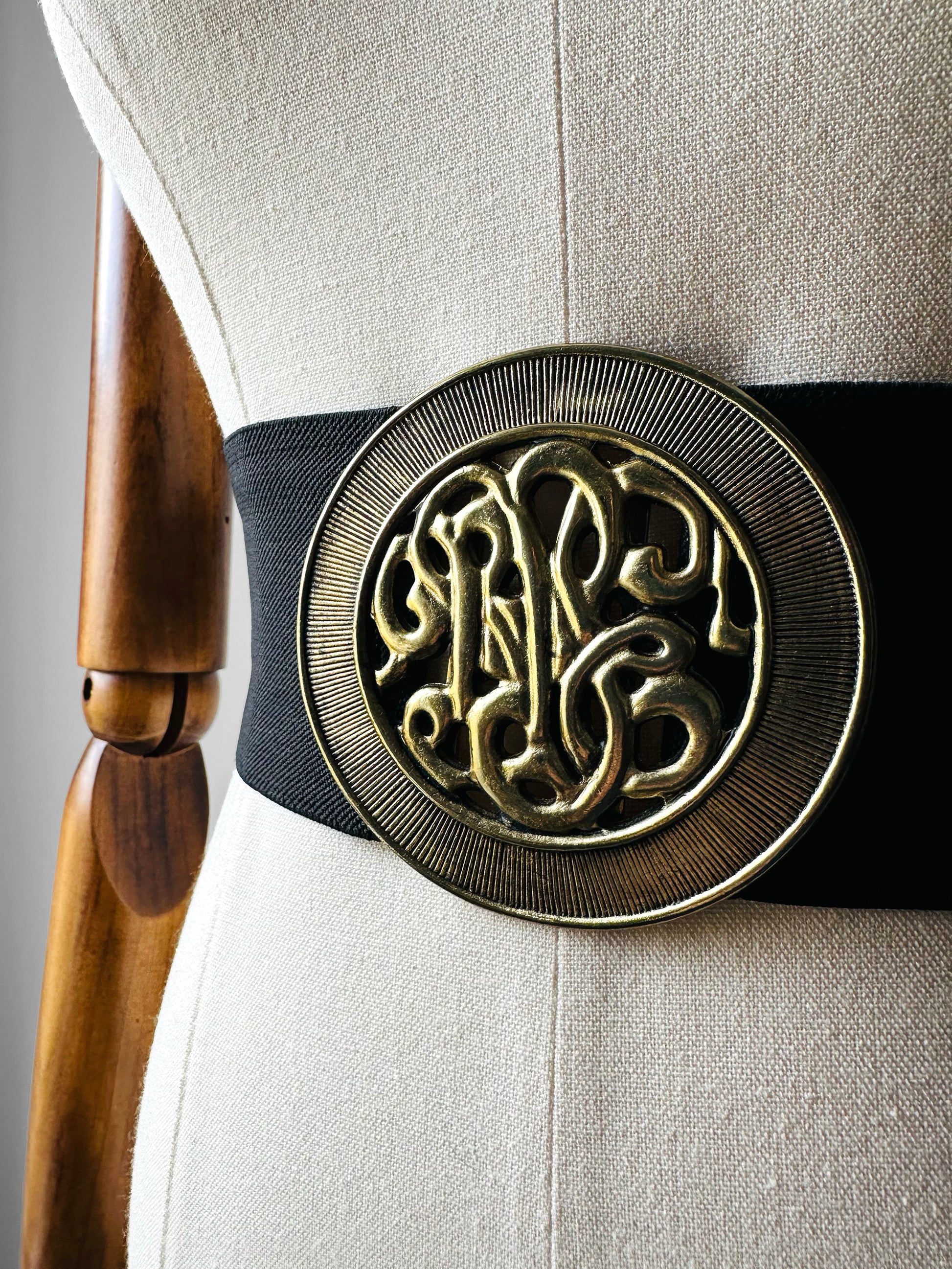 HISTORY: Statement belts, distinguished by their bold and ornate buckles, emerged as defining accessories in the fashion landscape of the late 20th century. During the vibrant decades of the 1980s and 1990s, these belts transcended mere functionality to become symbols of style and status. Often employed to cinch the waist of flowing dresses, tunics, or the era’s iconic oversized blazers, they sculpted a silhouette that reflected the prevailing ideals of power dressing and glamour. The incorporation of elasticated bands marked a practical innovation, offering both comfort and adaptability, while preserving the dramatic aesthetic that made these belts a focal point of contemporary attire. Today, they endure as emblematic relics of a period celebrated for its audacious approach to fashion.