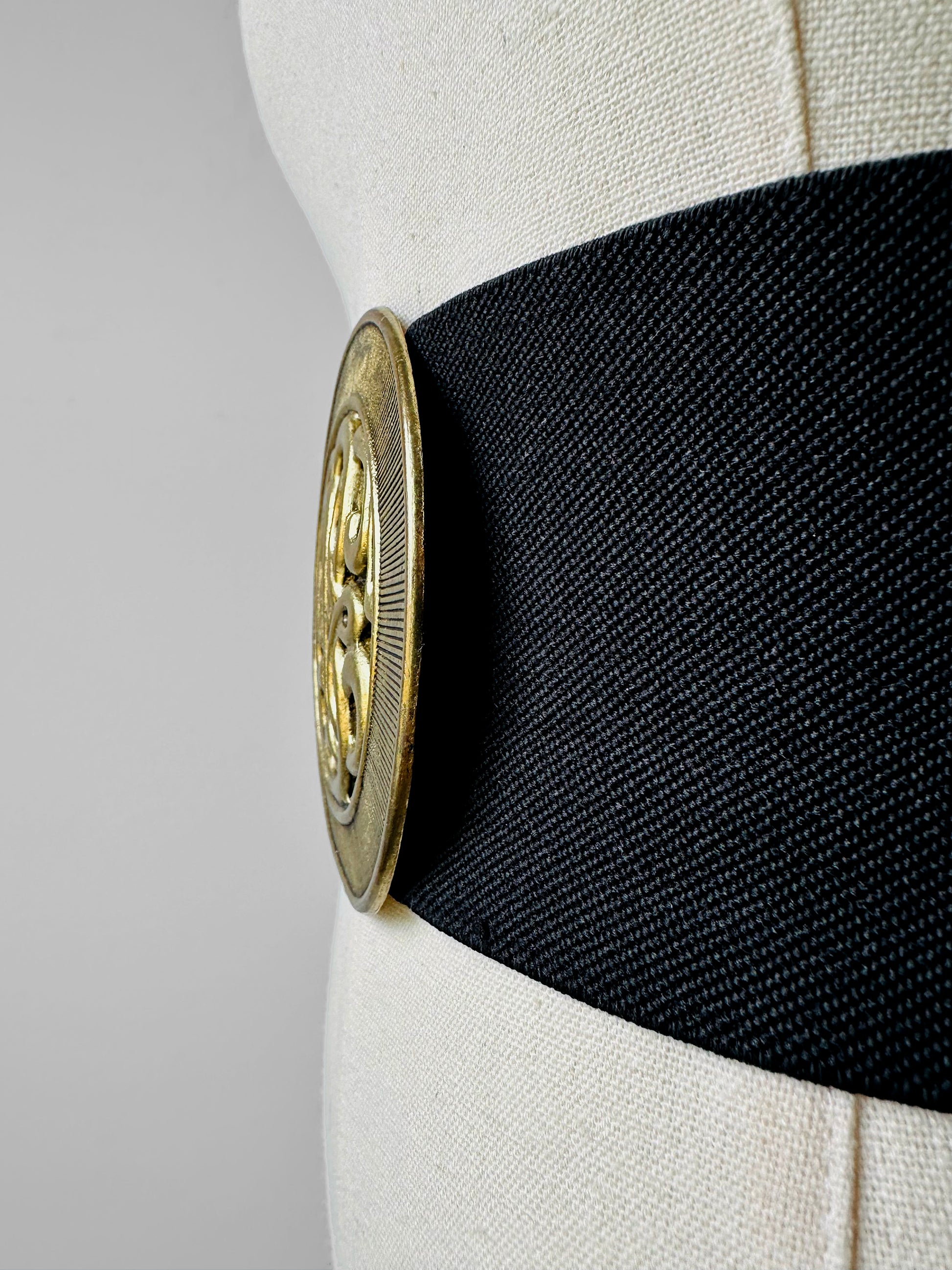 DESCRIPTION: This vintage 1980s–1990s wide black stretch belt is the ultimate statement accessory for bold, confident style. Crafted with a sleek elastic band for a comfortable, figure-flattering fit, it features an ornate gold-toned buckle adorned with intricate scrollwork—a true nod to the glamour and drama of the era. Designed to cinch the waist and create a striking silhouette, this belt transitions effortlessly from day to night, adding instant sophistication to dresses, tunics, or oversized blazers. Perfect for vintage lovers and fashion enthusiasts, it’s more than an accessory—it’s a piece of wearable art that elevates any outfit with timeless elegance and bold personality.