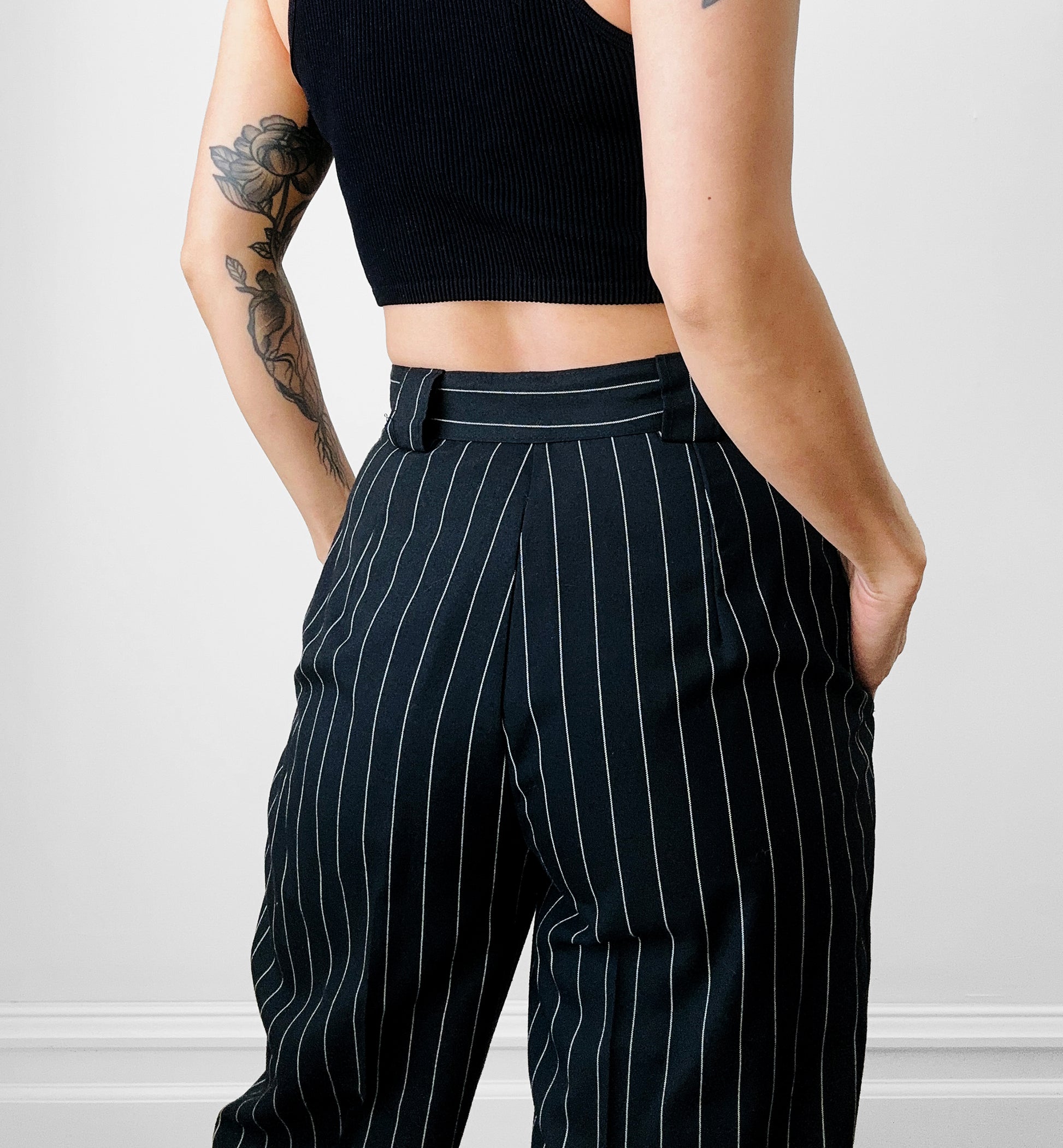 This super stylish crop jacket and pleated pant ensemble is in excellent, gently worn, vintage condition. Made in Canada. Lightweight and works well for Fall and Spring. Mix it up and pair this jacket with some high waisted denim or leather bottoms. Flip it up and pair these high waisted trousers with your favourite 80s blouse or chunky pullover crop knit. Either way you a a few highly versatile outfits to play with.