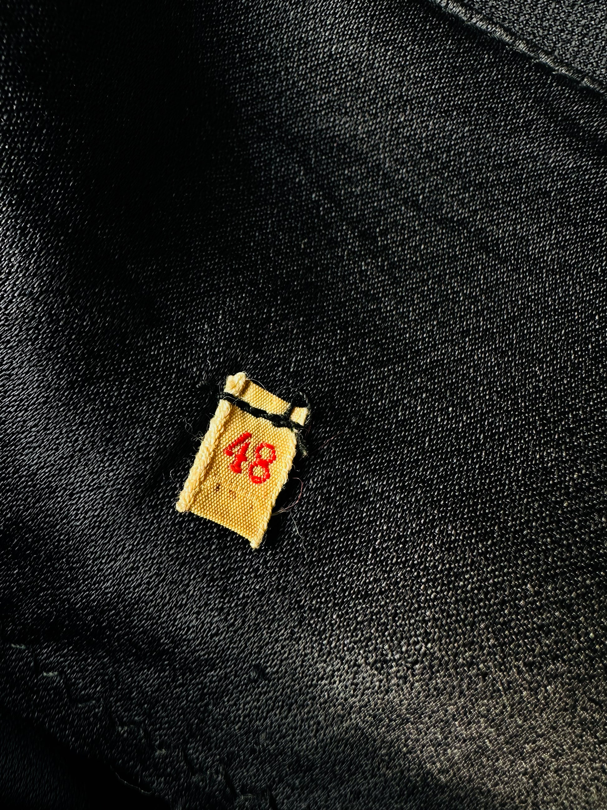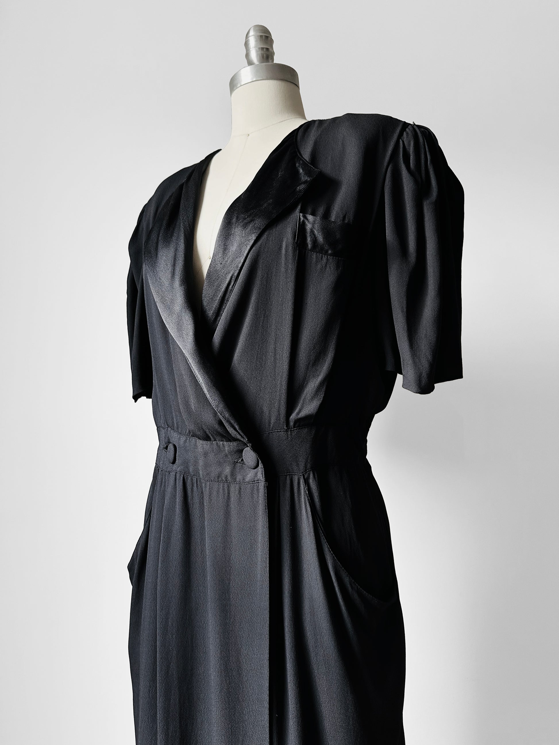 DESCRIPTION: I’m obsessed with the effortless drape of this 1980s wrap dress—a bold nod to classic tuxedo styling with a modern twist. The sharp lapel and wrap skirt exude confidence and sophistication, while the matte fabric paired with satin contrast delivers that luxe, high-fashion edge. Perfect for power dressing or evening elegance, this piece is pure versatility. The puffed sleeves and statement buttons bring that iconic 80s drama, blending structure with flair for a look that’s unapologetically chic. A true vintage gem for those who love commanding style.