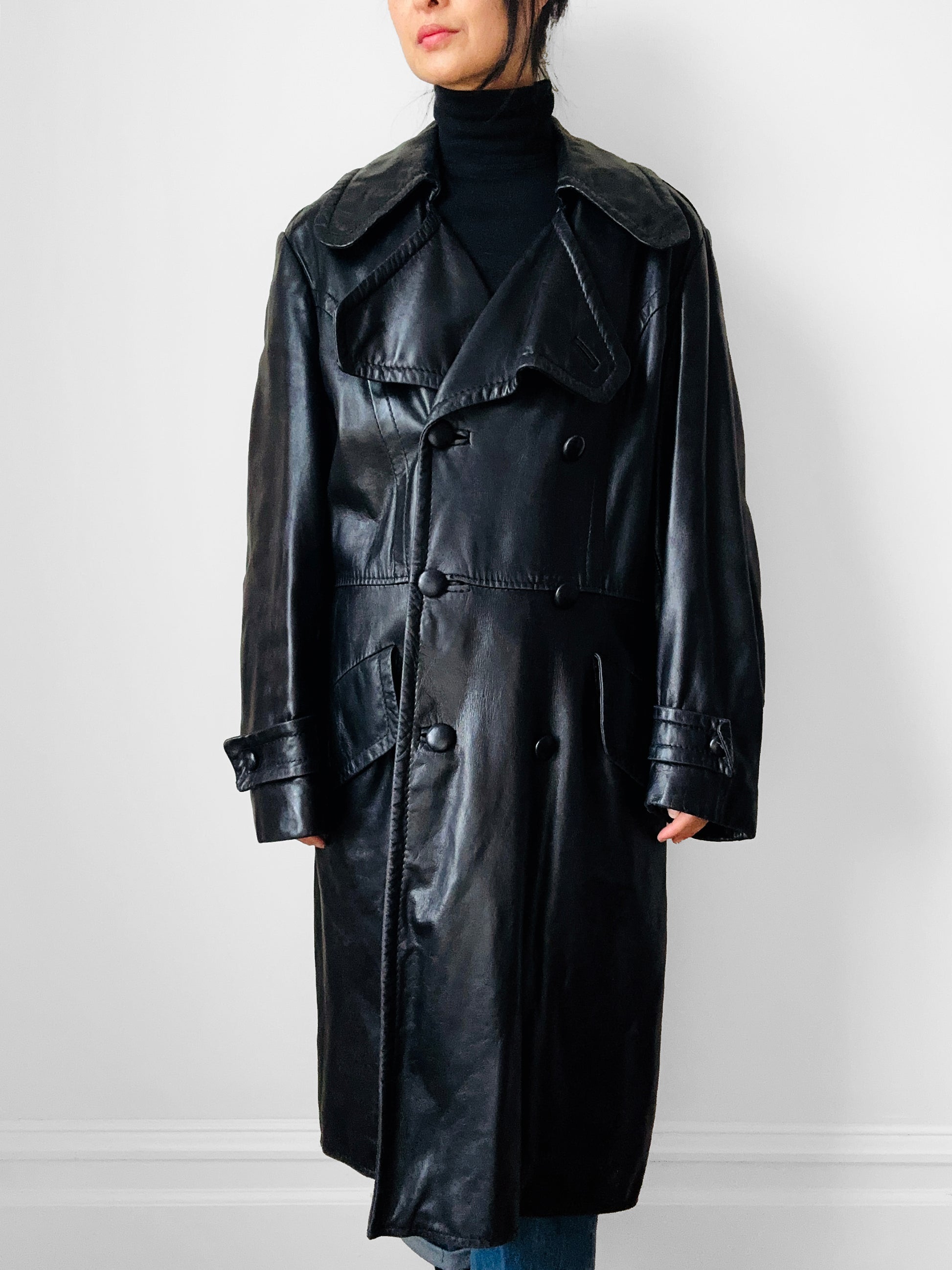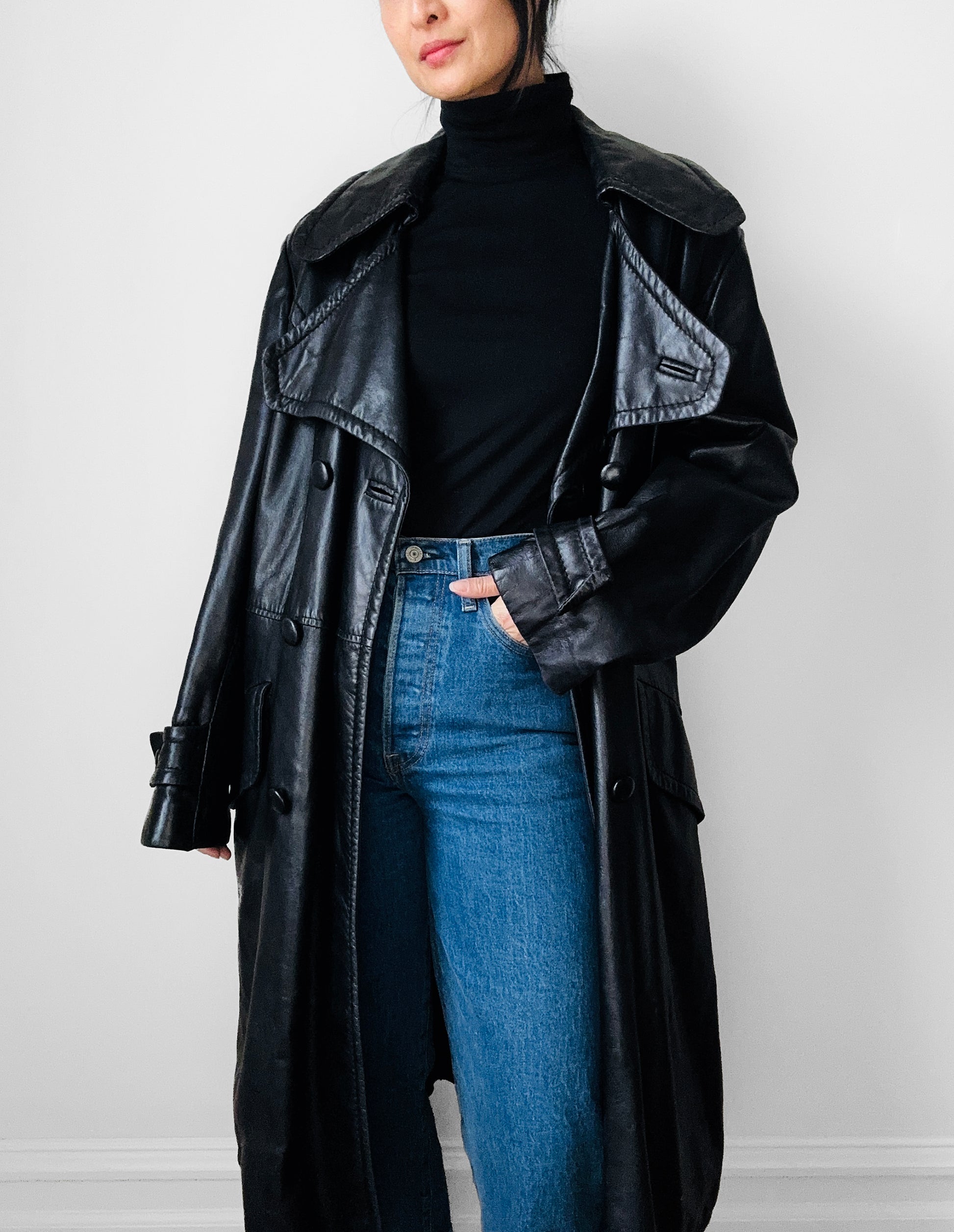 This super luxurious 70s leather number is a true stunner. The rich black tone and feel are even more beautiful in person. Buttery soft to the touch. Love the classic double-breasted style. I find this style looks great dressed up or down. Pairs perfectly with dresses to jeans and everything in between.