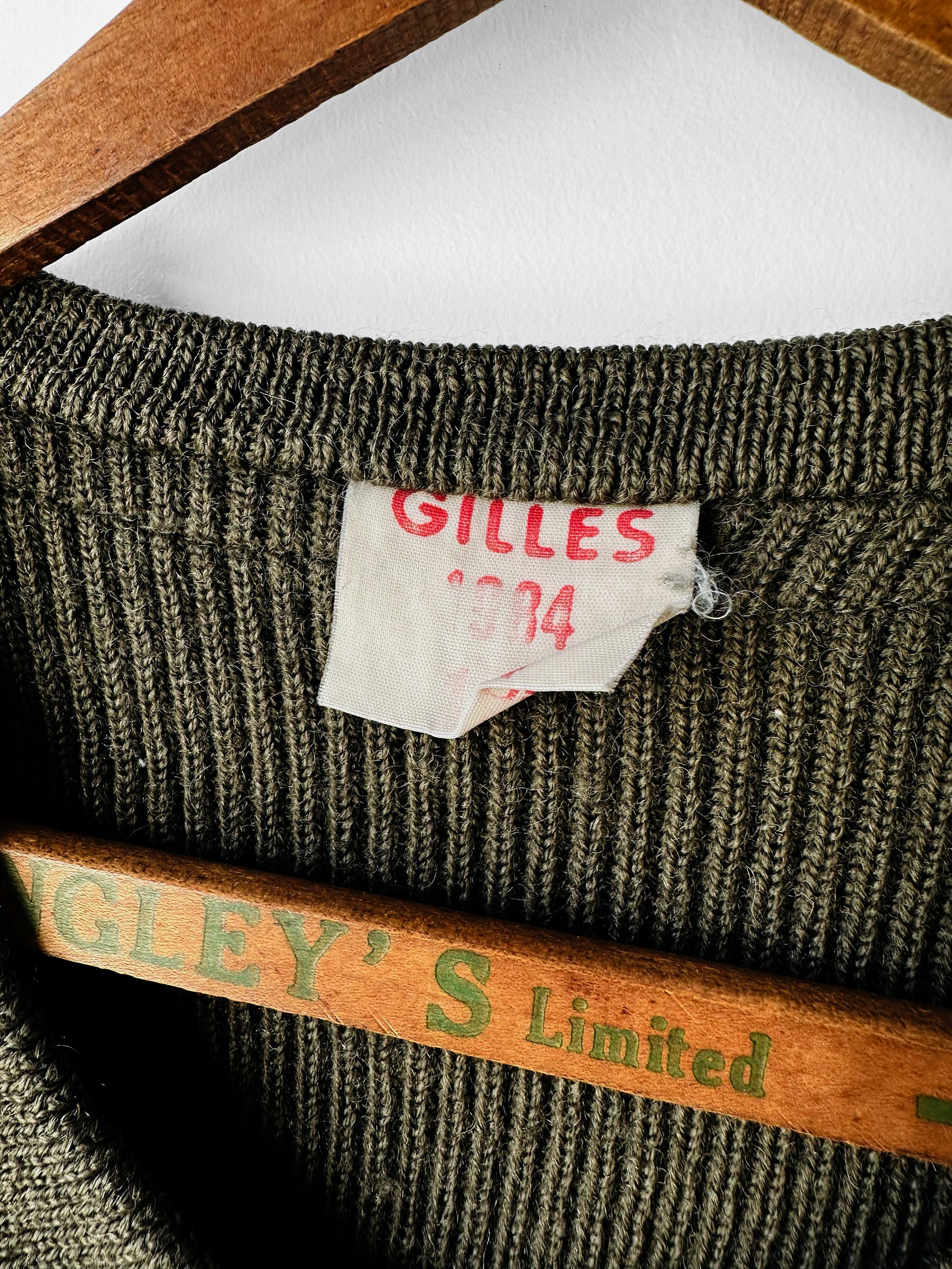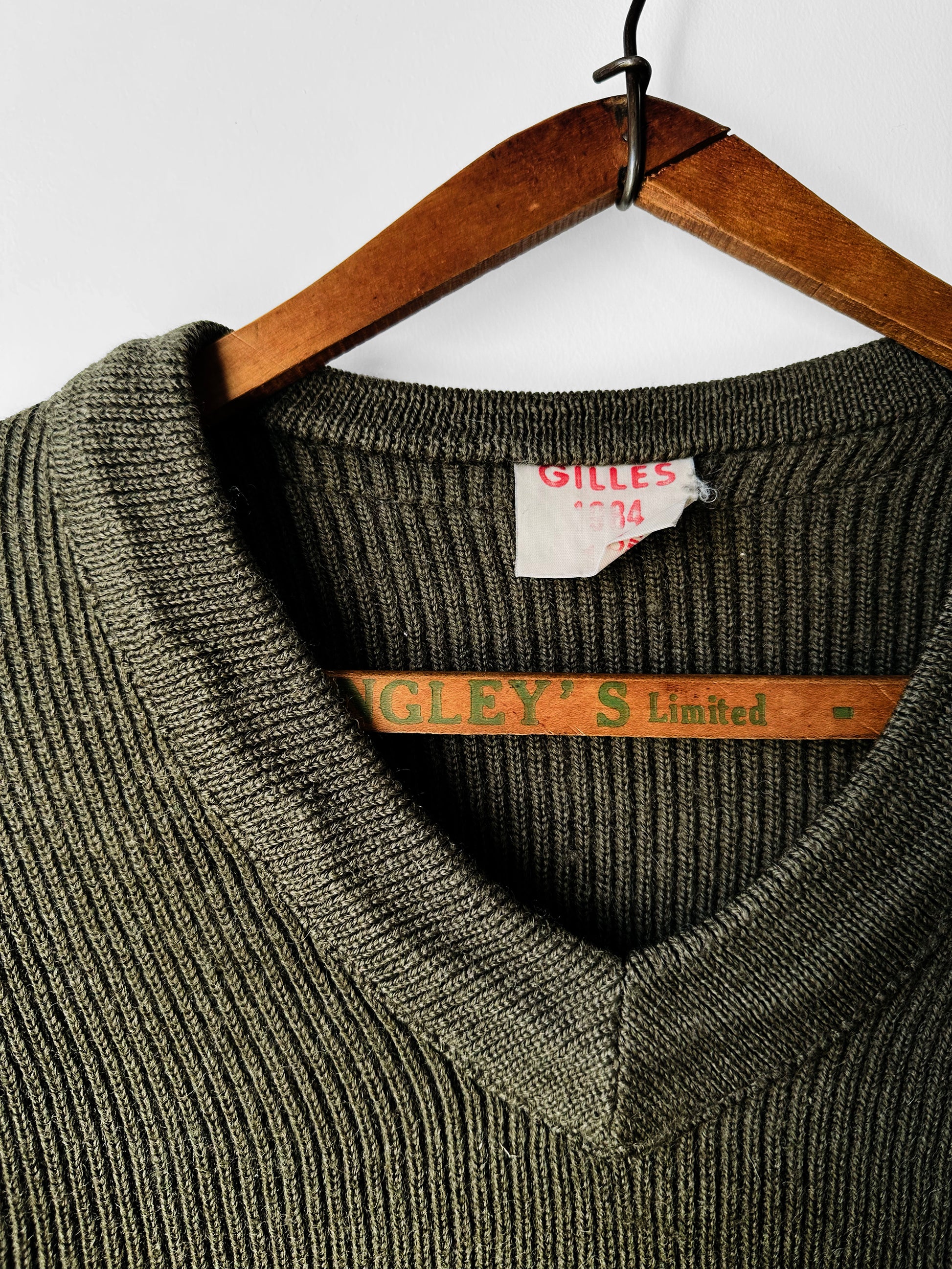 DESCRIPTION: Vintage 1984 French Military-Style Ribbed Wool V-Neck Sweater in classic olive green. Crafted from a tightly woven, soft wool blend, this piece offers a fitted silhouette with durability and comfort in mind. The ribbed knit design provides warmth and a subtle stretch, making it perfect for layering. Featuring the original “Gilles 1984” label, this sweater reflects high-true quality.