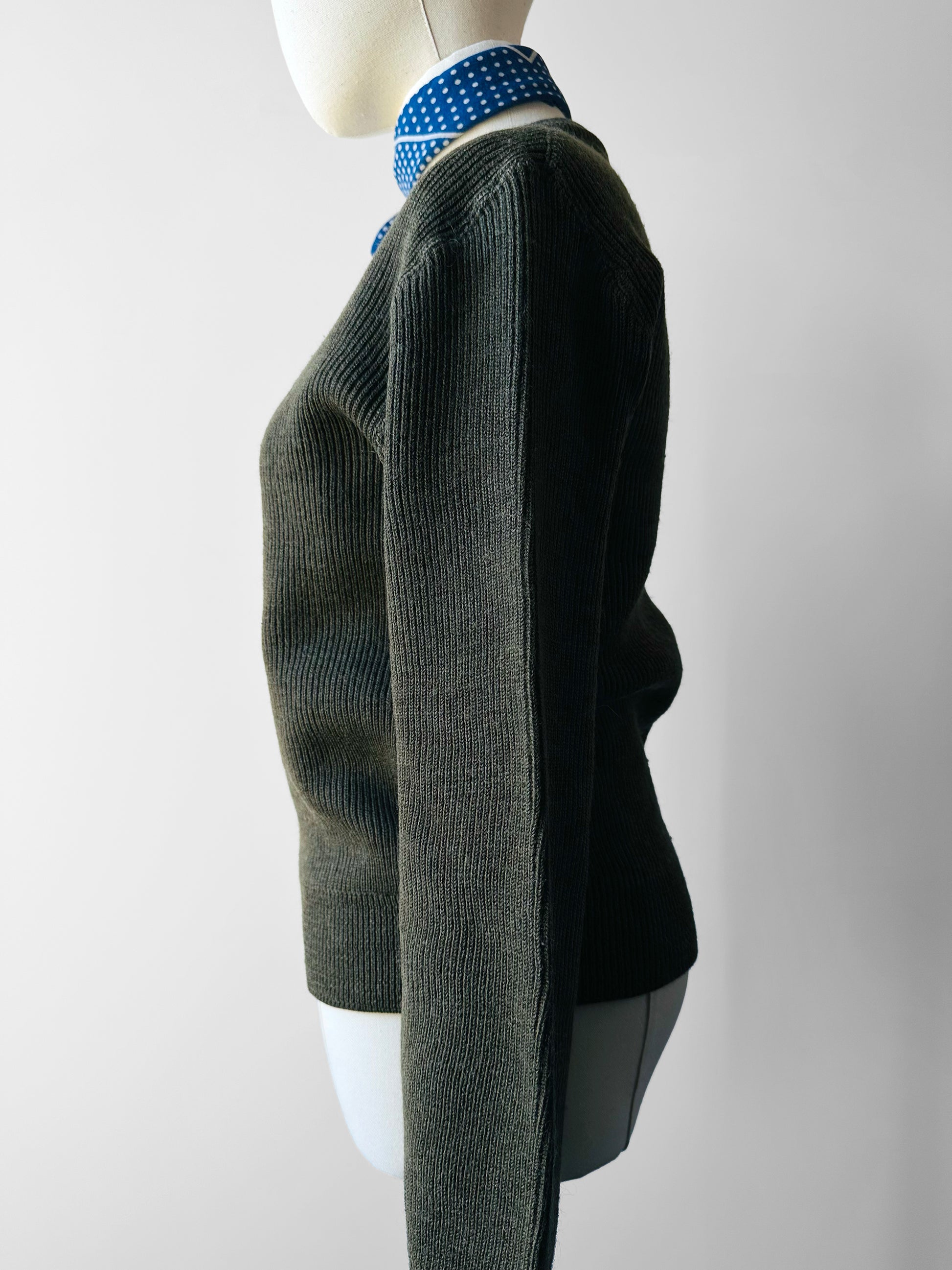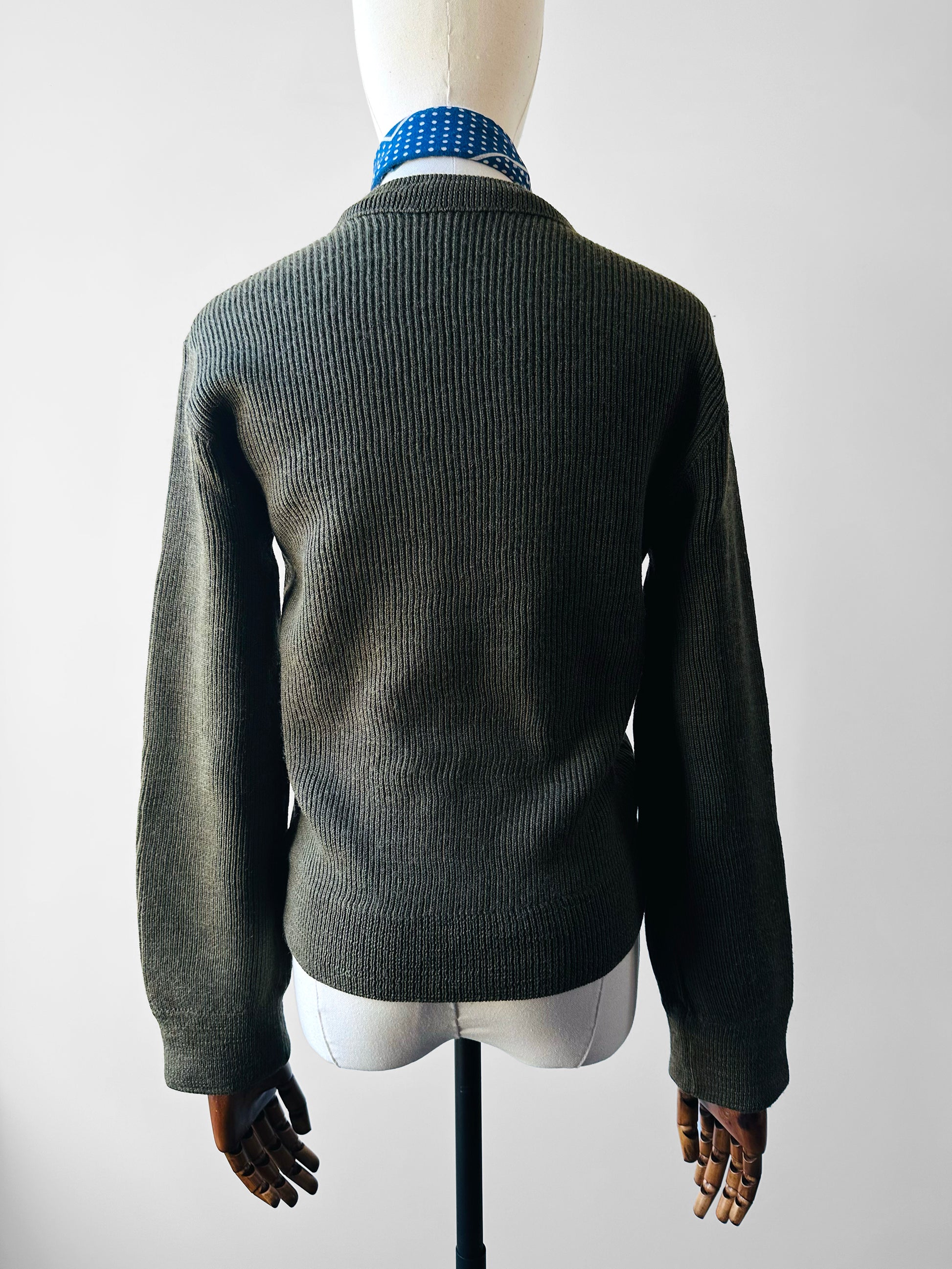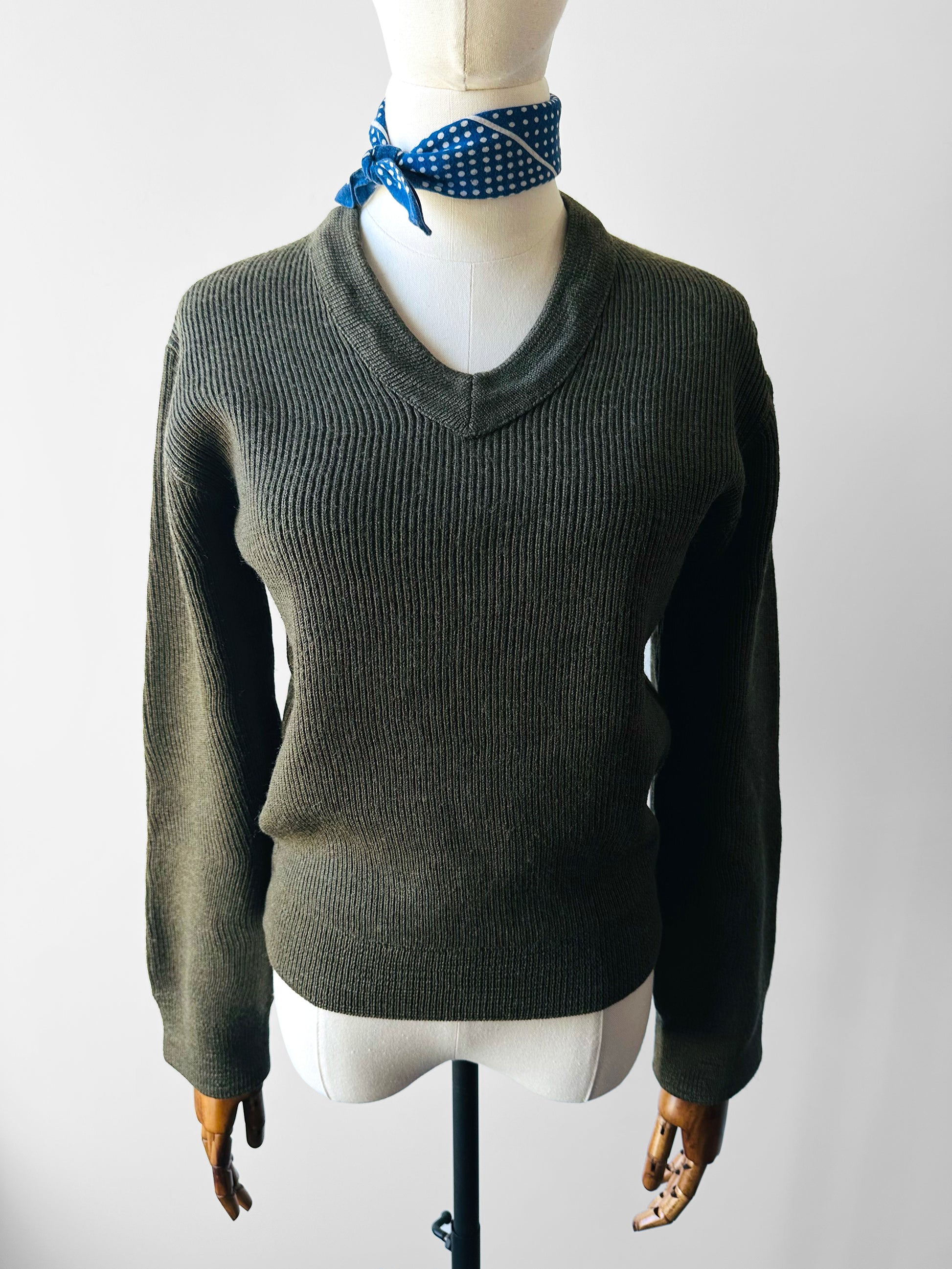 1980s French Military-Style Ribbed Wool Blended V-neck Sweater - Sz. Small